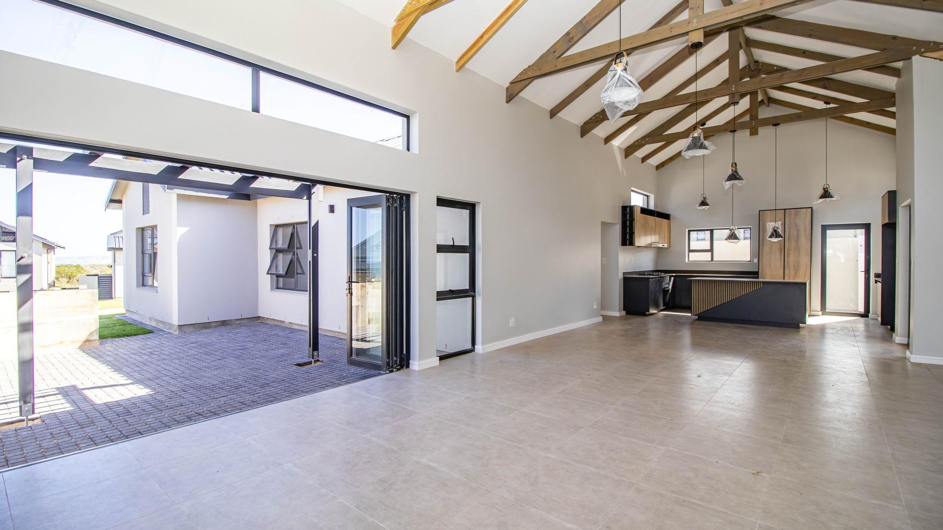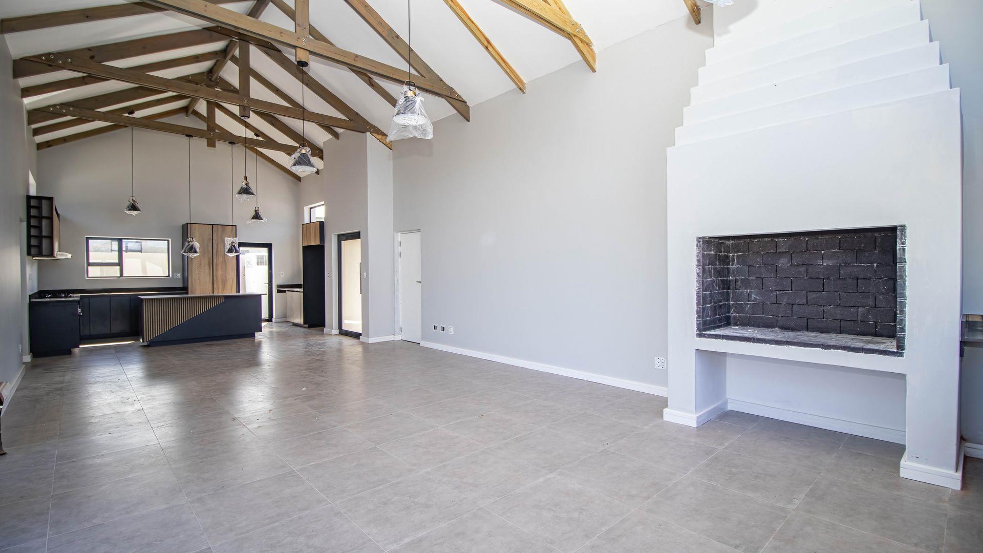 As you step inside, you'll be greeted by a spacious open-plan living room that boasts high ceilings with exposed beams, creating an airy and inviting atmosphere. The ample natural light floods the room, providing a warm and welcoming environment for family gatherings and entertainment. Stacker doors seamlessly extend your living space to the outdoors, leading to a charming braai boma, perfect for enjoying alfresco dining and the beautiful surroundings.