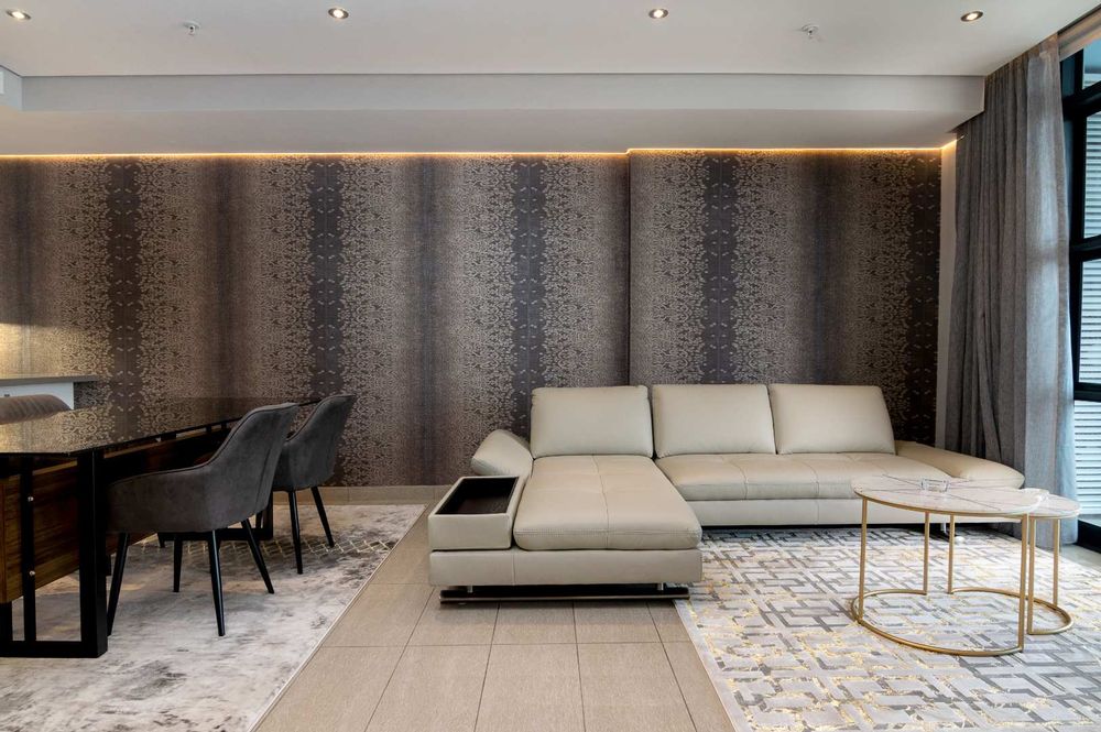 This fully furnished modern 2-bedroom 2-bathroom en-suite apartment in Pearl Sky at the affluent Pearls of Umhlanga® is available for immediate occupation. Bespoke wallpaper complements the contemporary finishes (Versace and Belgian woven Moooi by Designer House Atre.) The beds are storage beds with a flip-top base, and LeGrand LED downlighting has been fitted to lend atmosphere to the skylights that overlook the Indian ocean at night. The living room and master bedroom both have access to the balcony, which has breathtaking views of the coastline.