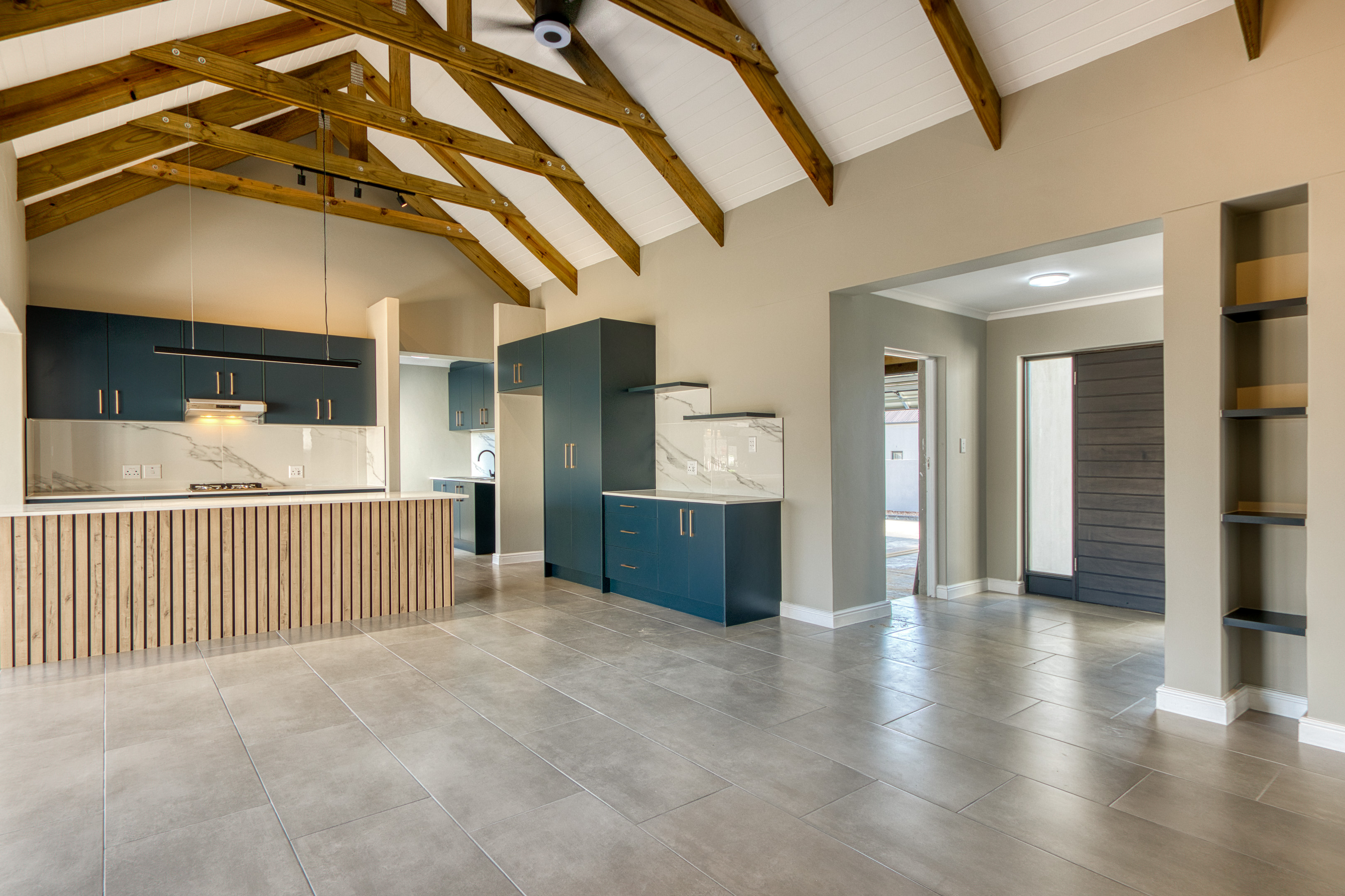 Upon entering, you'll be greeted by a generous open-plan living and dining area, accentuated by stylish exposed trusses that enhance the room’s spaciousness and charm. The contemporary kitchen is both practical and sophisticated, equipped with abundant cupboard space, a gas stove, and an electric oven, seamlessly connecting to the living area – ideal for entertaining guests or enjoying family time.