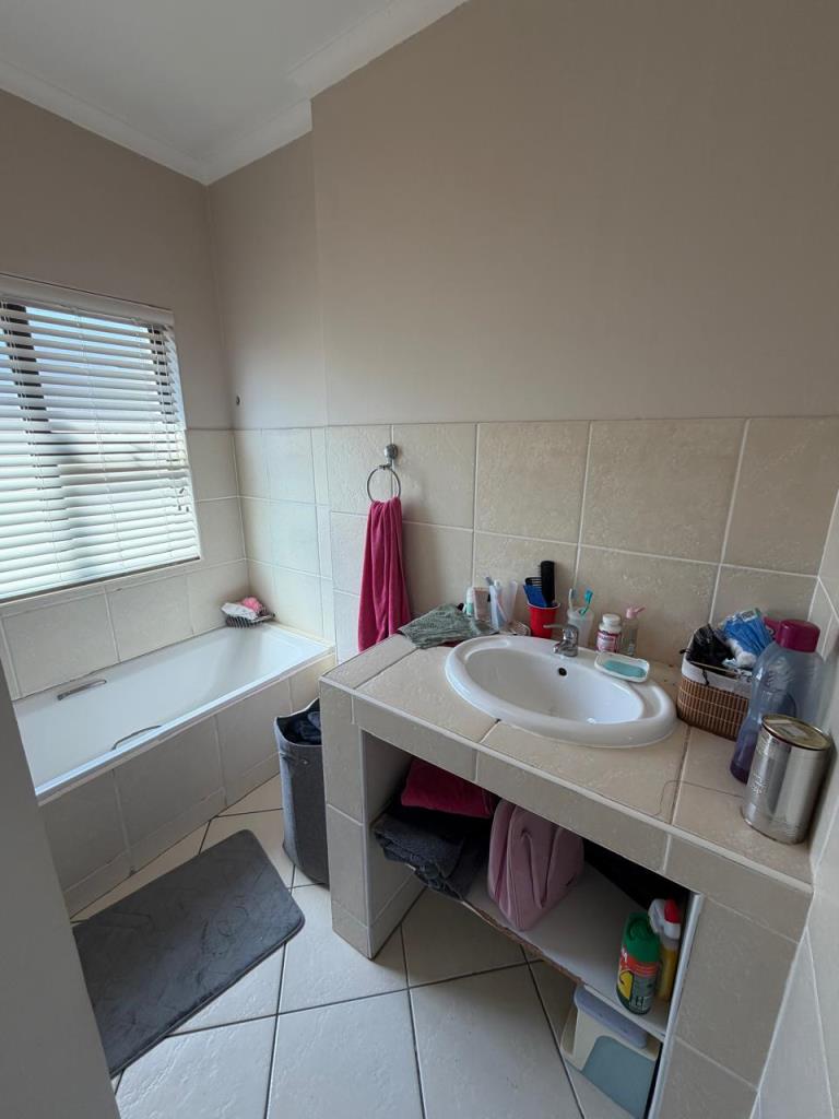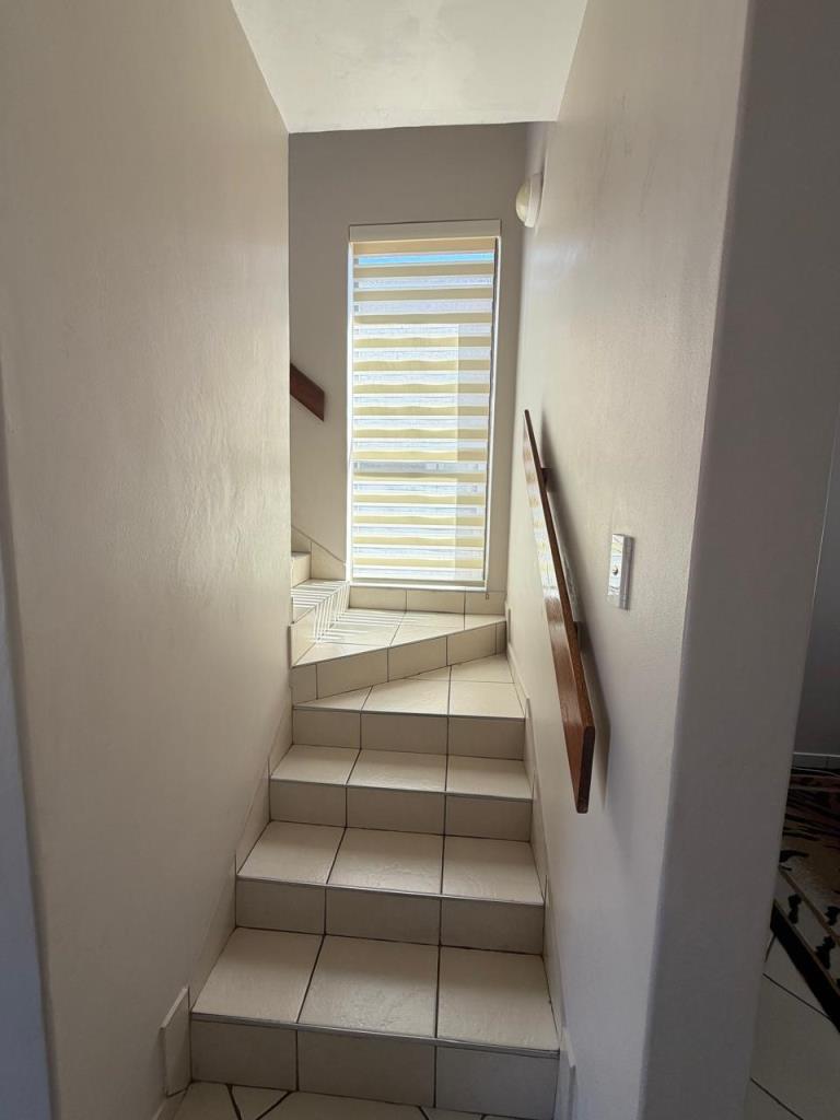 Upstairs, the staircase is bathed in natural light from a large window, creating a bright and inviting atmosphere. The generous master bedroom offers ample built-in cupboards and a private en-suite bathroom complete with a bath-perfect for unwinding after a long day. Two additional well-sized bedrooms, both with built-in cupboards, provide comfortable space for children or guests. The main bathroom includes a shower, toilet, and basin.