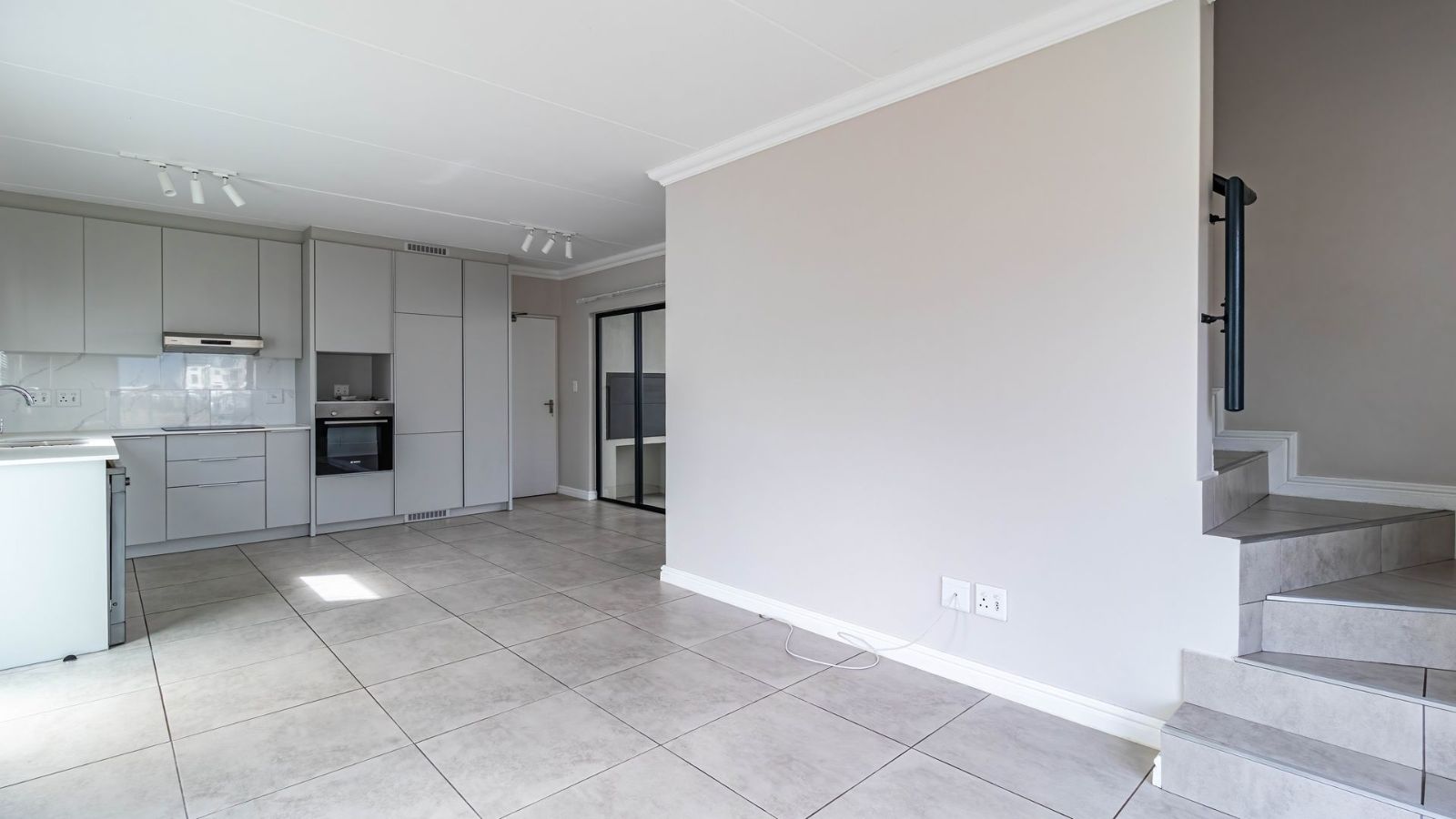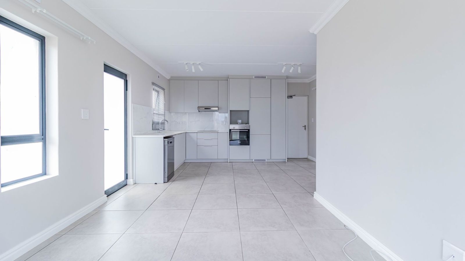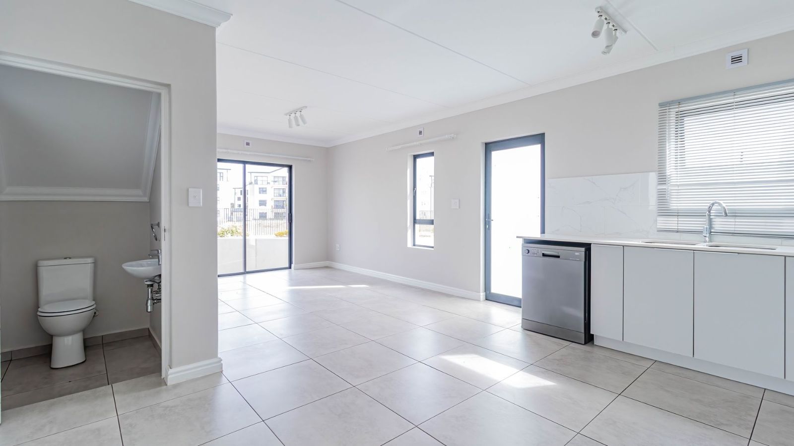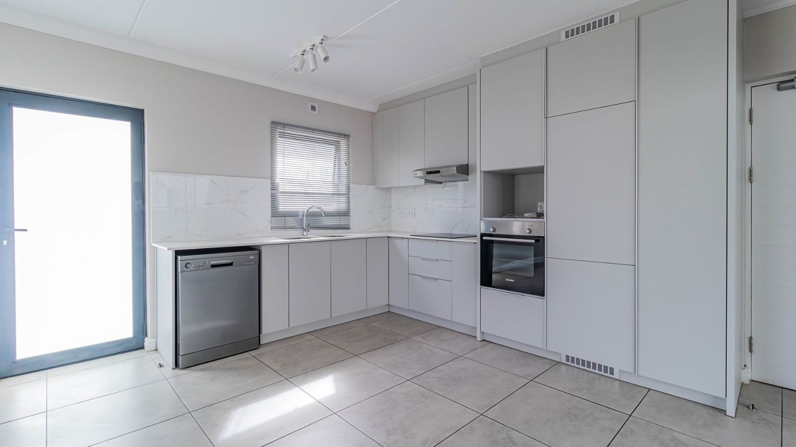 The spacious open-plan kitchen, dining, and lounge area flows seamlessly onto a semi-covered patio and into a private, landscaped garden—ideal for relaxed indoor-outdoor living. The sleek, modern kitchen features an electric hob, extractor fan and oven, and includes premium Bosch appliances such as the fitted refrigerator.