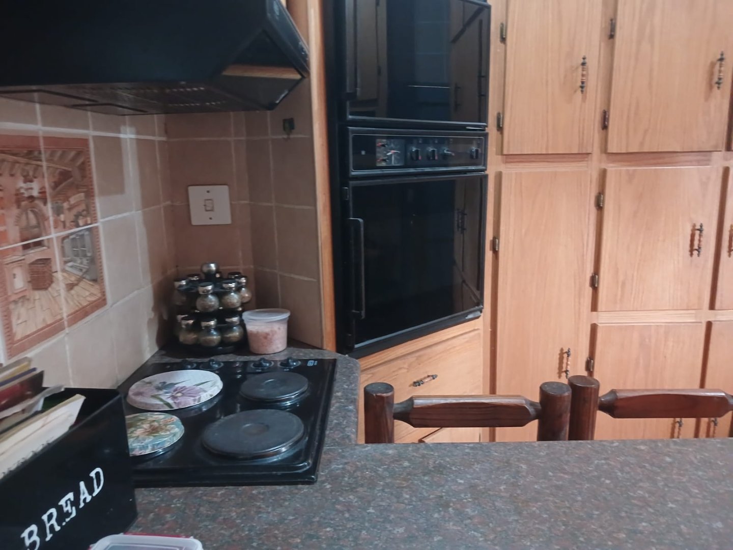 The main house features three generously sized bedrooms, with the master suite boasting an ensuite bathroom and built-in cupboards. The open-plan living and dining area creates a warm and welcoming space, while the well-equipped kitchen includes built-in cupboards and a stove. A double garage with an electric door provides secure parking and convenience.