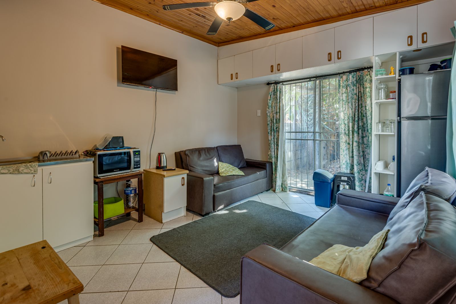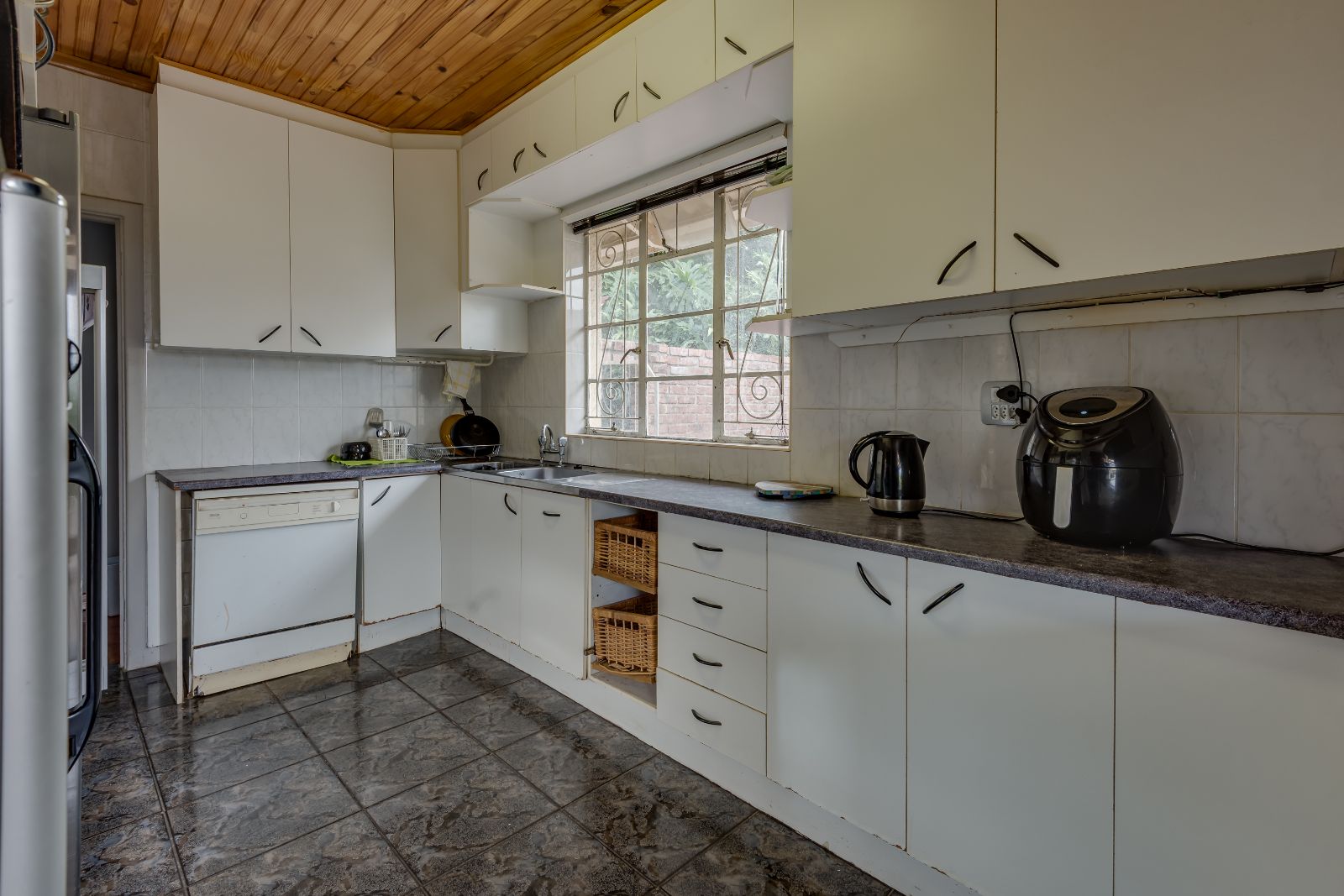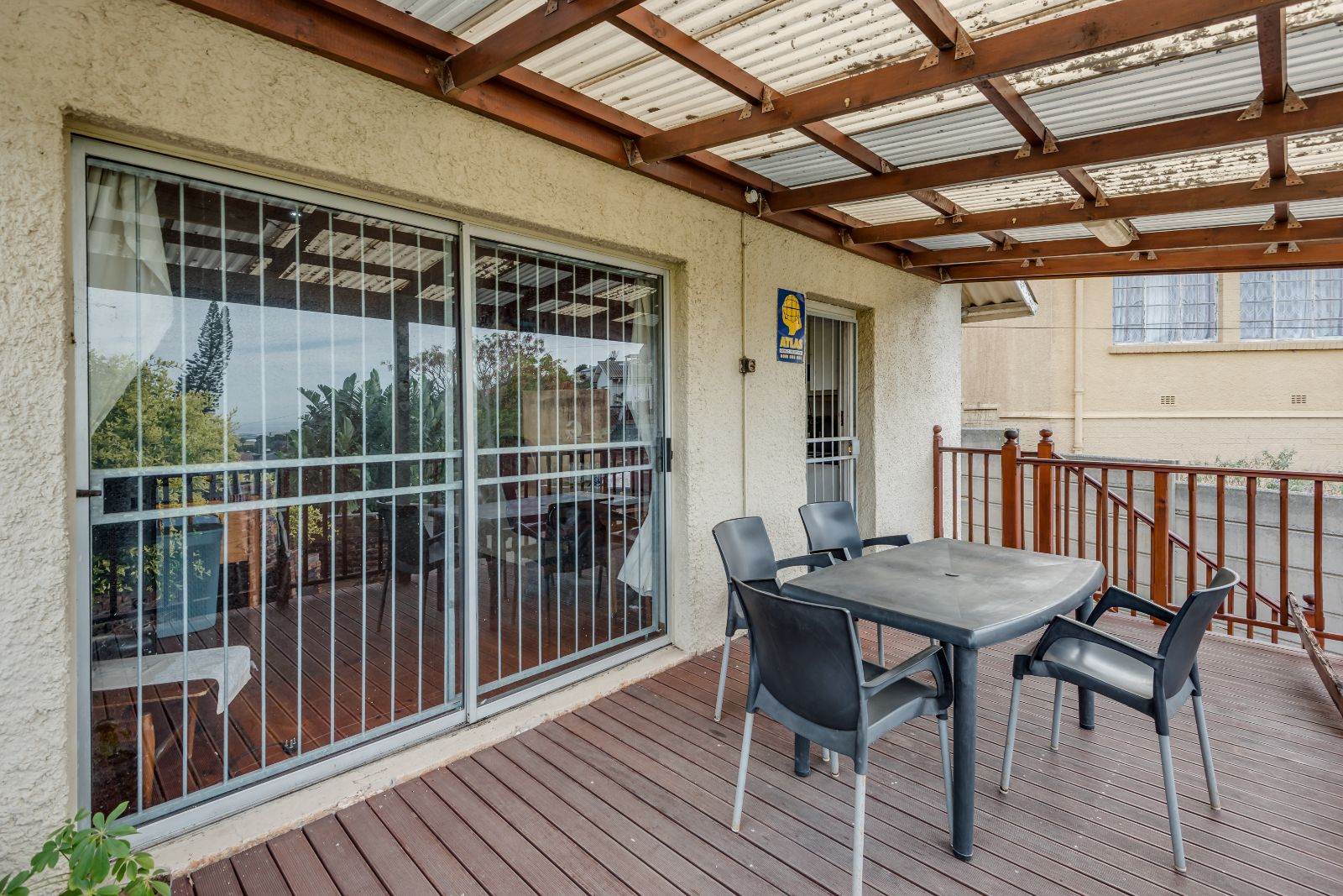 The dining room flows seamlessly into the lounge area, creating a light and adaptable living space. The kitchen offers ample cupboard space and opens onto a covered deck, with steps leading down to a private garden and built-in braai area, perfect for entertaining.