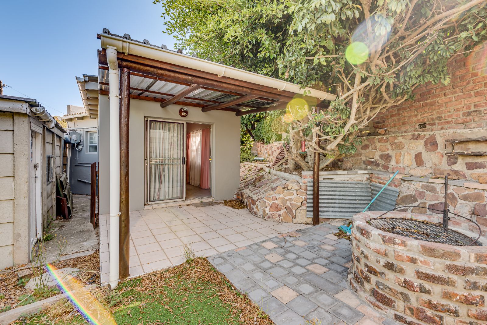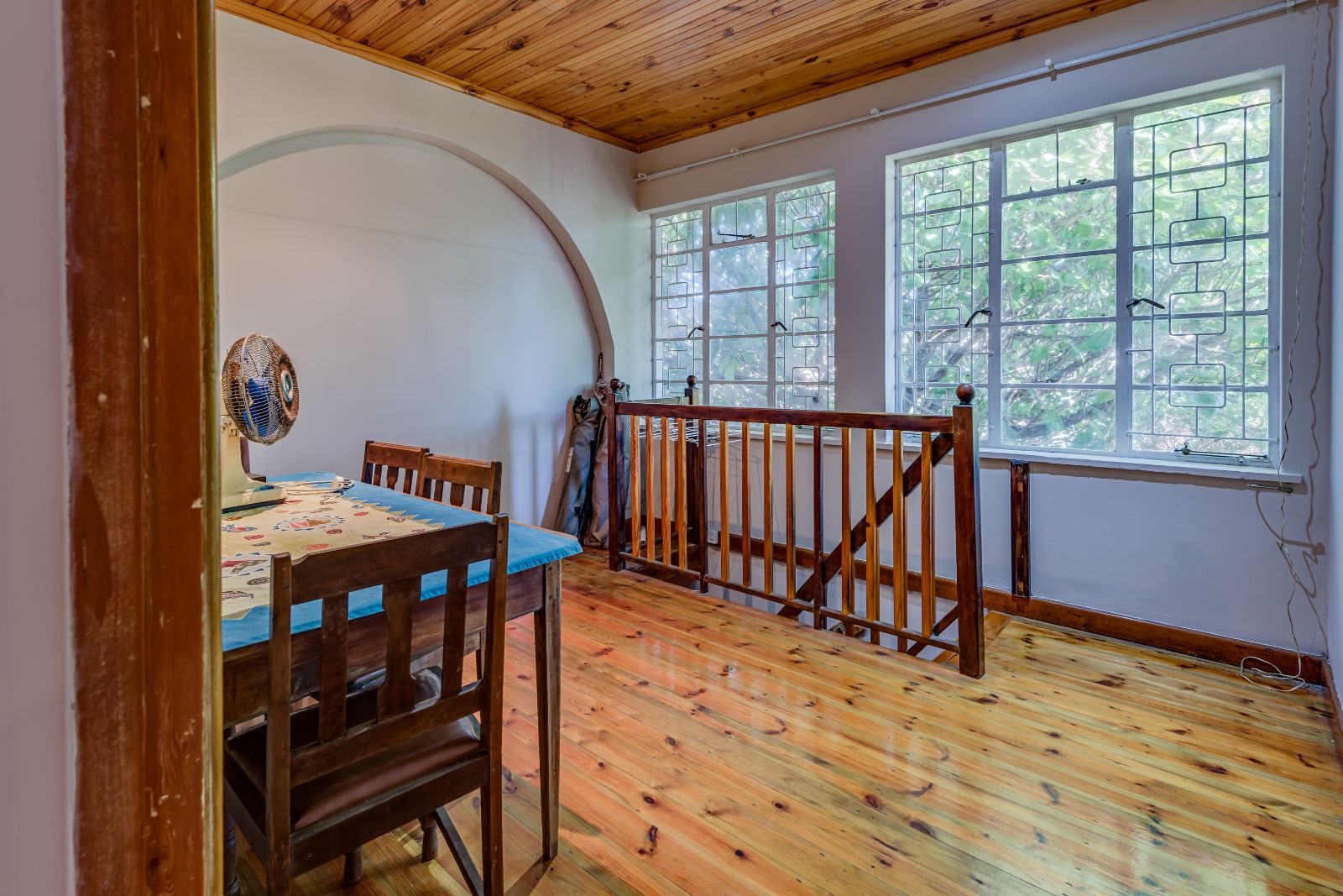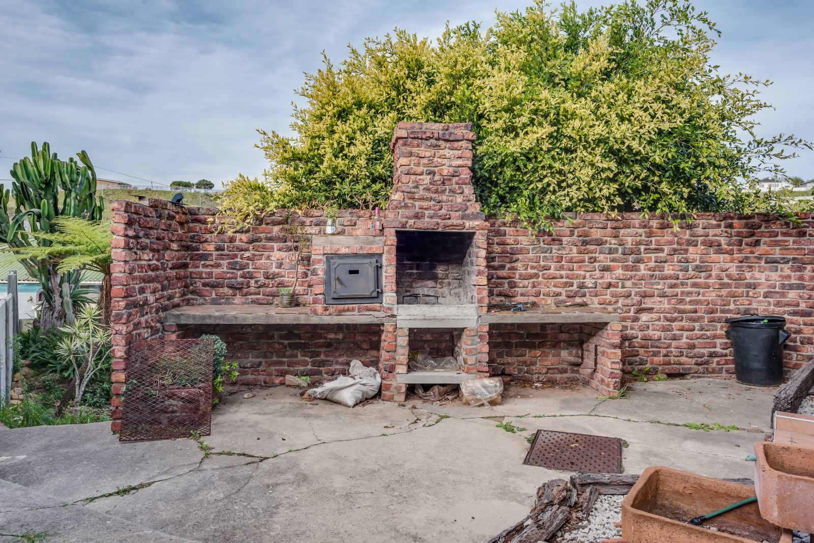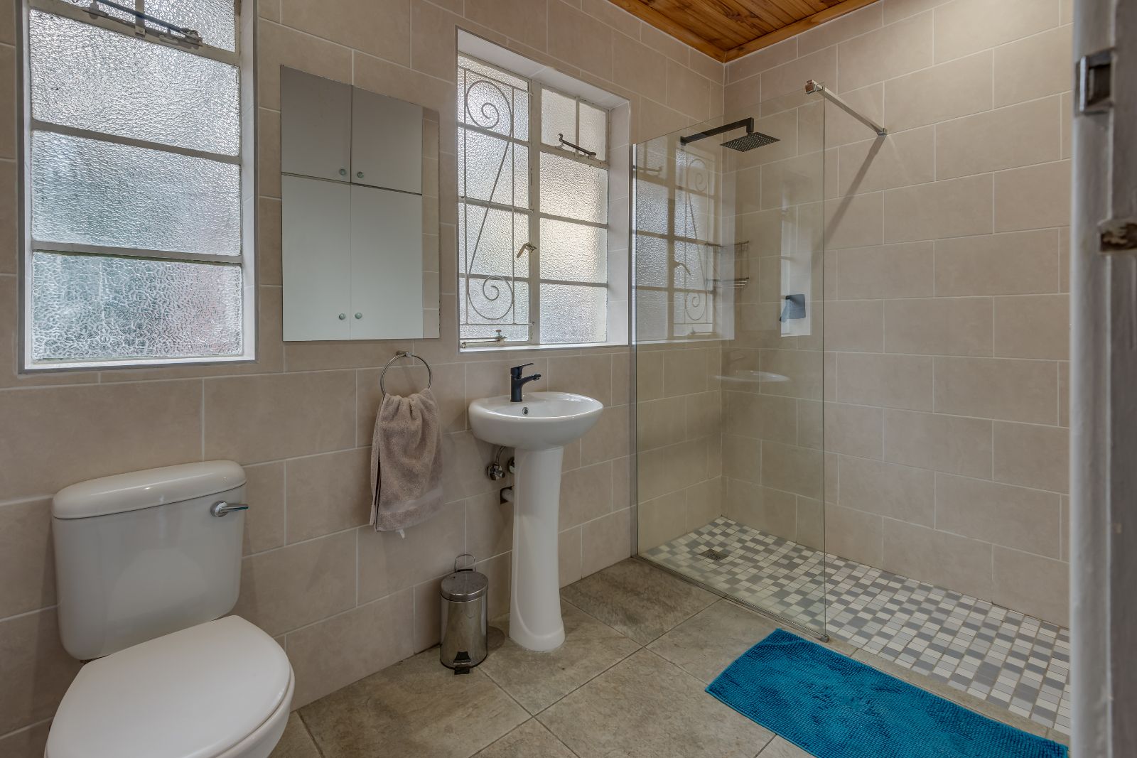 The dining room flows seamlessly into the lounge area, creating a light and adaptable living space. The kitchen offers ample cupboard space and opens onto a covered deck, with steps leading down to a private garden and built-in braai area, perfect for entertaining.