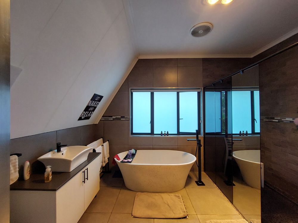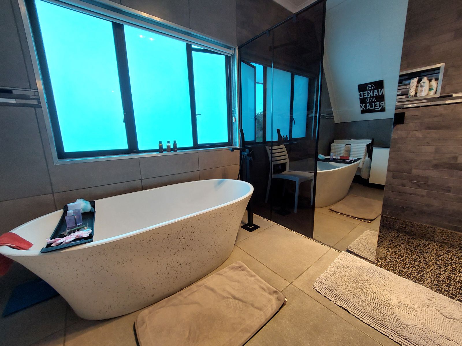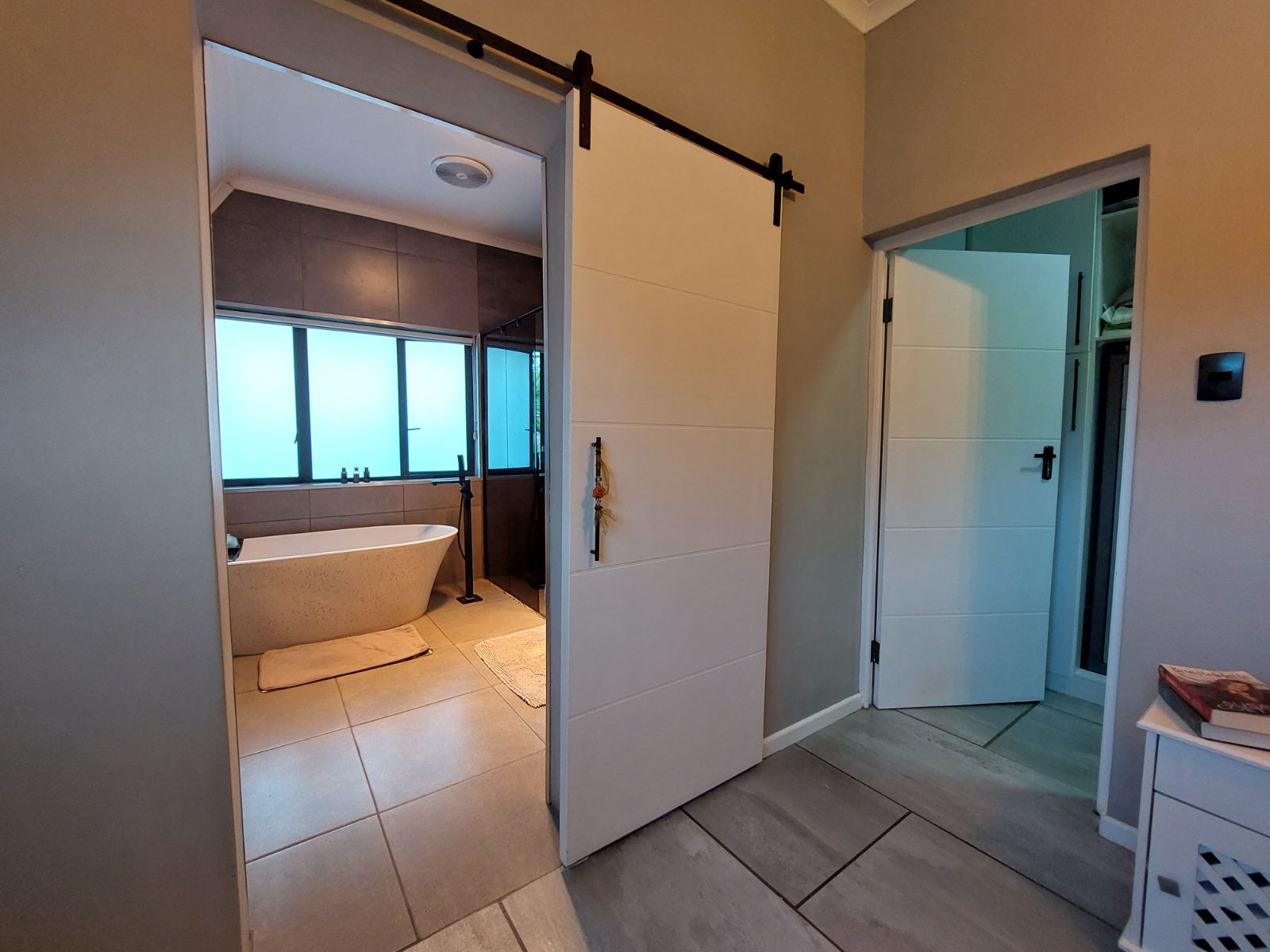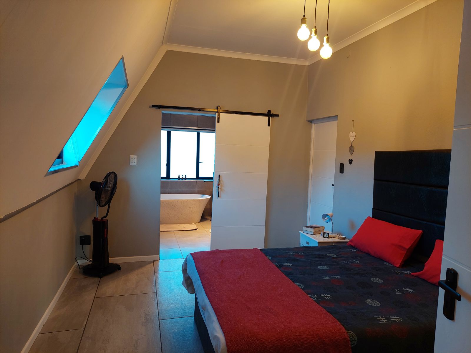 A luxurious ground-floor main bedroom, complete with on-suite bathroom, walk-in closet, and a stoep with breath taking views of the majestic Spandaukop at sunset.