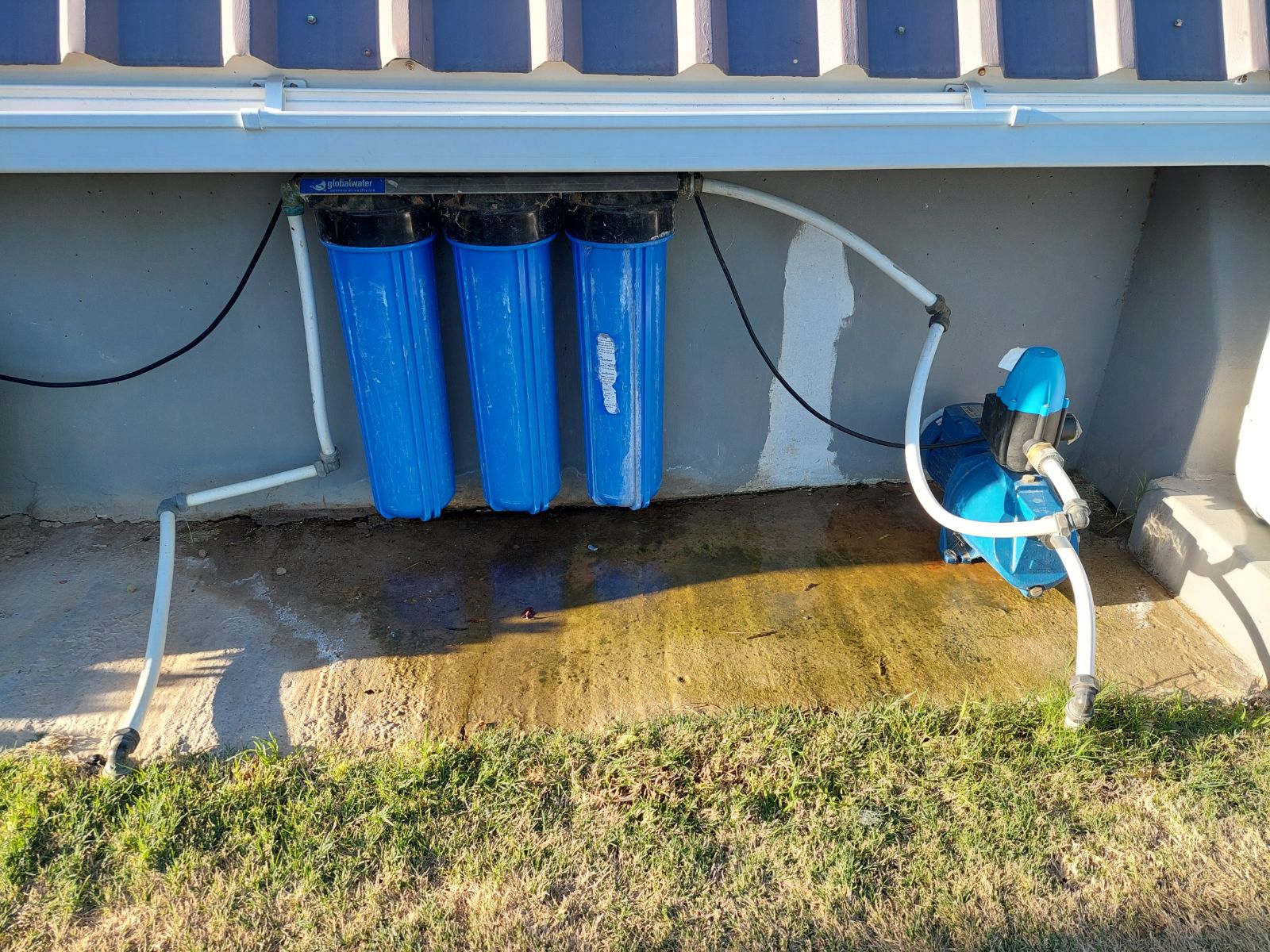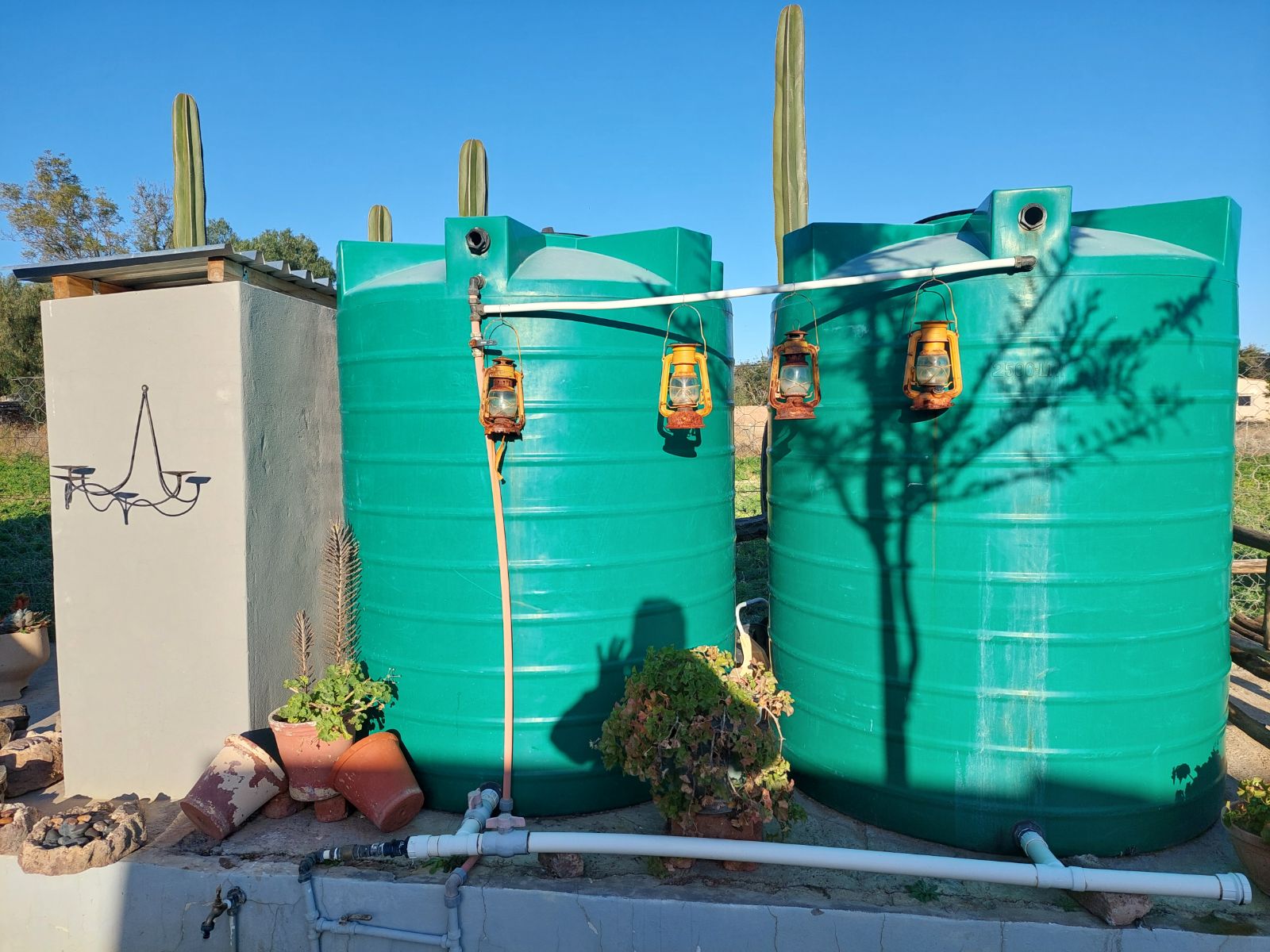 Separate storage building, borehole, water filtration system, and high-pressure pump connected to water tanks – reliable and efficient.
