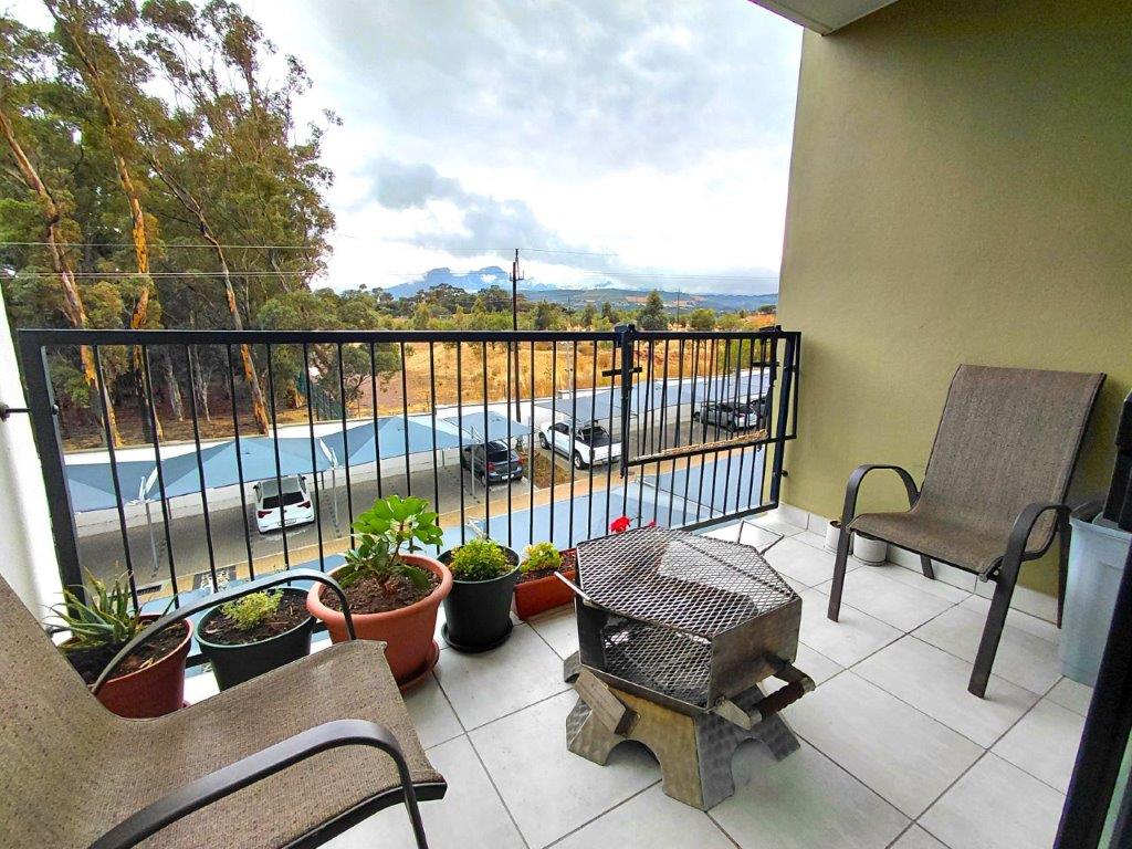 The open-plan living area flows into a modern, fully fitted kitchen and out to a private balcony with afternoon sun, overlooking trees and mountains