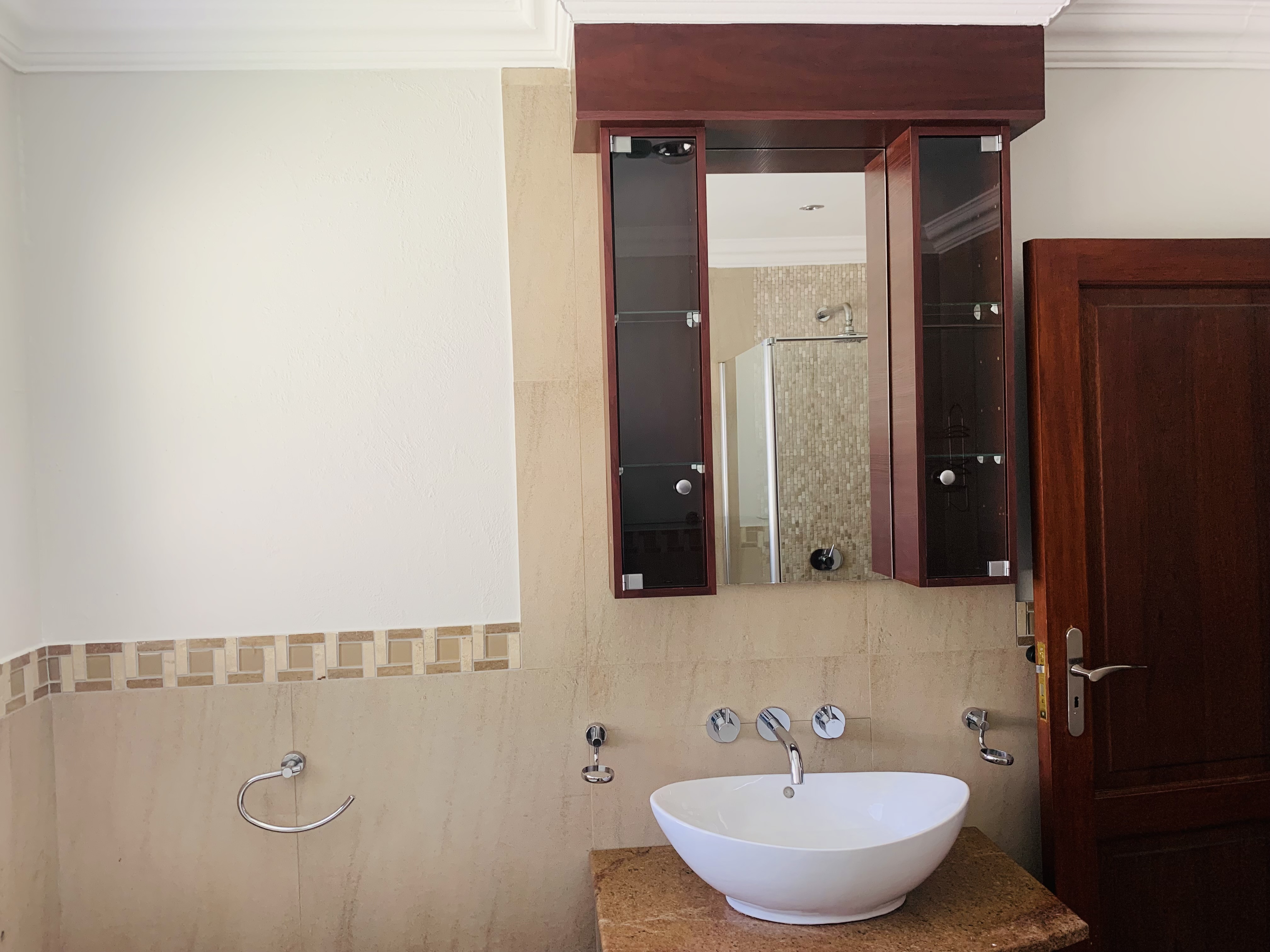 There are 3 well sized bedrooms, all with built in cupboards and air conditioners. The main bedroom is en-suite with a bath and separate shower. The main bathroom has a bath and separate shower for the 2 bedrooms to share.