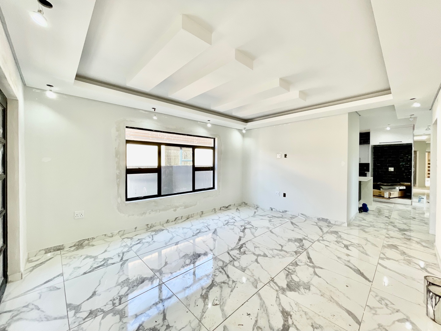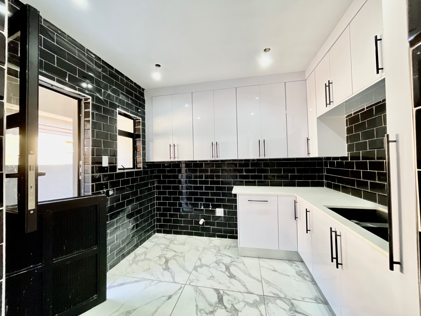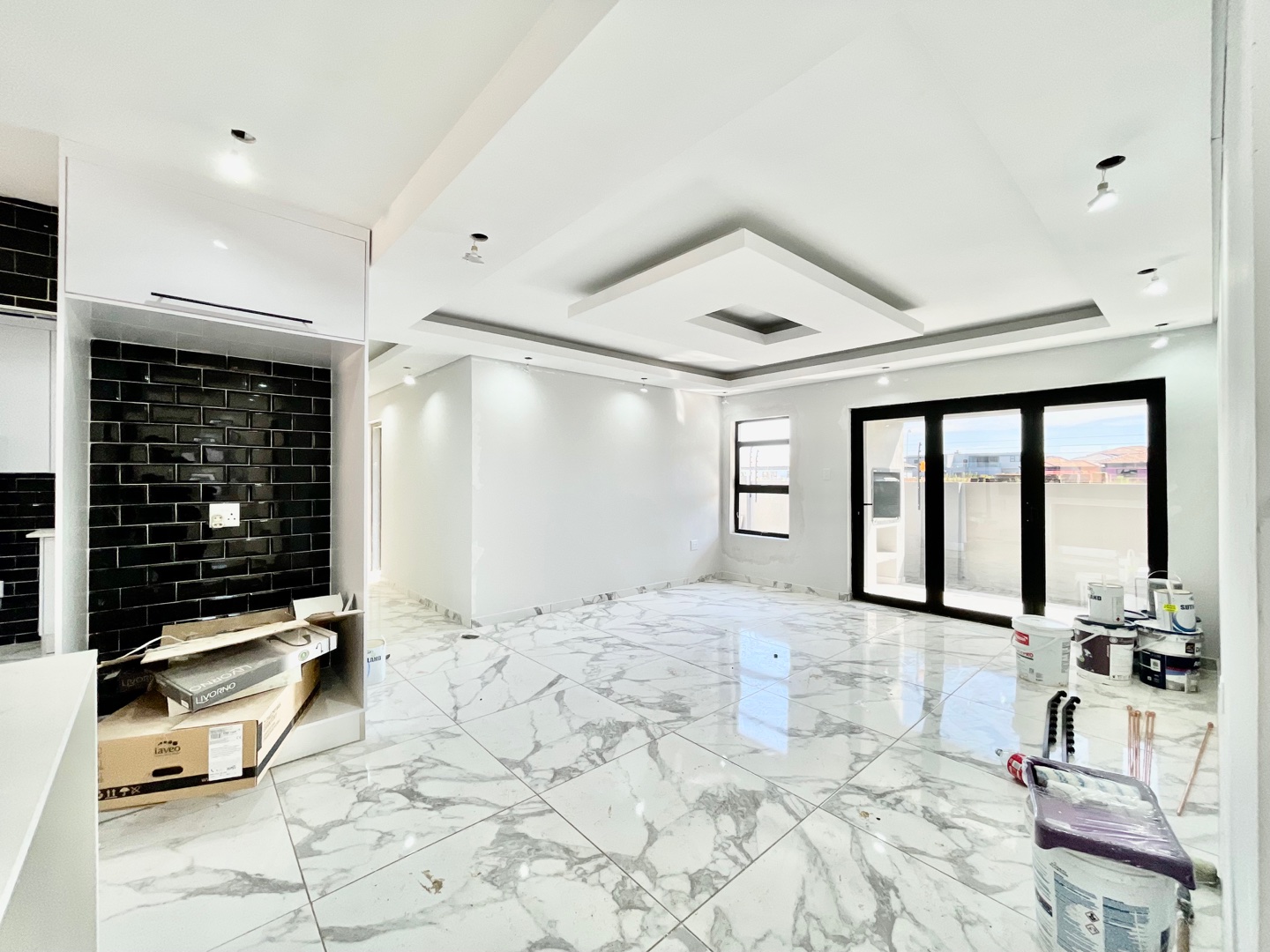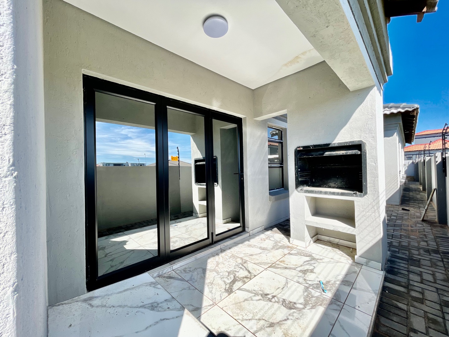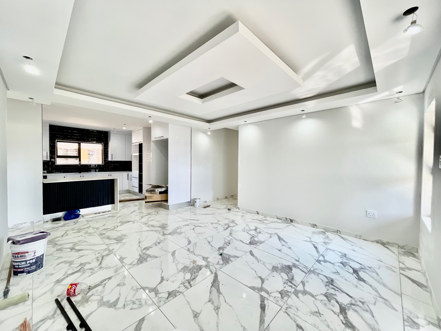 Step inside to discover a cozy yet spacious open-plan living area, seamlessly connecting a glossy modern kitchen, featuring tasteful finishes to the dining area and lounge. Natural light floods in, creating a welcoming atmosphere, perfect for relaxation or entertaining guests through folding doors to a patio with a braai