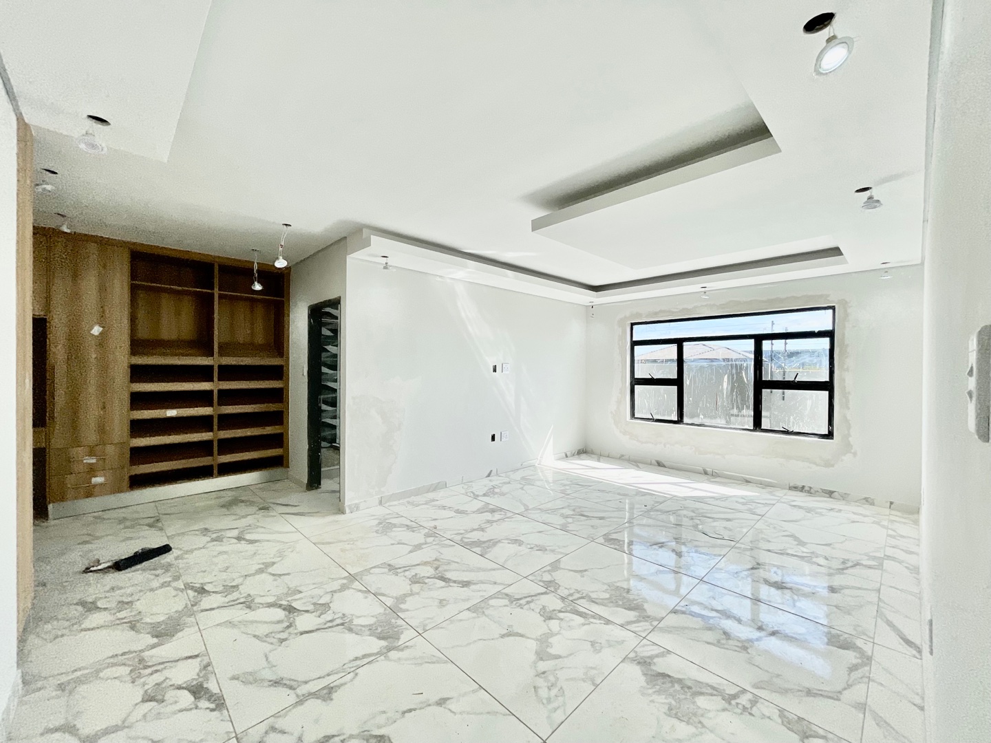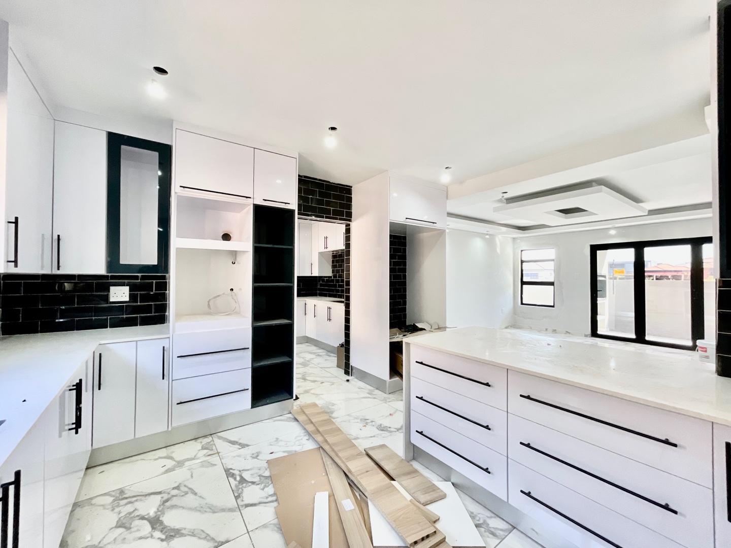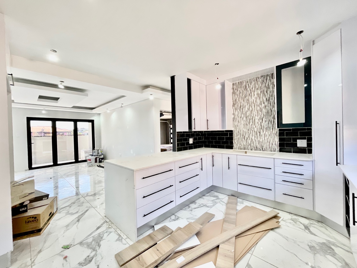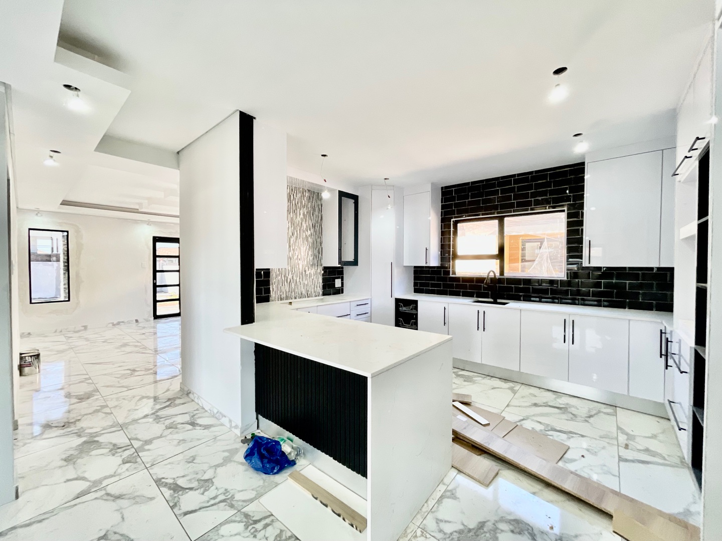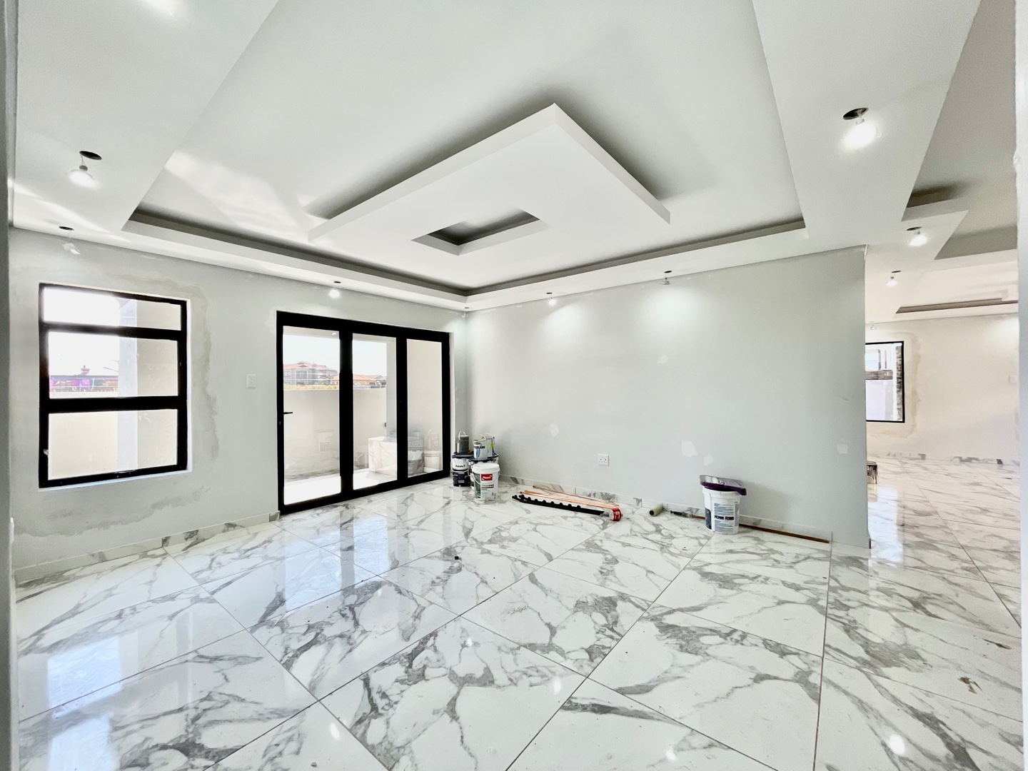 Step inside to discover a cozy yet spacious open-plan living area, seamlessly connecting a glossy modern kitchen, featuring tasteful finishes to the dining area and lounge. Natural light floods in, creating a welcoming atmosphere, perfect for relaxation or entertaining guests through folding doors to a patio with a braai