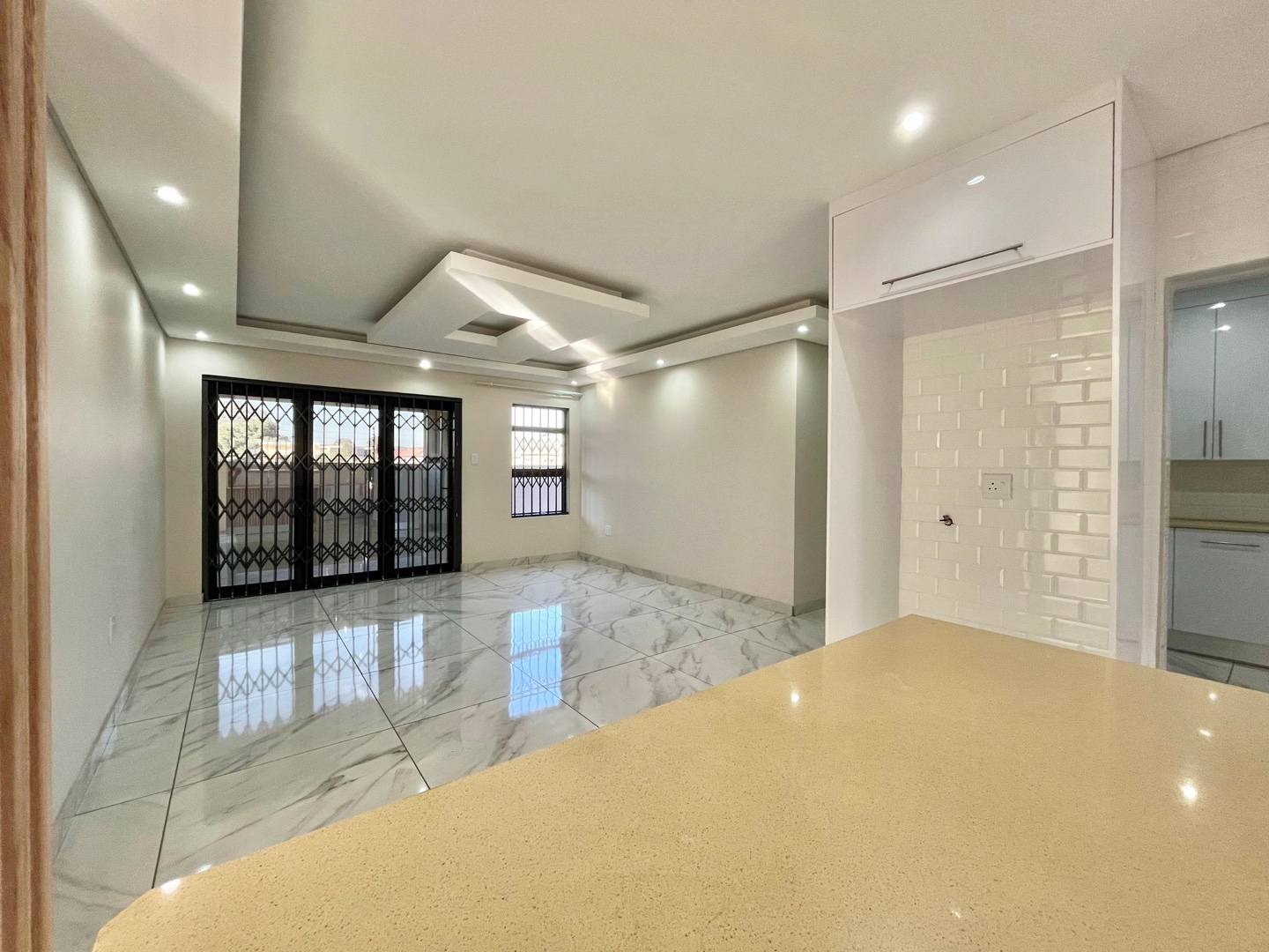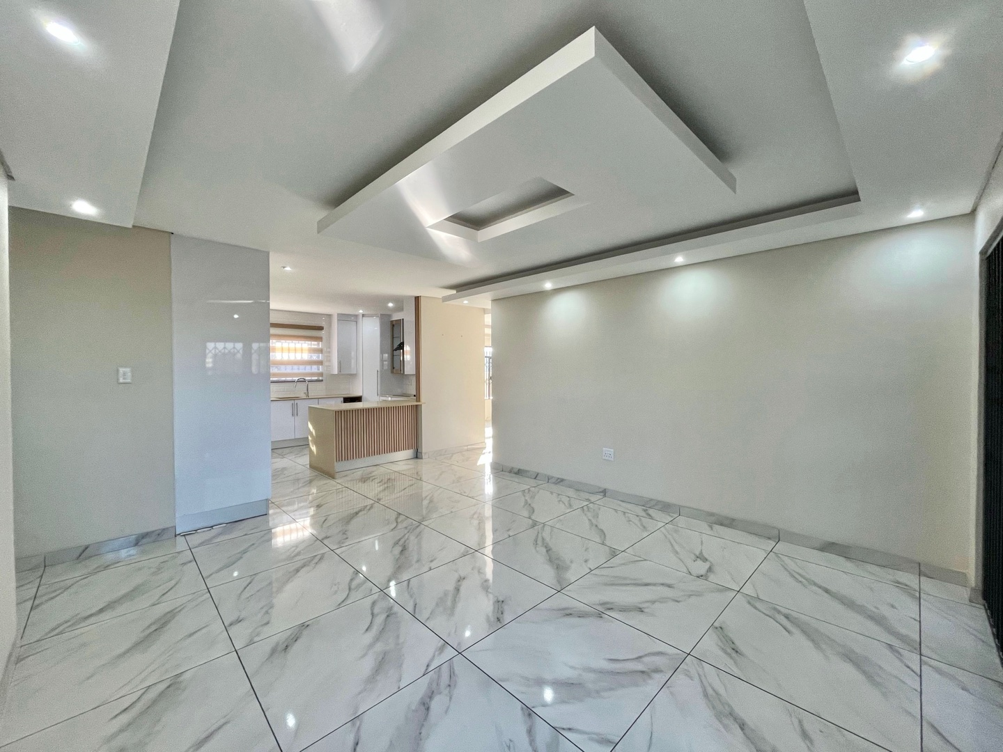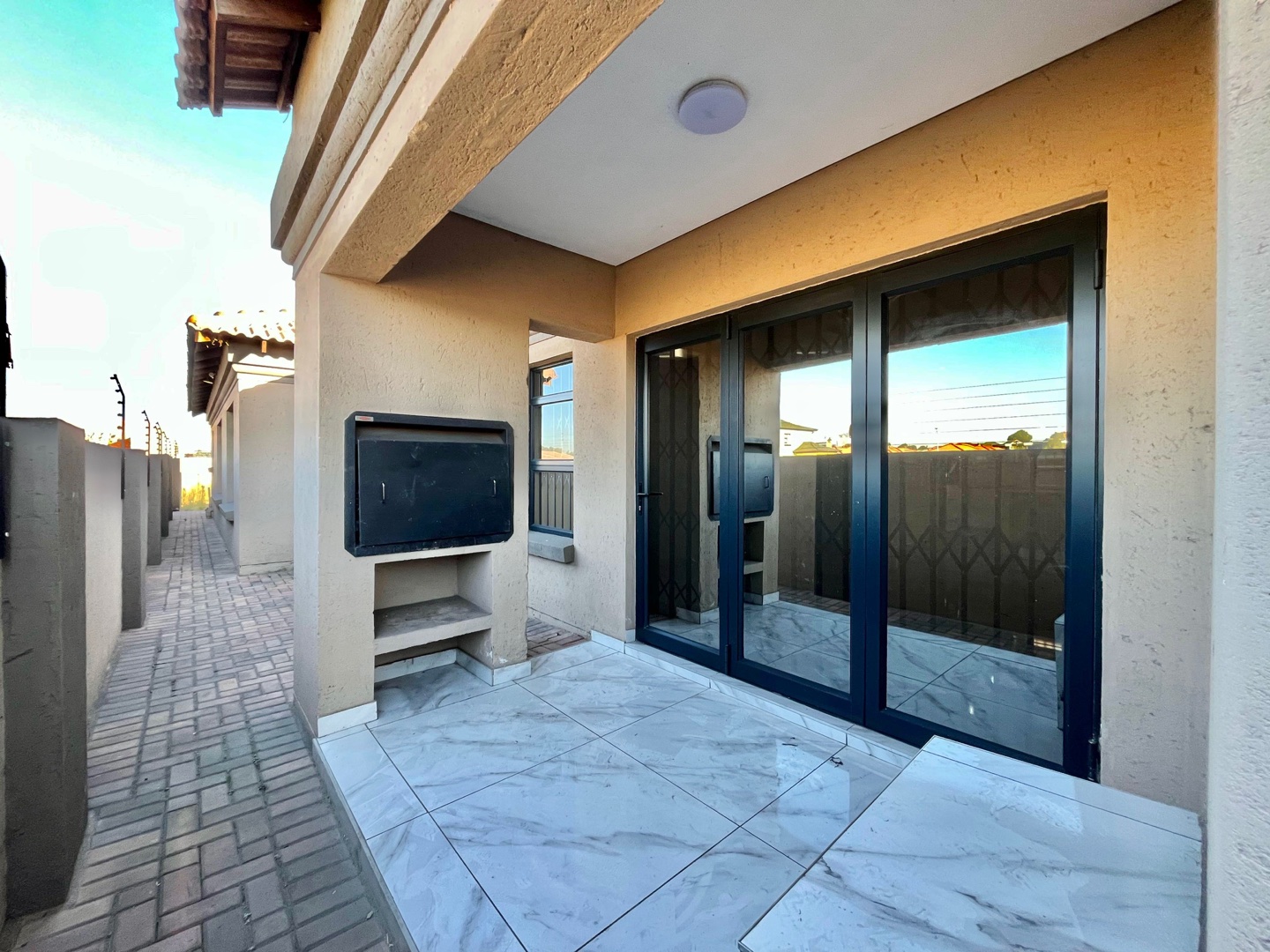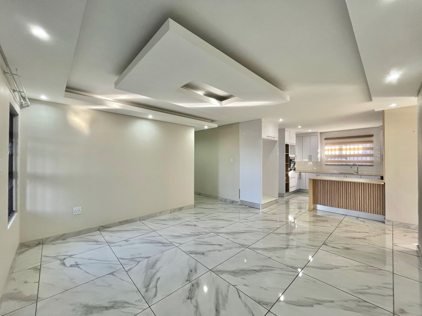 Step inside to discover a cozy yet spacious open-plan living area, seamlessly connecting a glossy modern kitchen, featuring tasteful finishes to the dining area and lounge. Natural light floods in, creating a welcoming atmosphere, perfect for relaxation or entertaining guests through folding doors to a patio with a braai