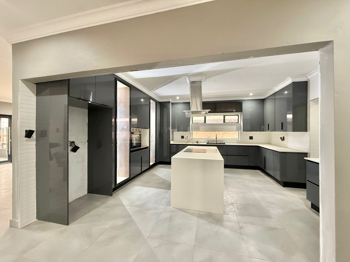 • A sleek, modern glossy-finish kitchen with ample cabinetry, quality countertops, and a separate scullery for added convenience.