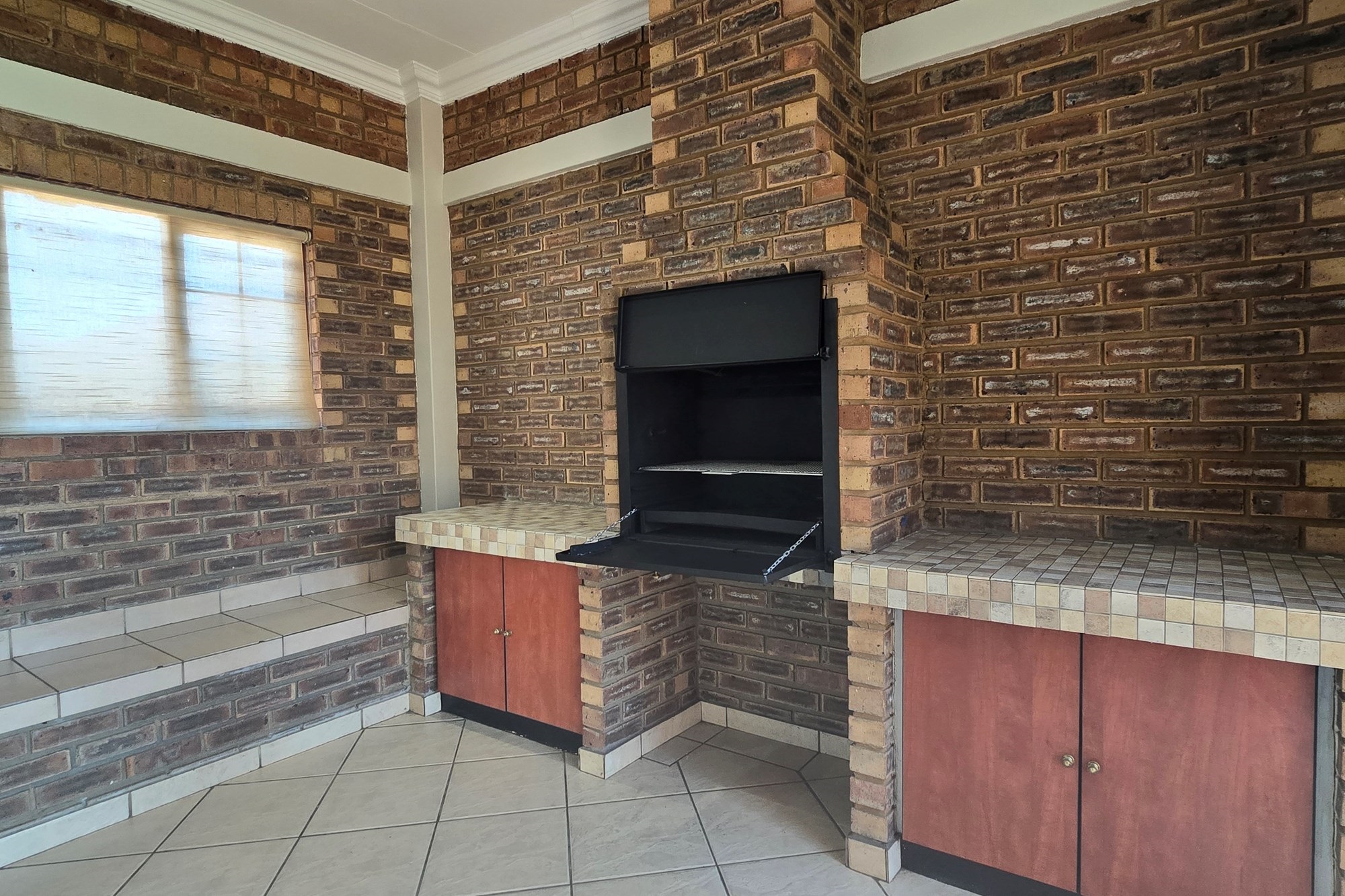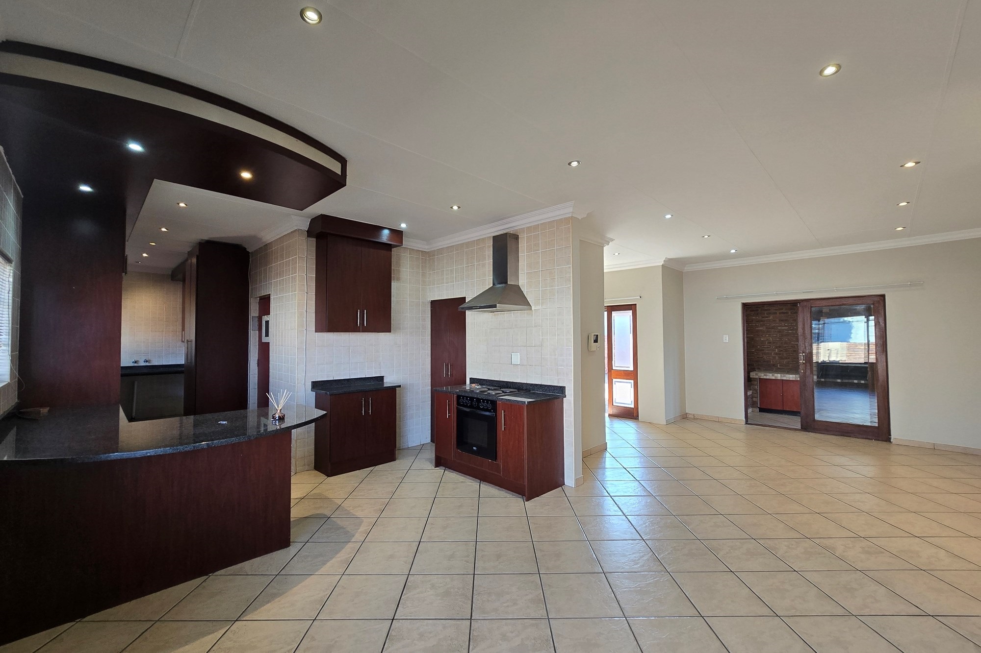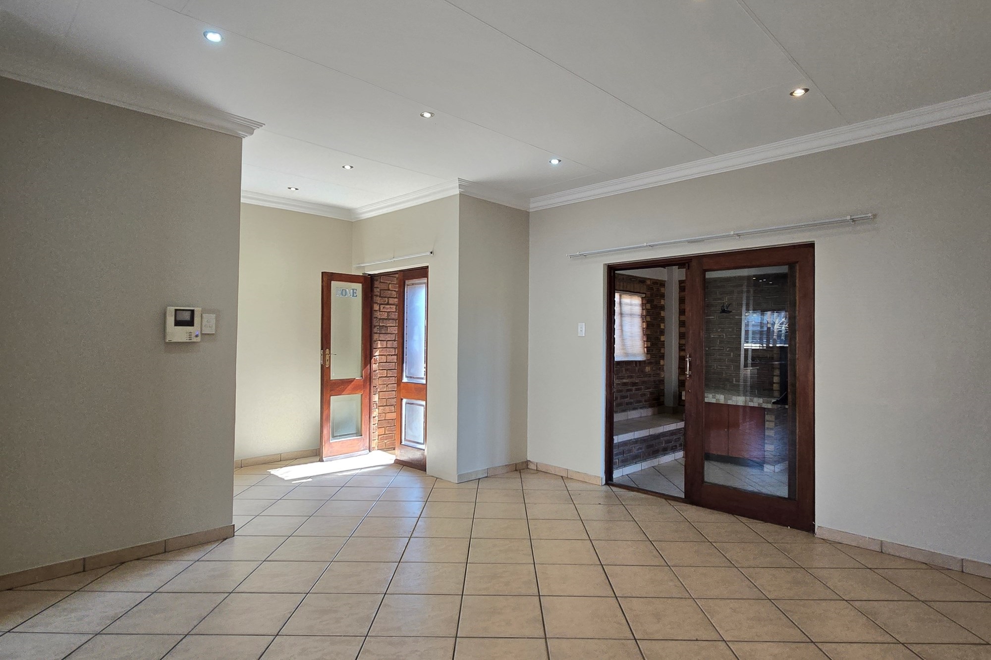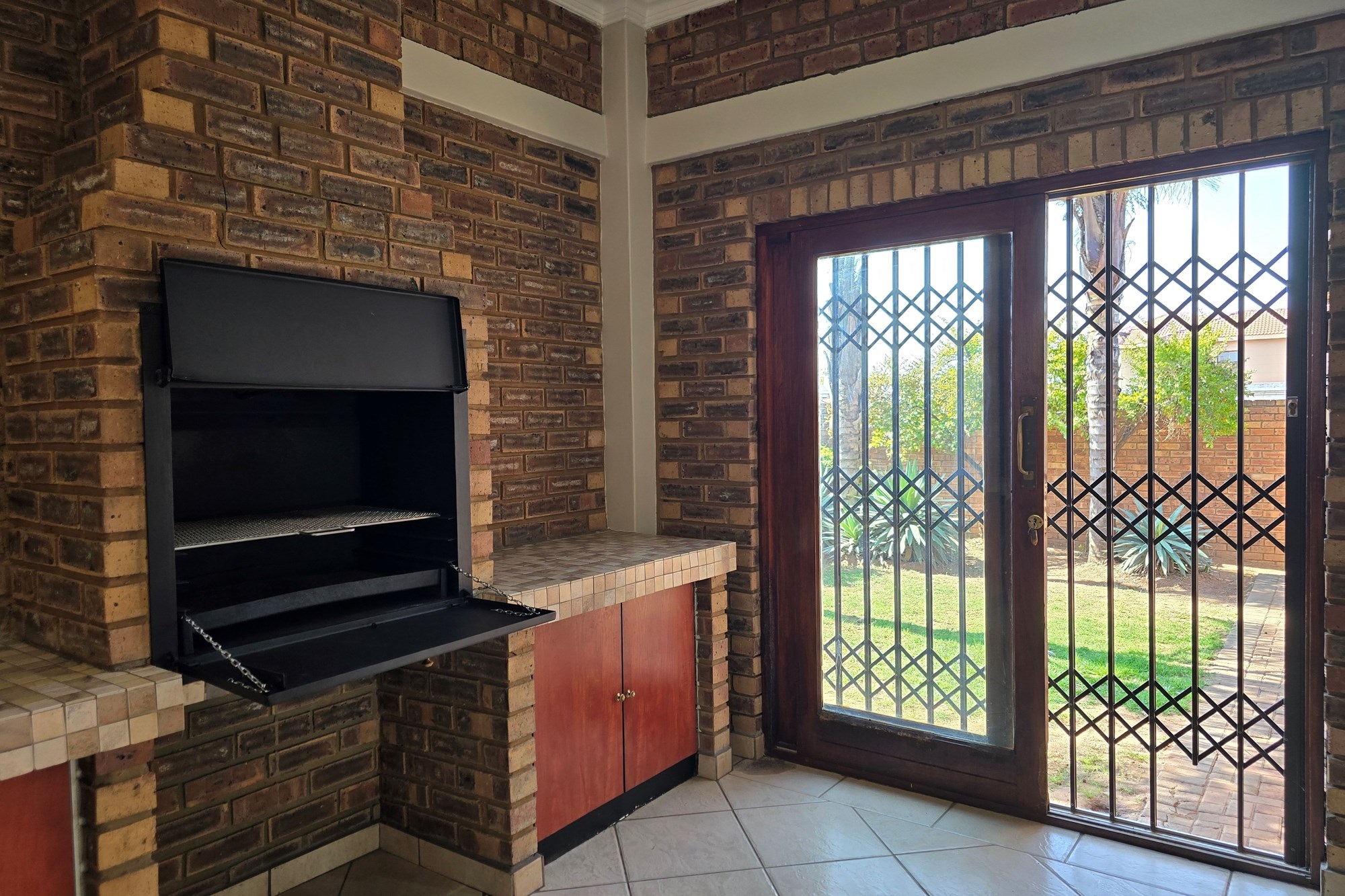 Double wooden doors lead you out to an enclosed patio with built-in braai and sliding doors opening to the garden – the perfect space for weekend entertaining or peaceful mornings with coffee in hand.