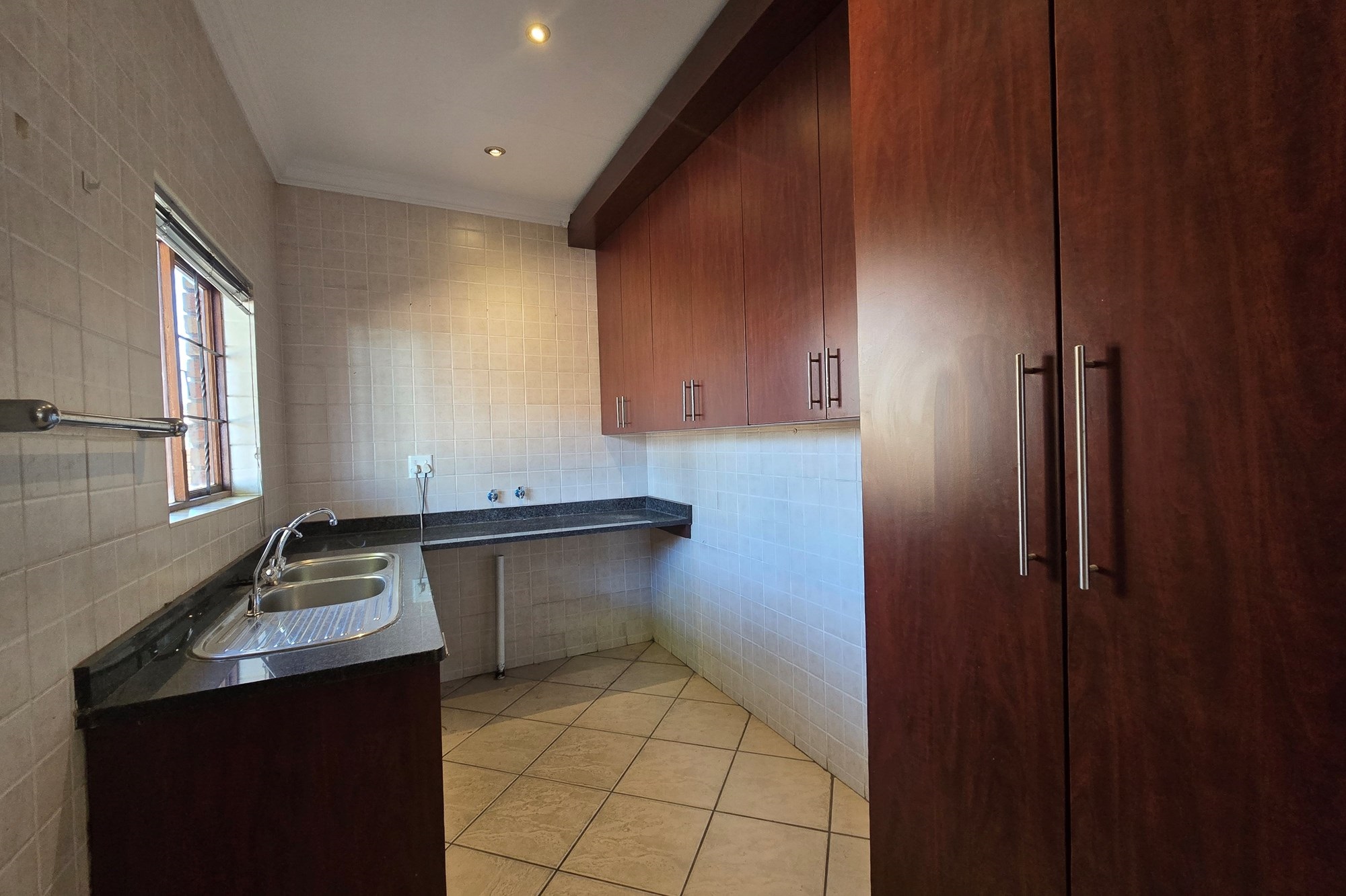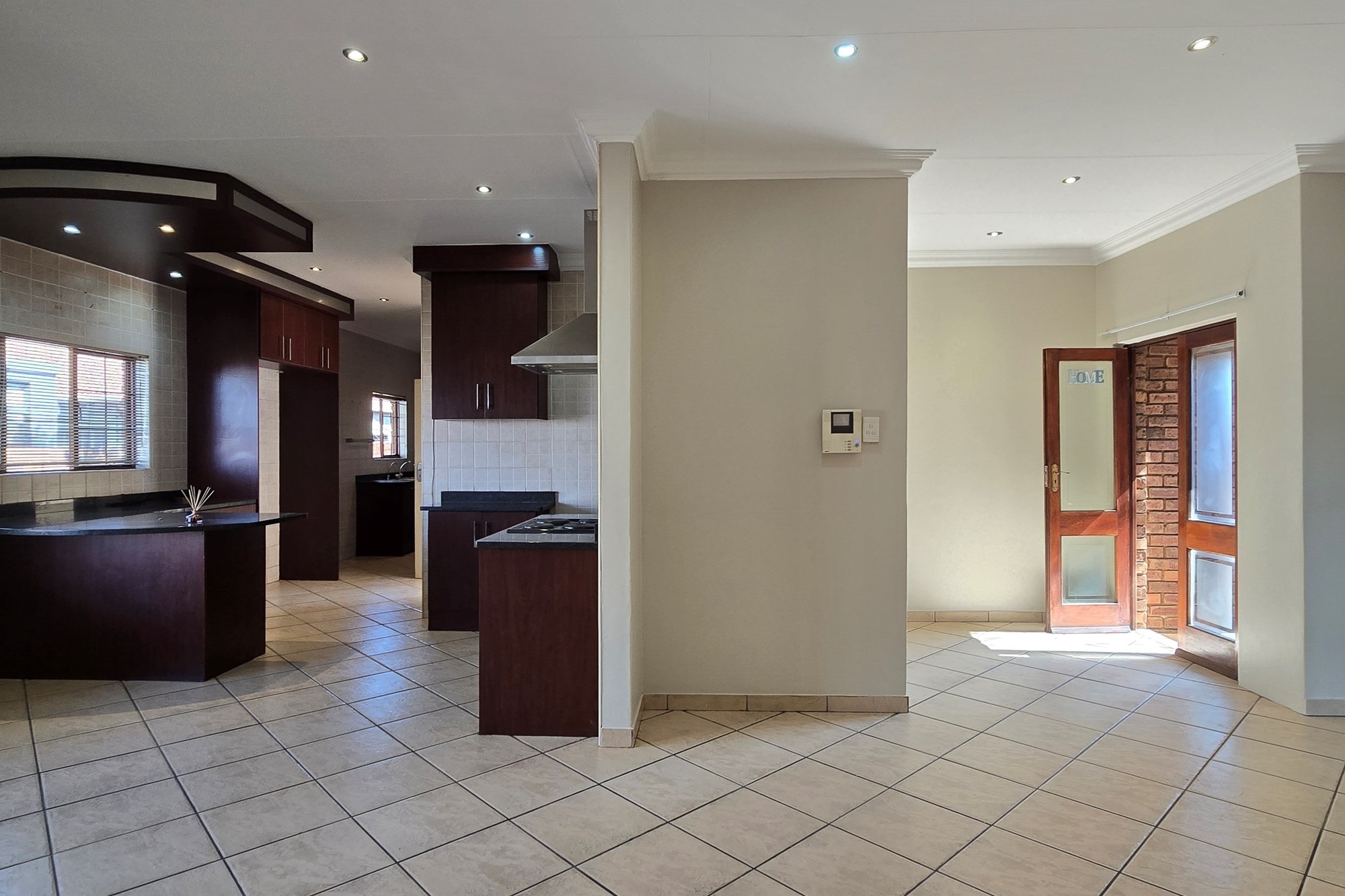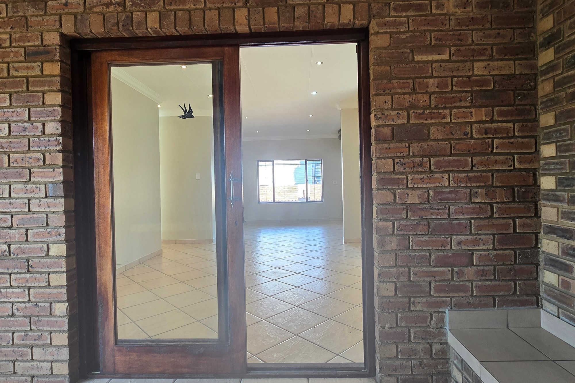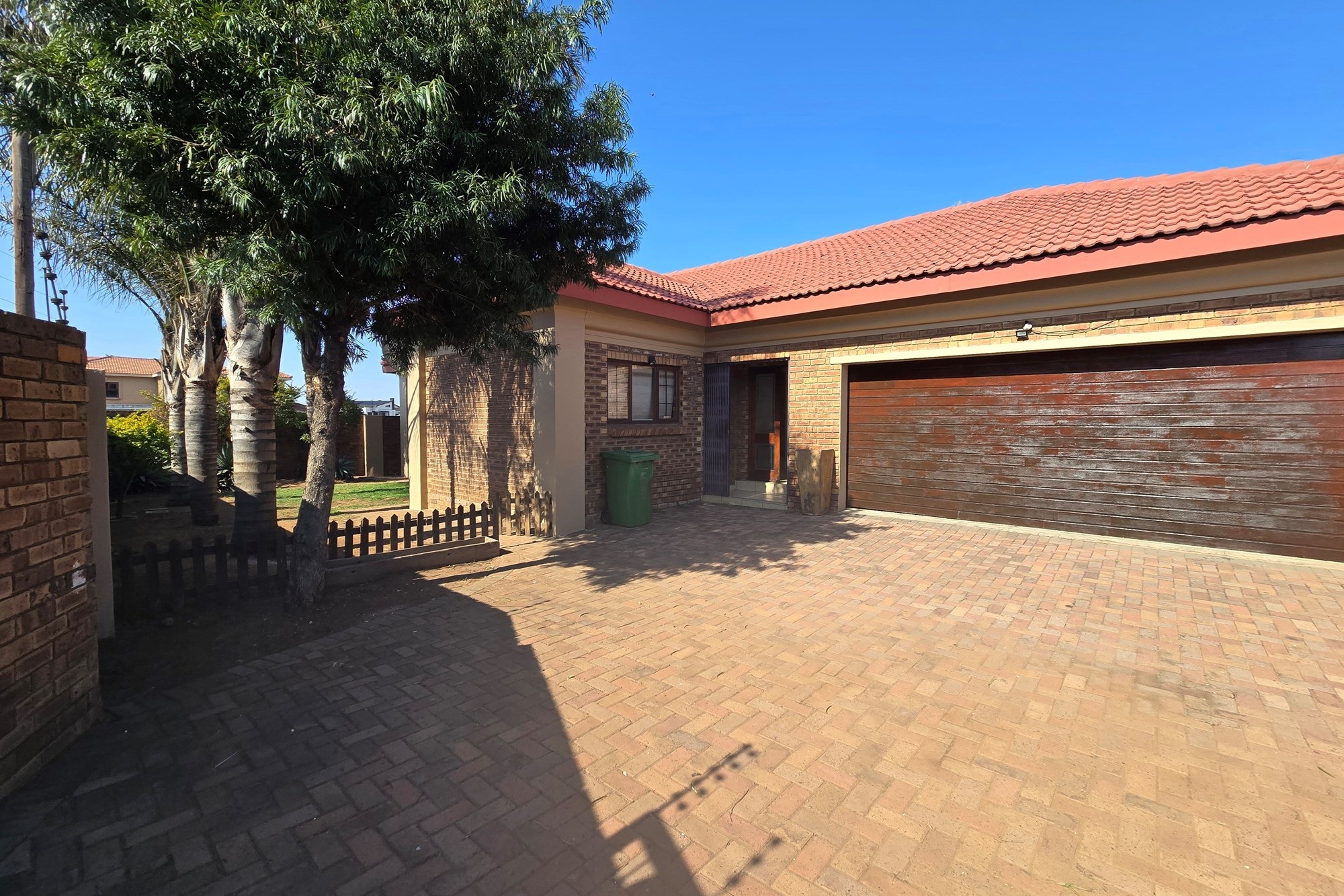 Double wooden doors lead you out to an enclosed patio with built-in braai and sliding doors opening to the garden – the perfect space for weekend entertaining or peaceful mornings with coffee in hand.