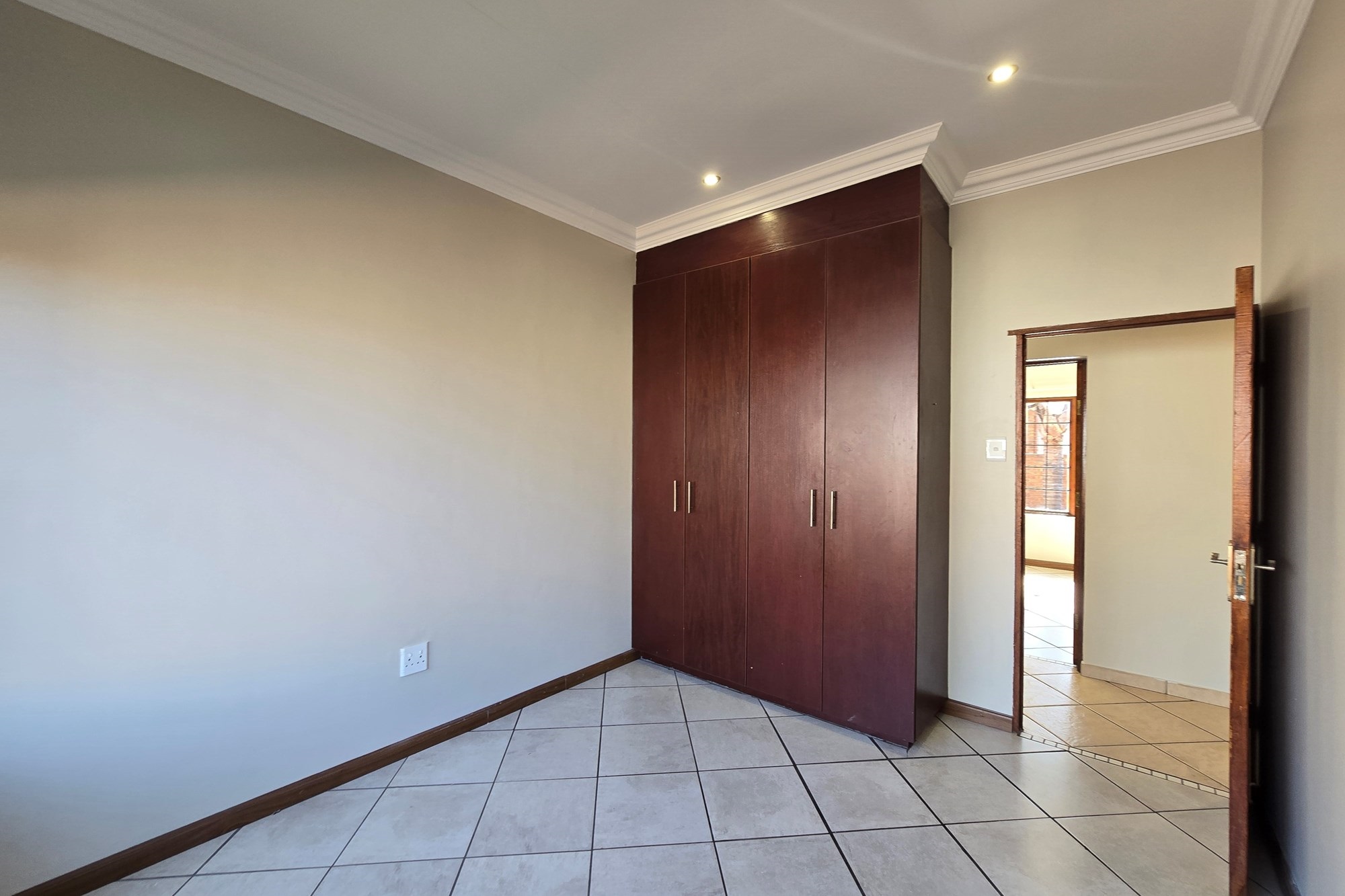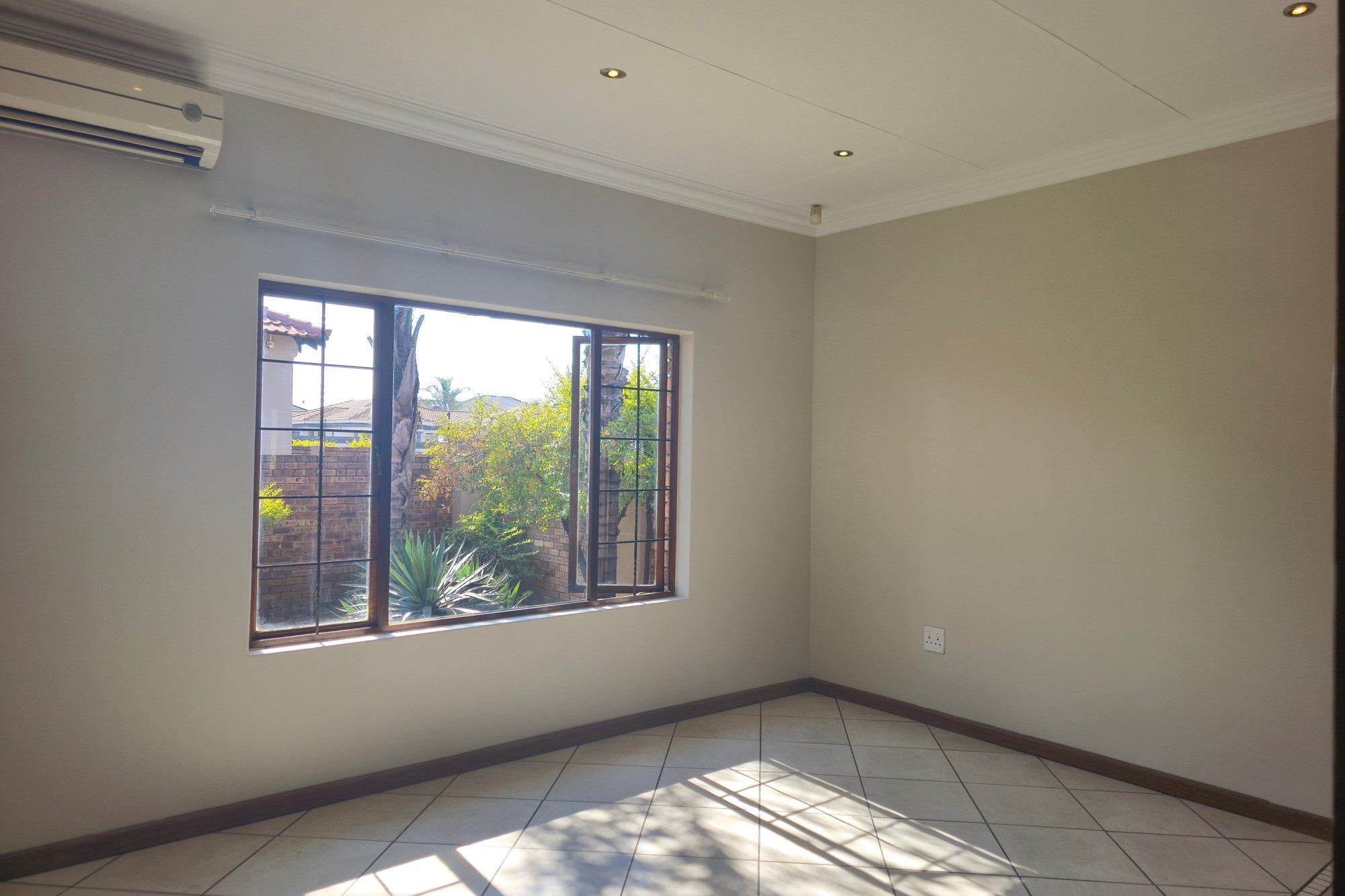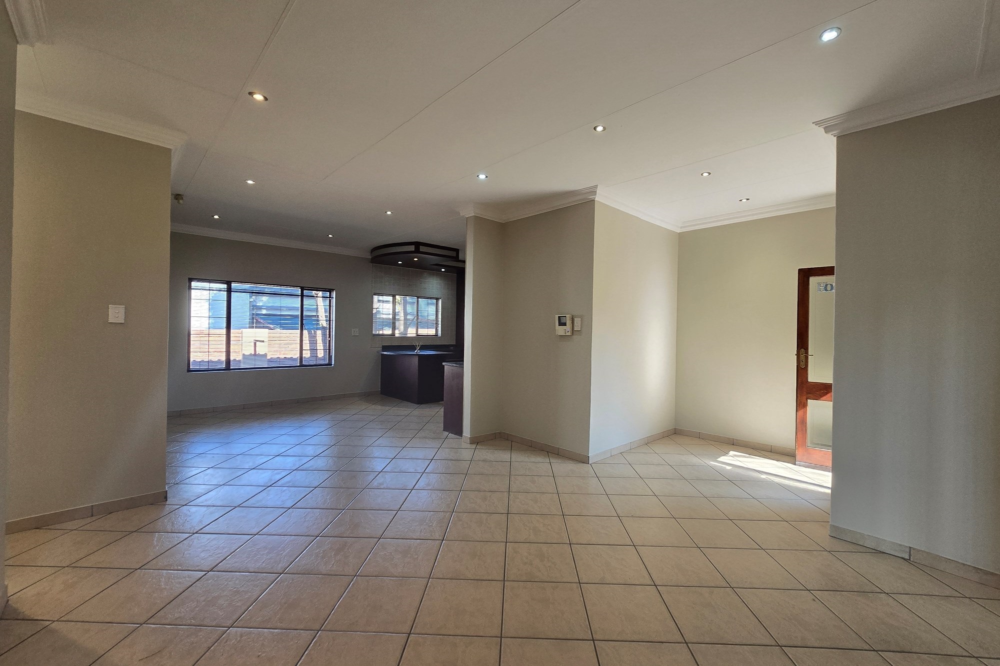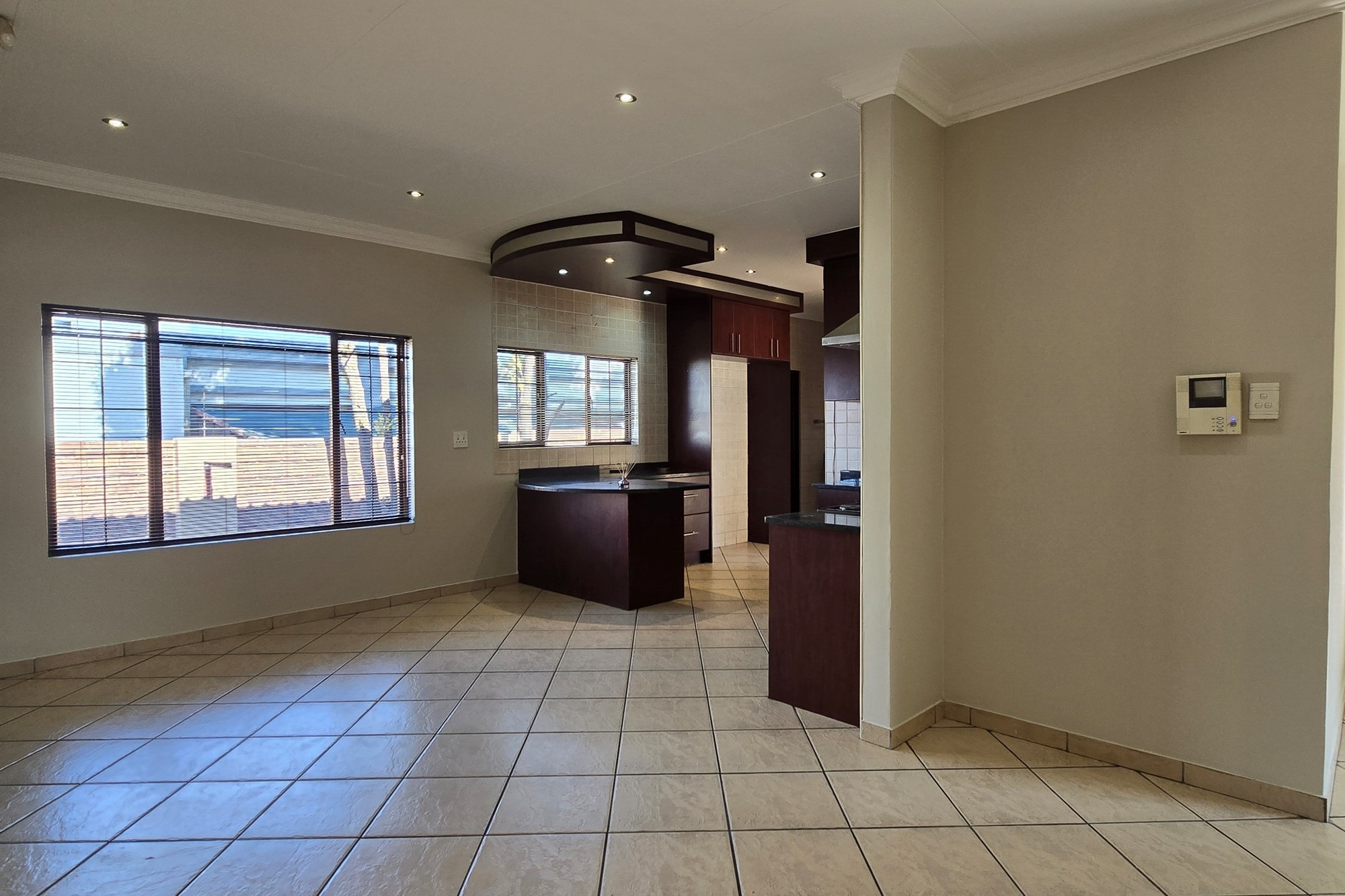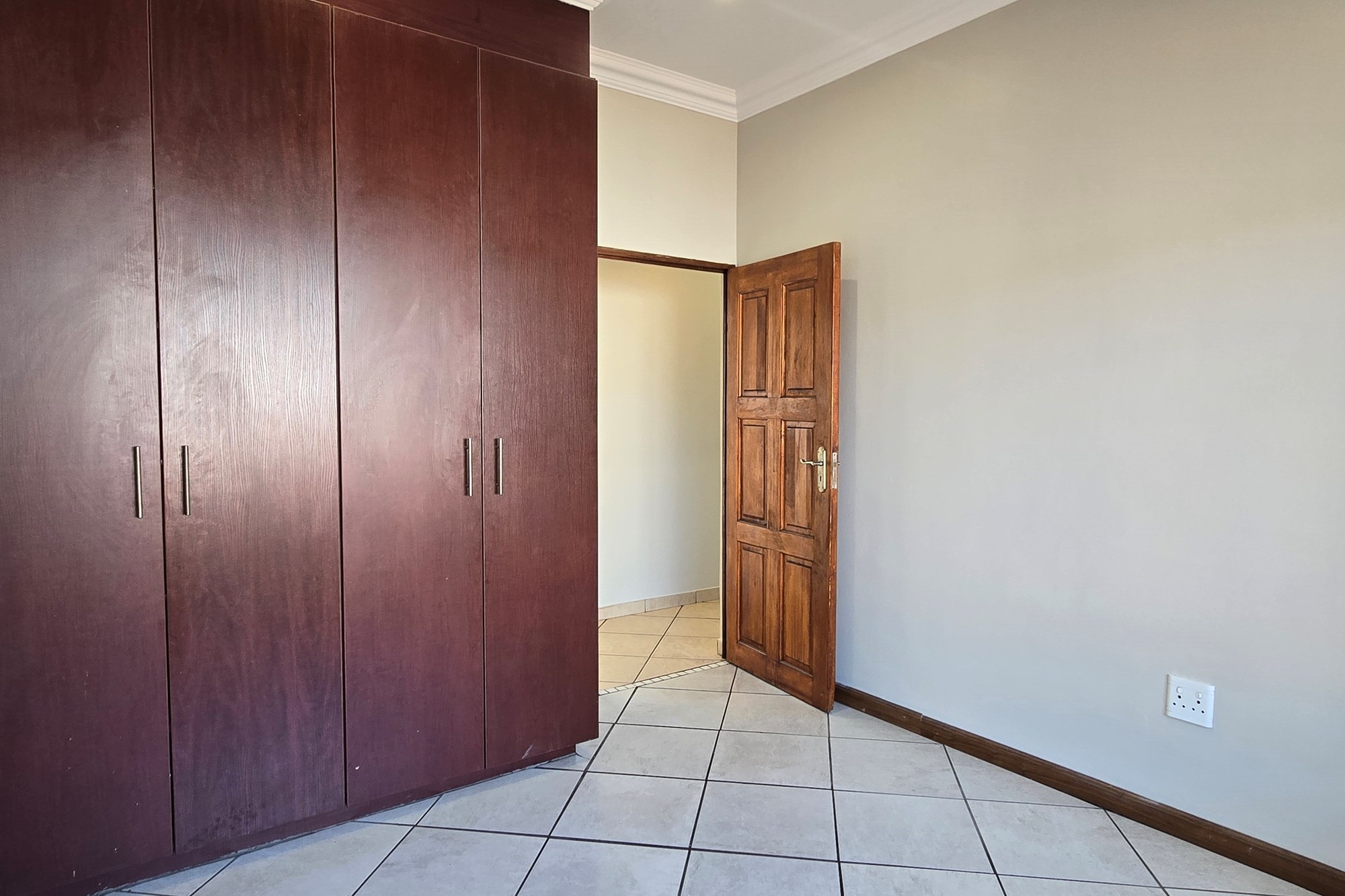 Double wooden doors lead you out to an enclosed patio with built-in braai and sliding doors opening to the garden – the perfect space for weekend entertaining or peaceful mornings with coffee in hand.