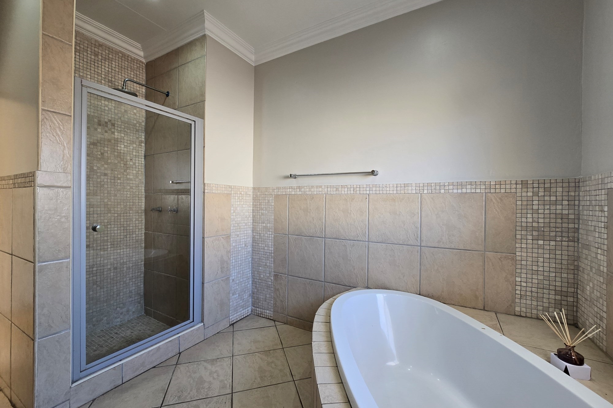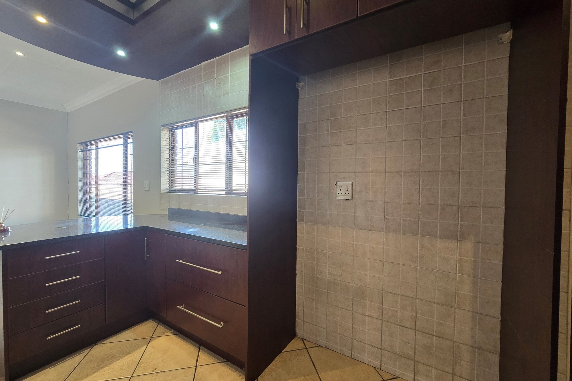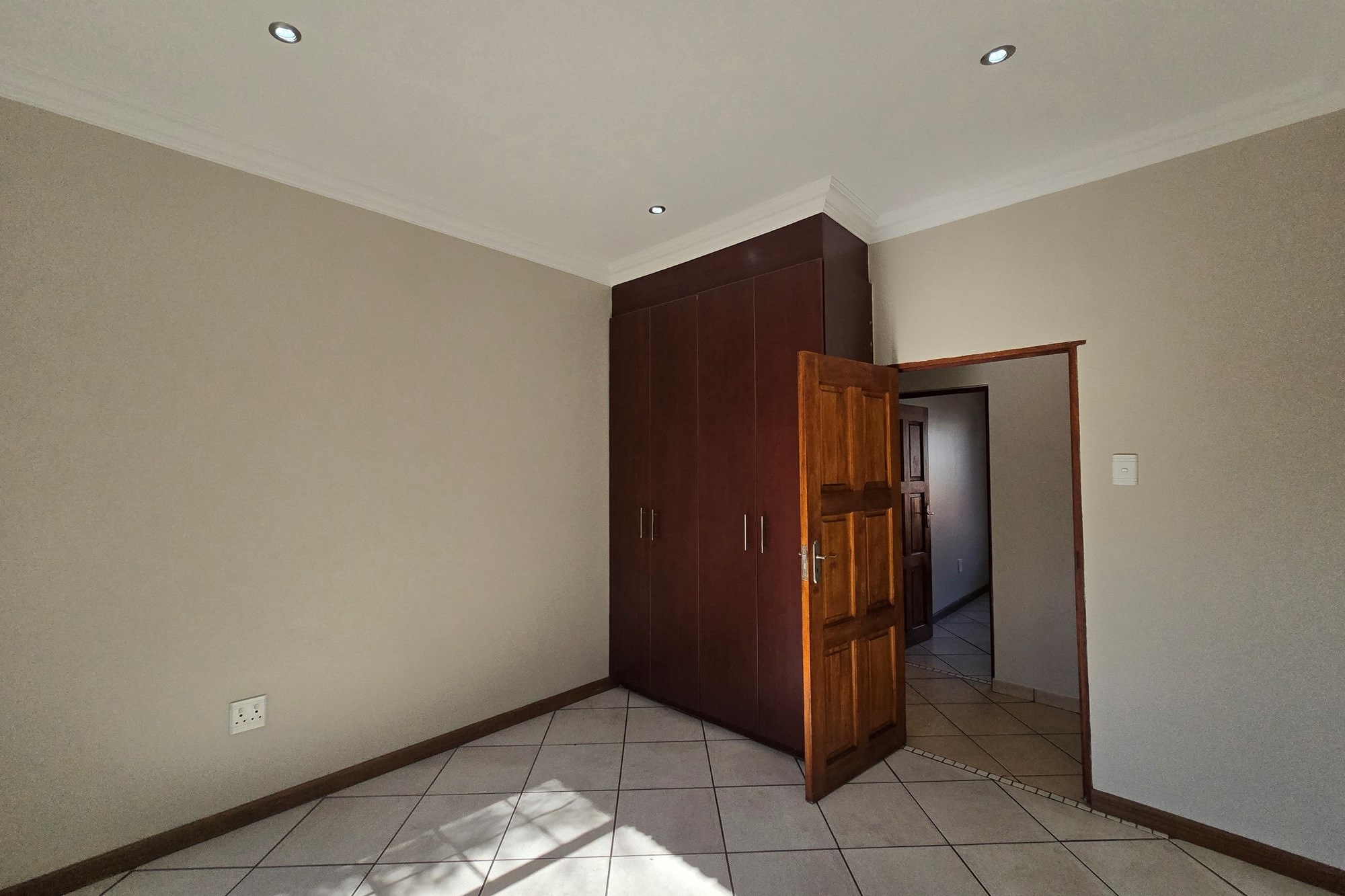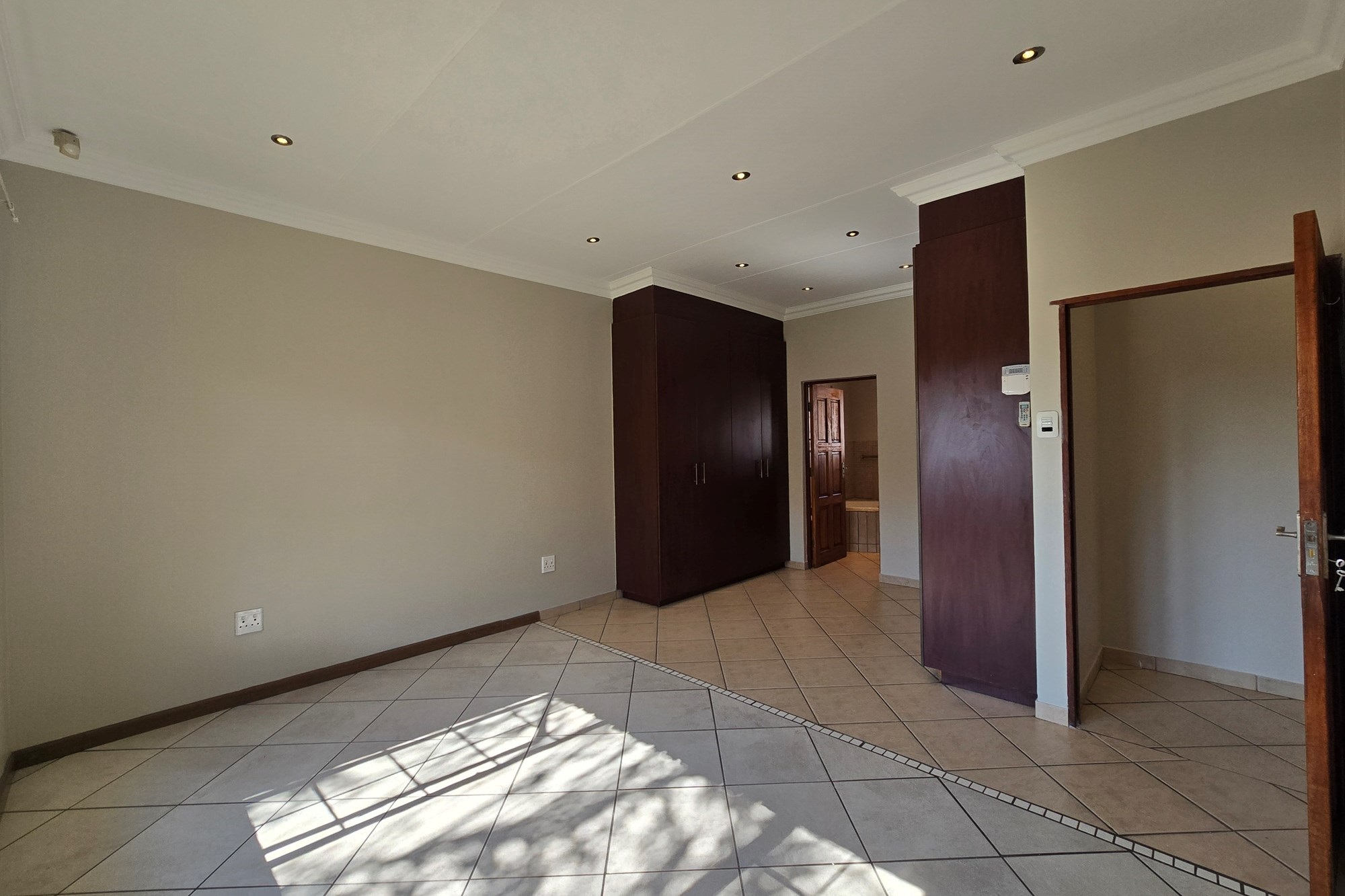 Double wooden doors lead you out to an enclosed patio with built-in braai and sliding doors opening to the garden – the perfect space for weekend entertaining or peaceful mornings with coffee in hand.