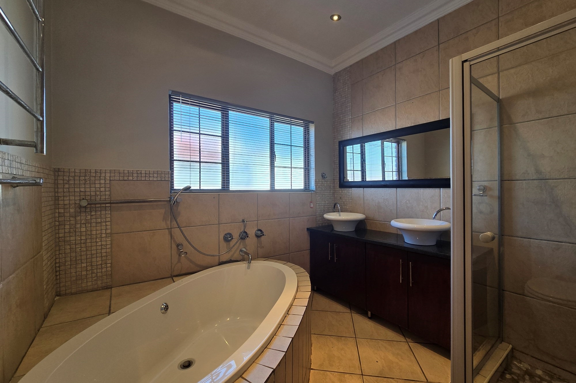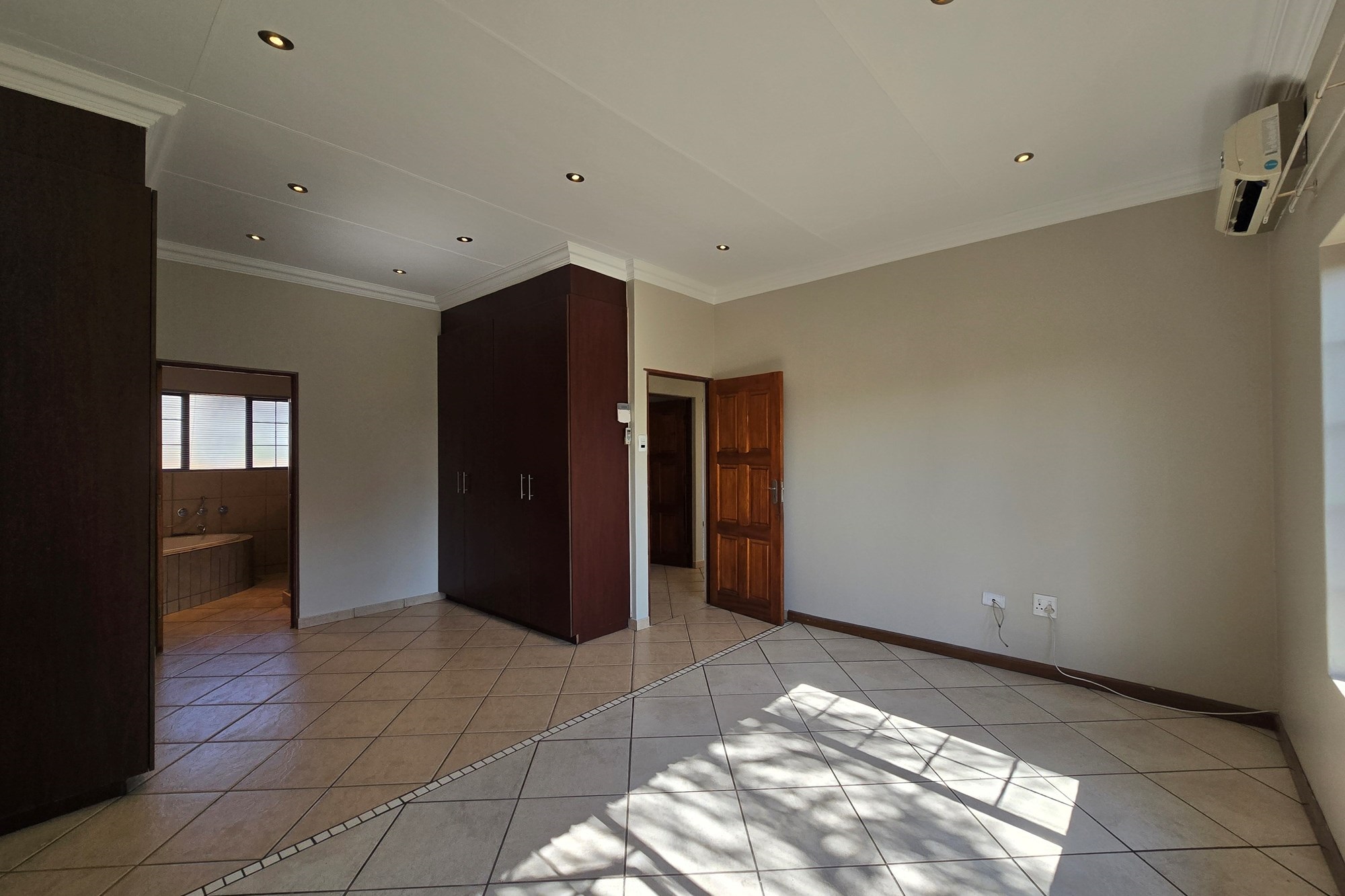 All three generously sized bedrooms feature rich laminated flooring and built-in cupboards. The air-conditioned master suite offers a luxurious full en-suite bathroom with a double vanity, while the second and third bedrooms share a stylish, modern full bathroom.
