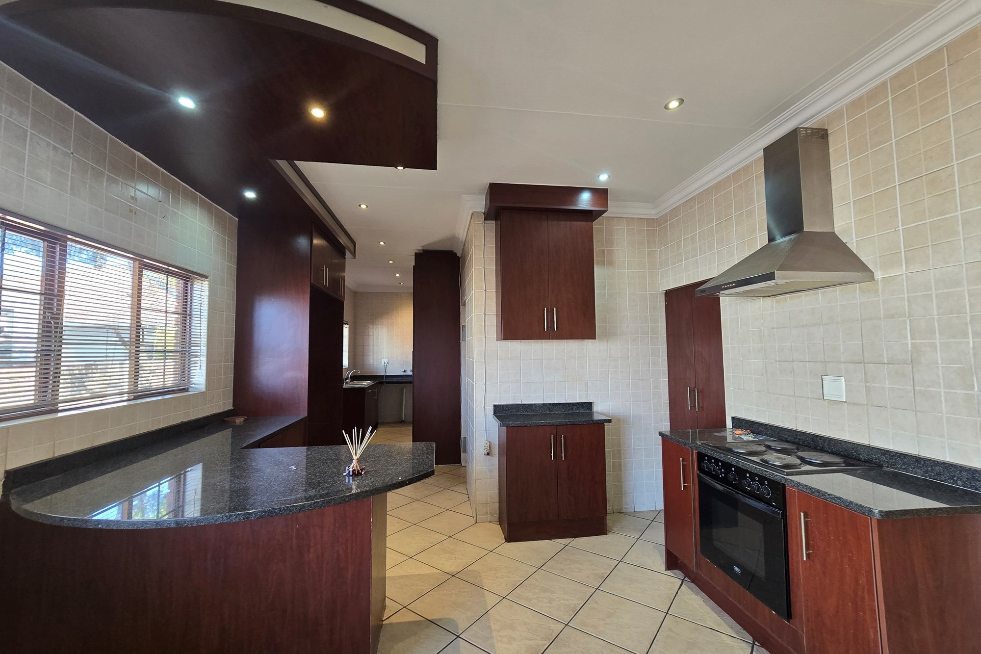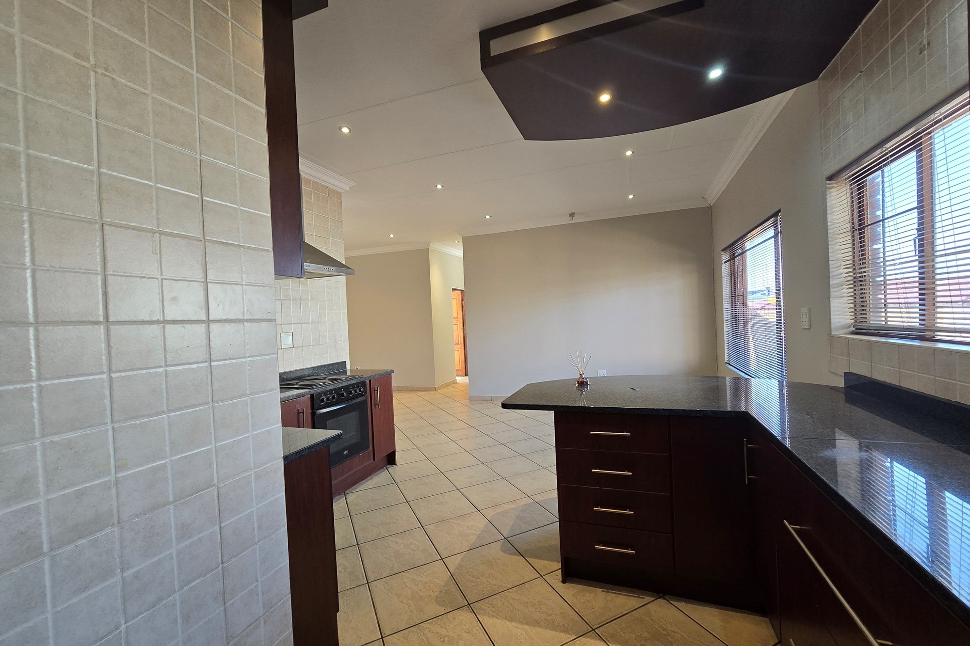 Step through the impressive entrance into a bright, open-plan living area designed for effortless entertaining and everyday family connection. The lounge, dining space, and sophisticated kitchen flow seamlessly together, showcasing Rosewood-toned cabinetry, granite countertops, a gas hob with extractor fan, and a built-in electric oven. A separate scullery and laundry, complete with a reverse osmosis water filtration system, add everyday convenience.