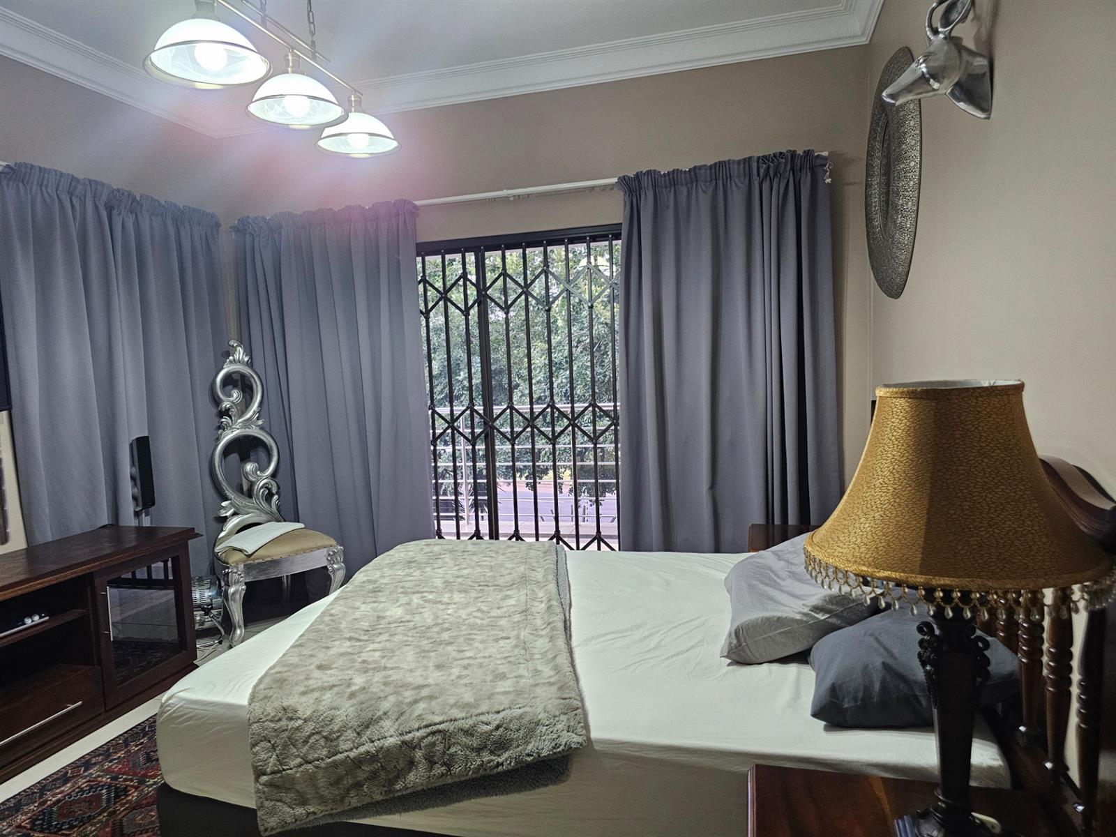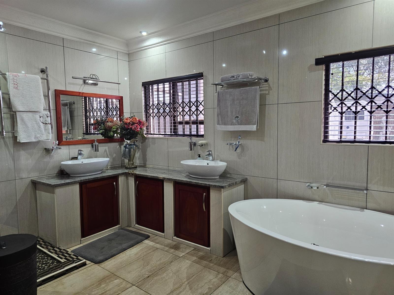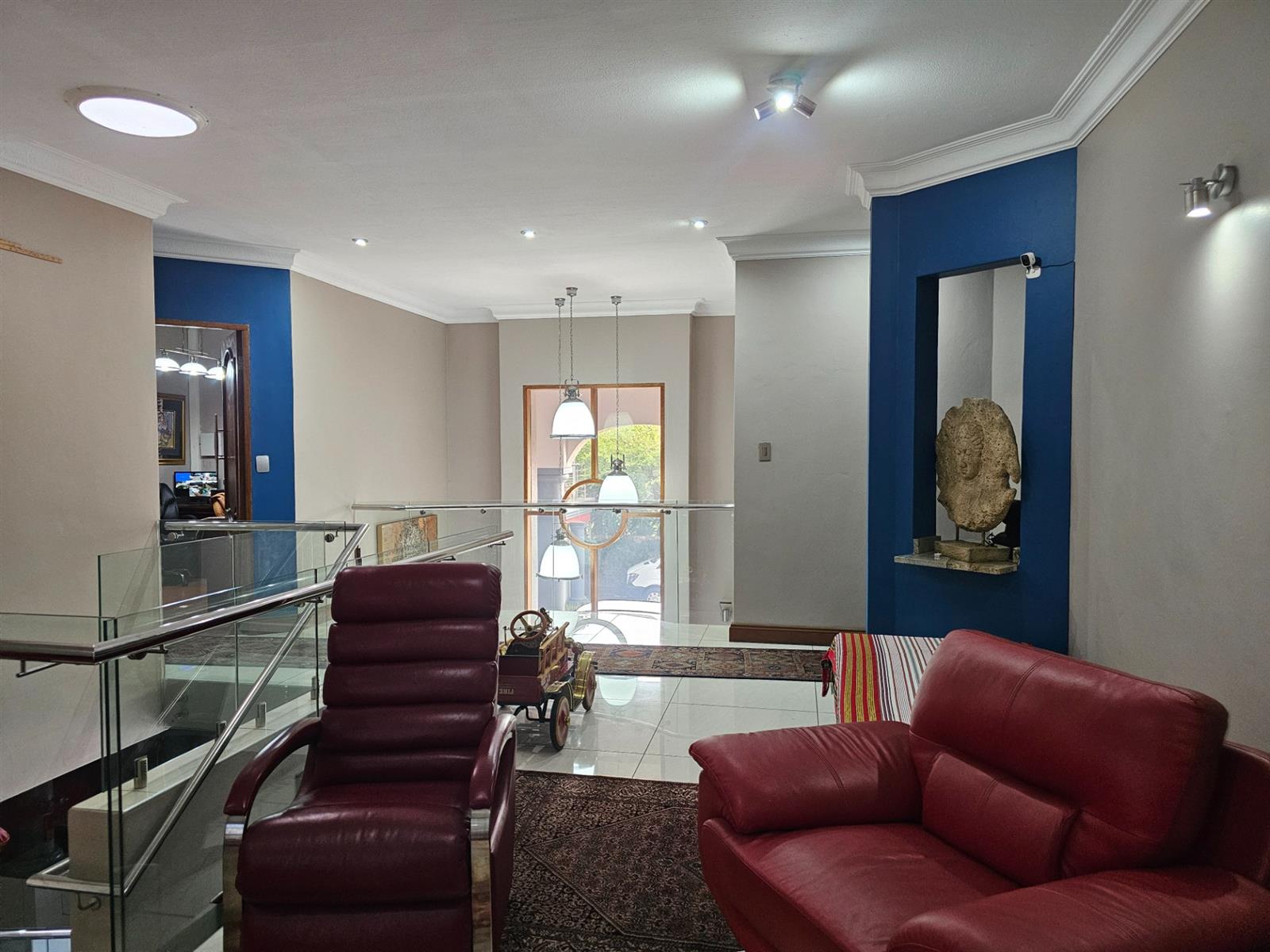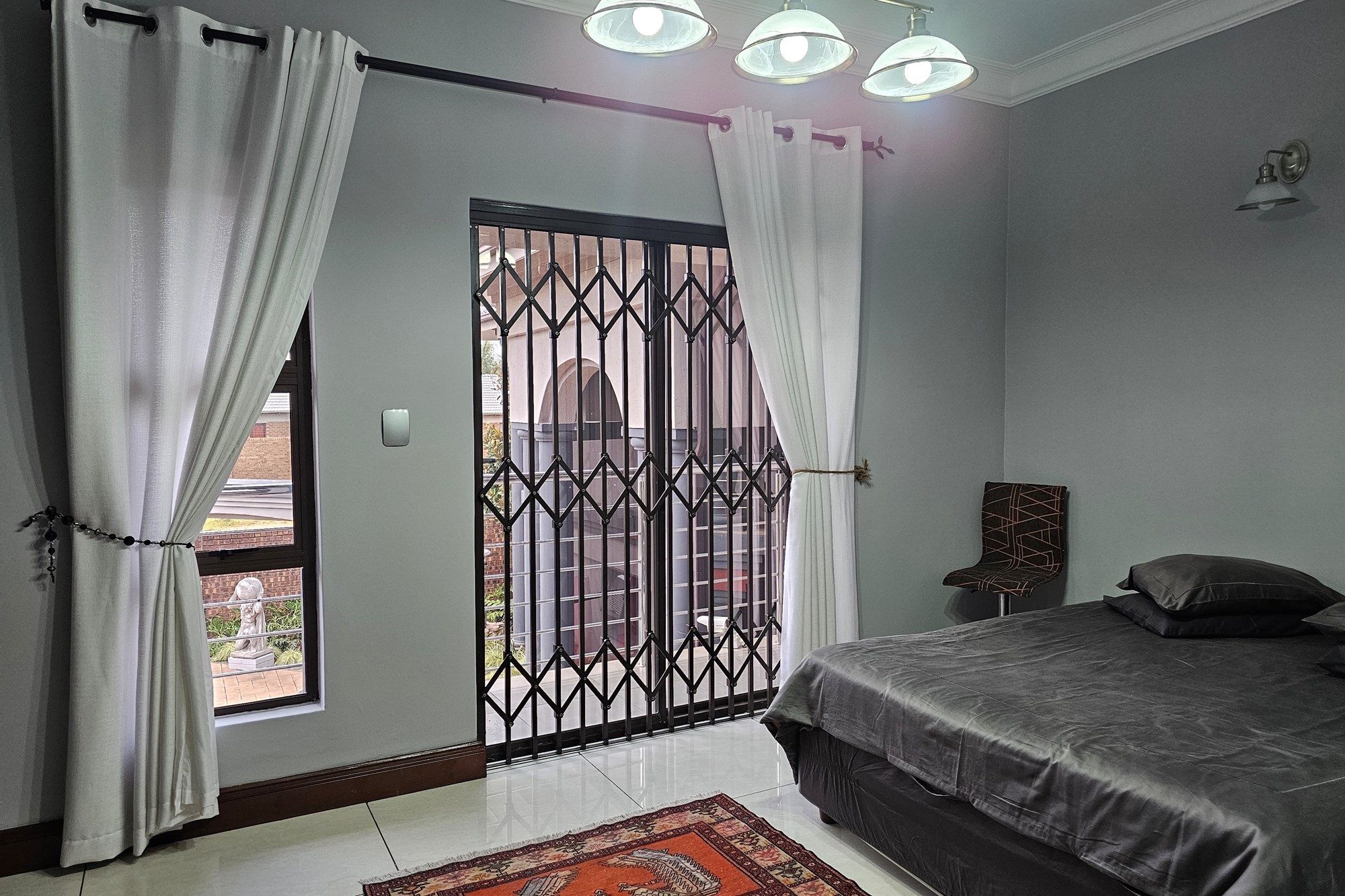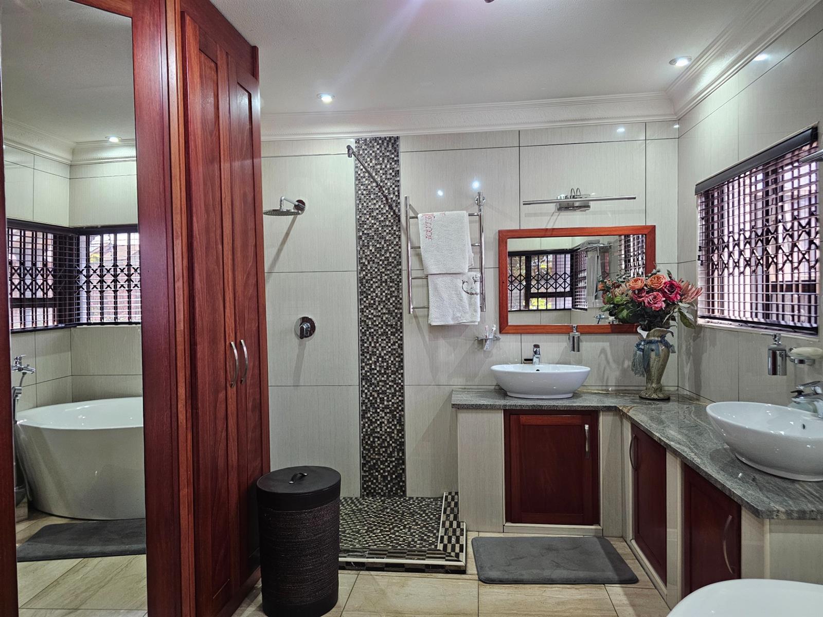 This double-story residence offers four generously sized bedrooms, three luxurious ensuite bathrooms and an additional bathroom. Upstairs bedrooms open onto balconies, while the downstairs bedroom enjoys tranquil views of the private garden. Bathrooms are designed as royal retreats, complete with double basins, bath, shower and refined finishes. A private dining room overlooking the garden enhances the home’s sophisticated charm, while glass and stainless-steel balustrades guide you upstairs to a lounge opening onto a balcony. Two bedrooms with custom built-in cupboards and elegant ensuite bathrooms also open to the balcony, one boasting a private lounge with a mini-bar for added indulgence.