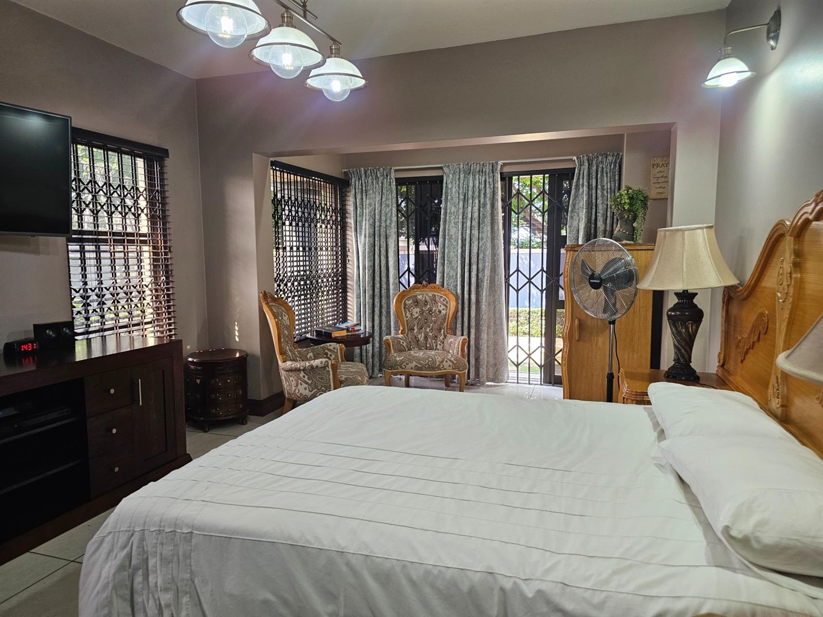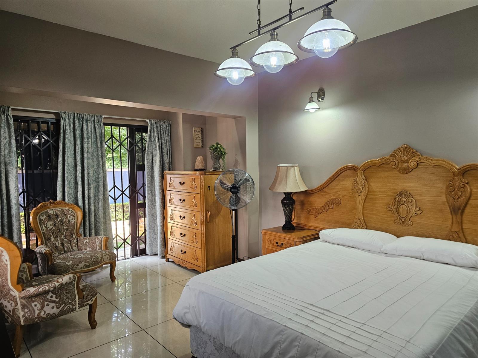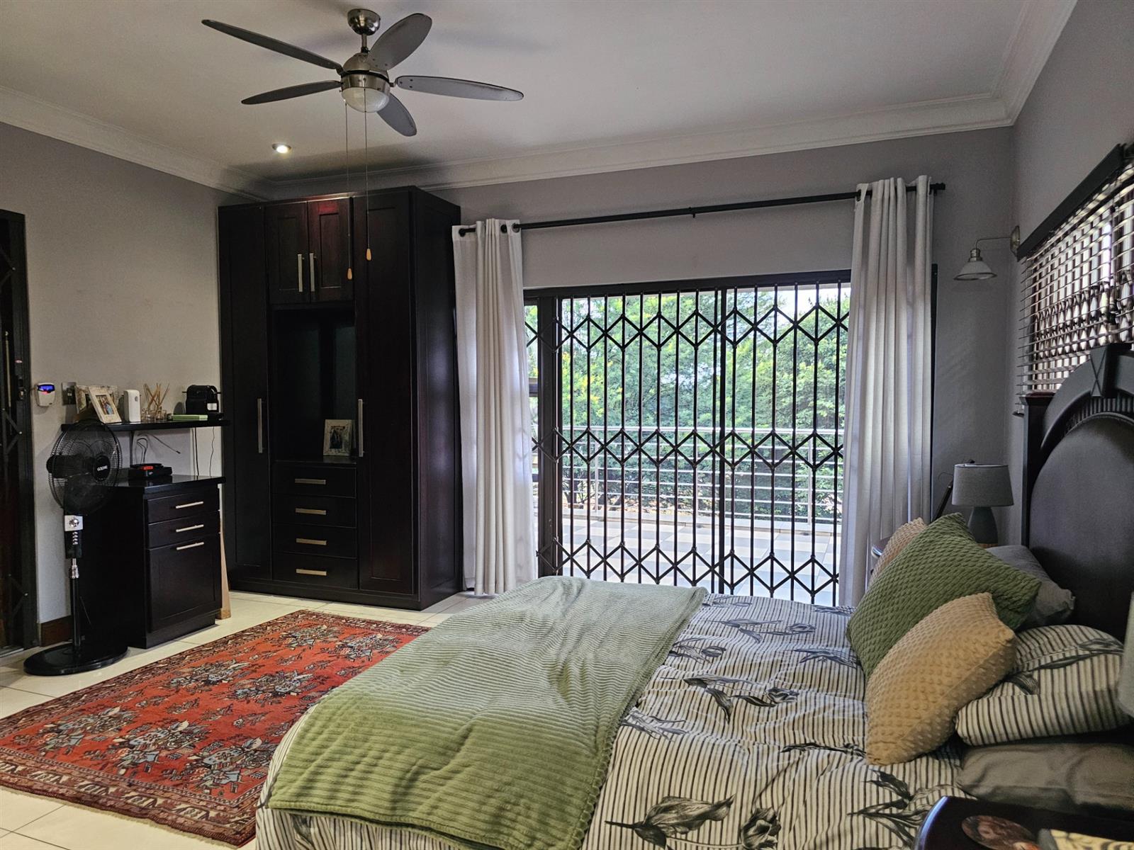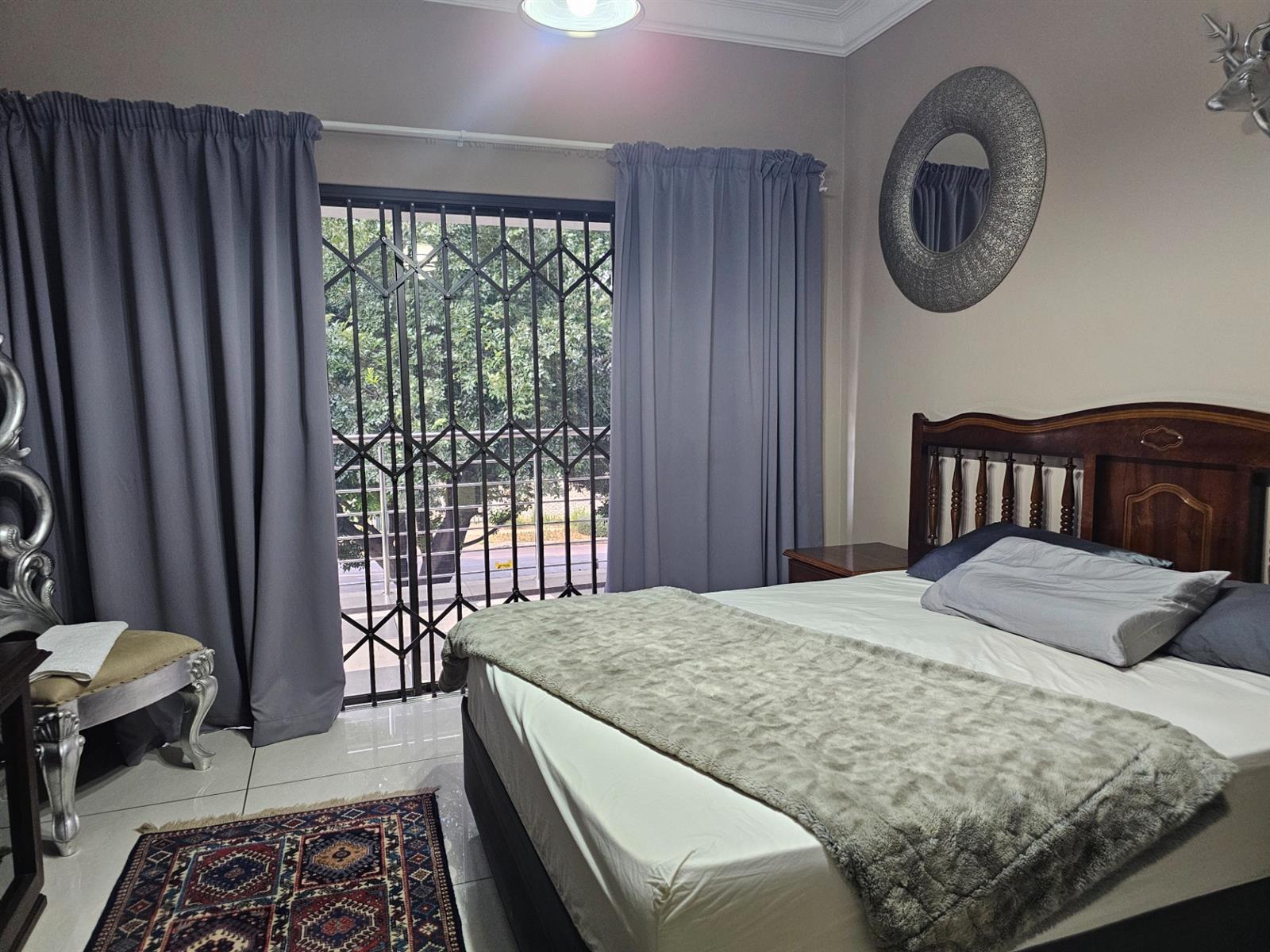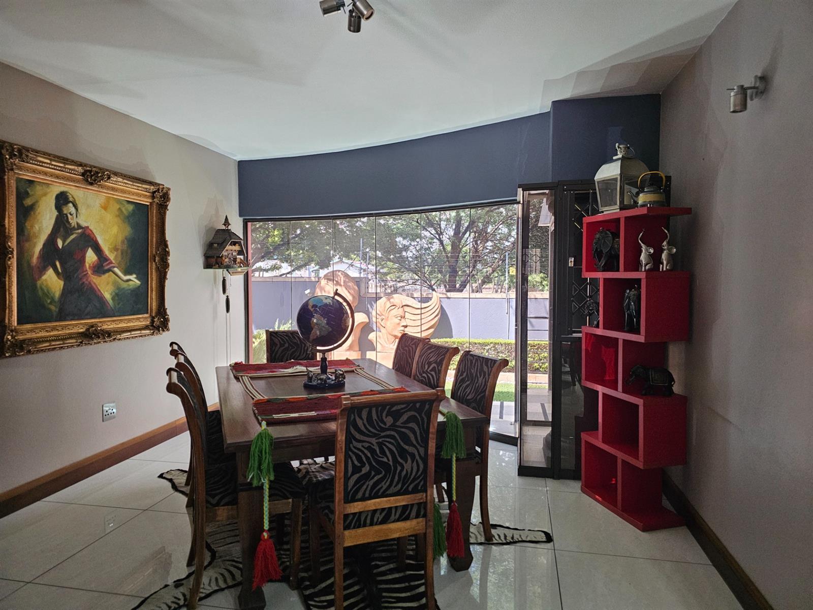 This double-story residence offers four generously sized bedrooms, three luxurious ensuite bathrooms and an additional bathroom. Upstairs bedrooms open onto balconies, while the downstairs bedroom enjoys tranquil views of the private garden. Bathrooms are designed as royal retreats, complete with double basins, bath, shower and refined finishes. A private dining room overlooking the garden enhances the home’s sophisticated charm, while glass and stainless-steel balustrades guide you upstairs to a lounge opening onto a balcony. Two bedrooms with custom built-in cupboards and elegant ensuite bathrooms also open to the balcony, one boasting a private lounge with a mini-bar for added indulgence.