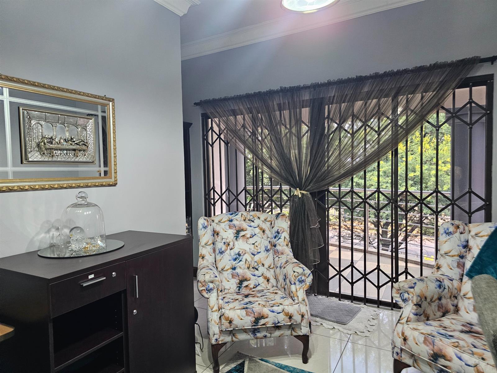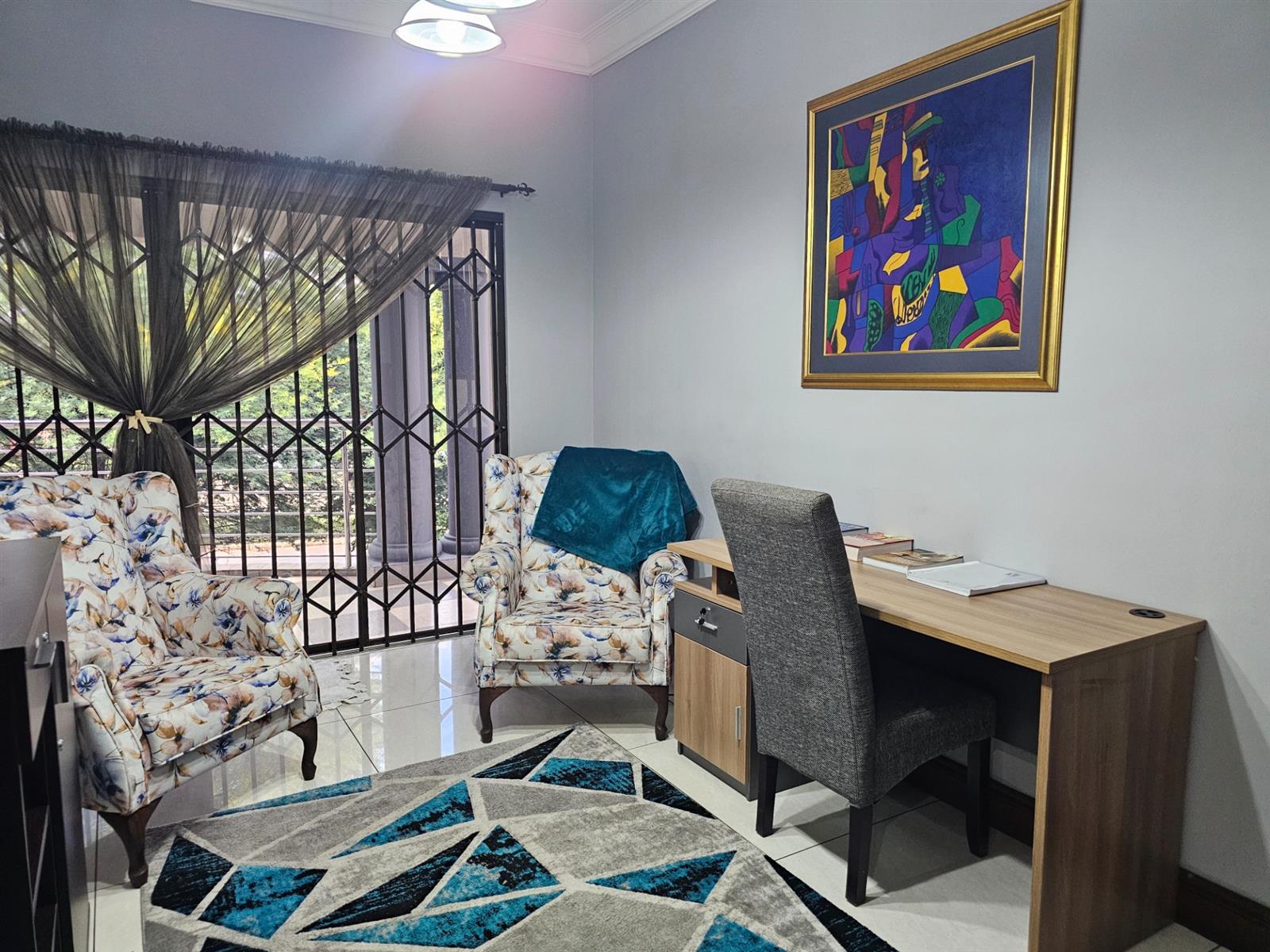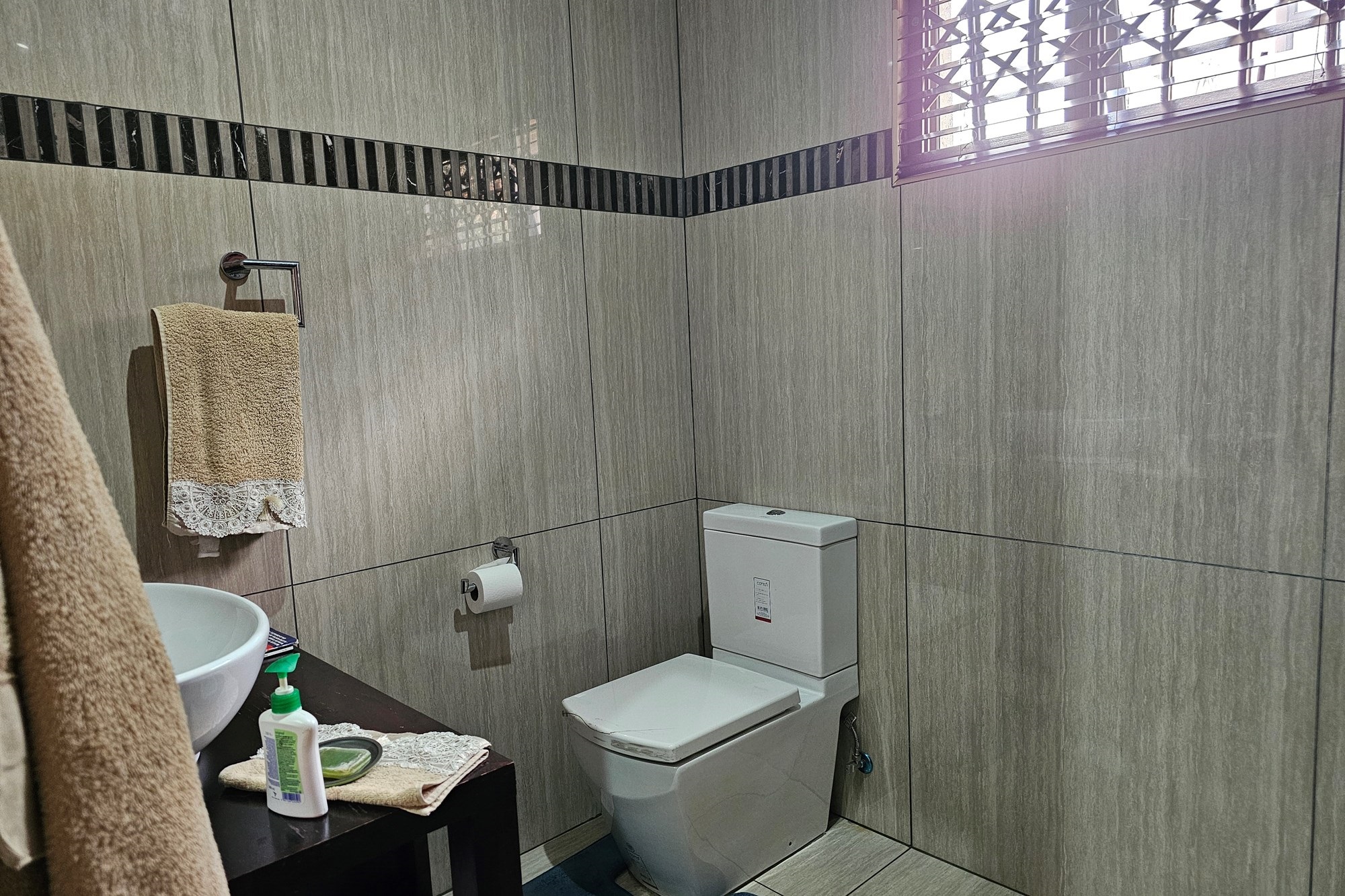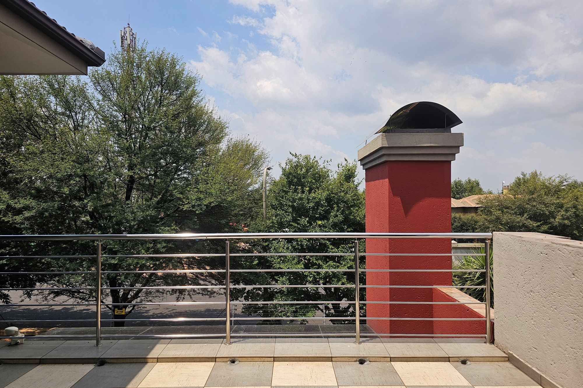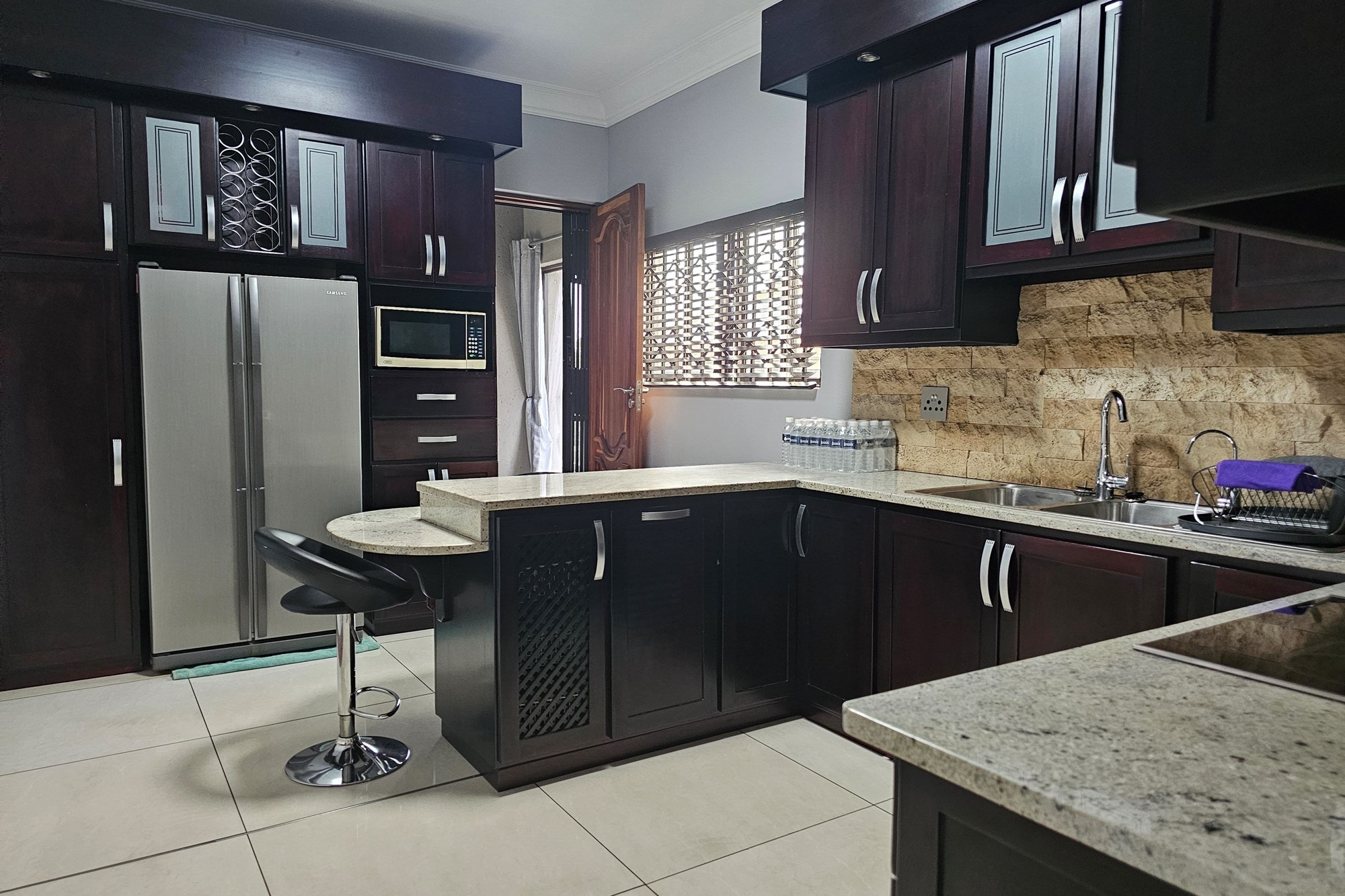 This double-story residence offers four generously sized bedrooms, three luxurious ensuite bathrooms and an additional bathroom. Upstairs bedrooms open onto balconies, while the downstairs bedroom enjoys tranquil views of the private garden. Bathrooms are designed as royal retreats, complete with double basins, bath, shower and refined finishes. A private dining room overlooking the garden enhances the home’s sophisticated charm, while glass and stainless-steel balustrades guide you upstairs to a lounge opening onto a balcony. Two bedrooms with custom built-in cupboards and elegant ensuite bathrooms also open to the balcony, one boasting a private lounge with a mini-bar for added indulgence.