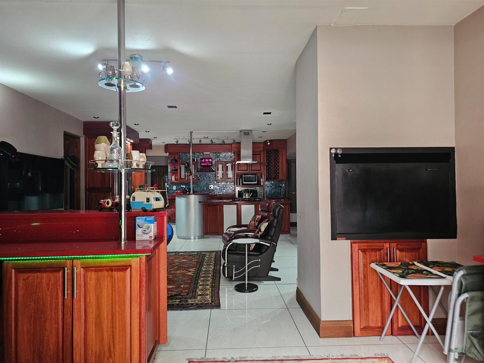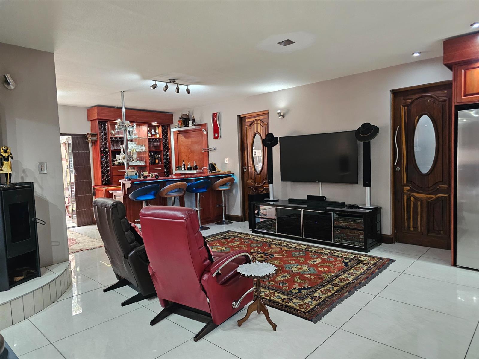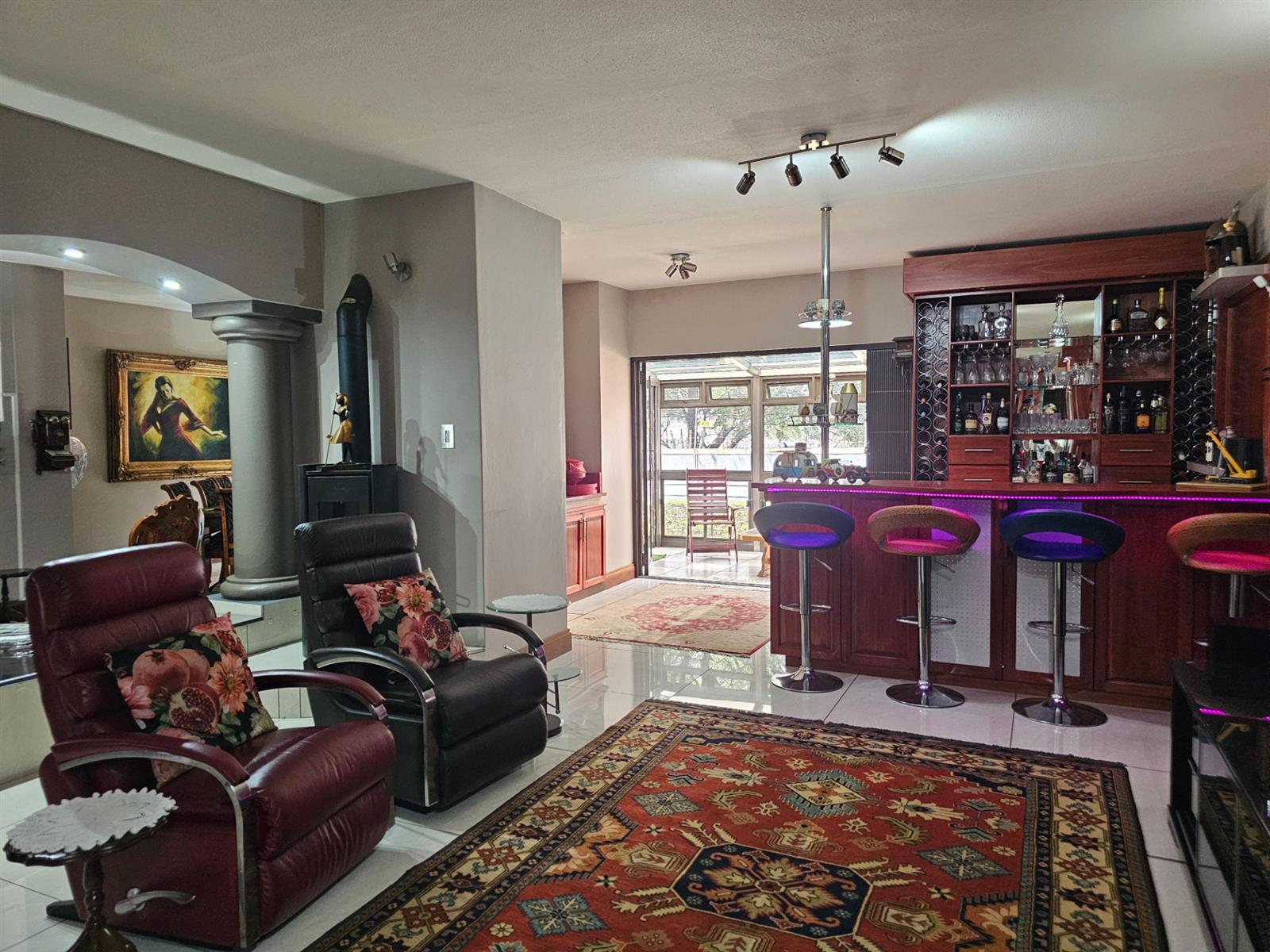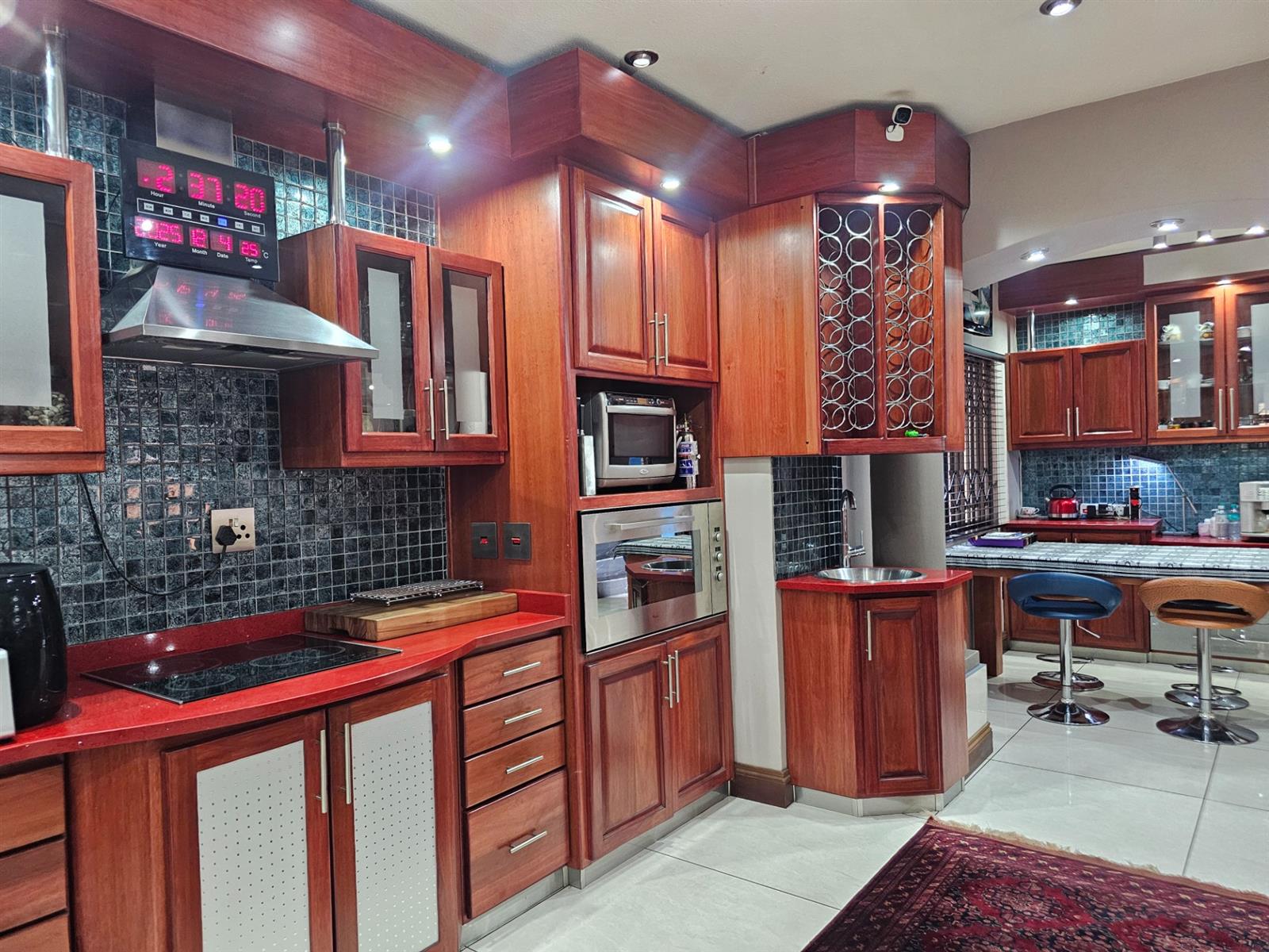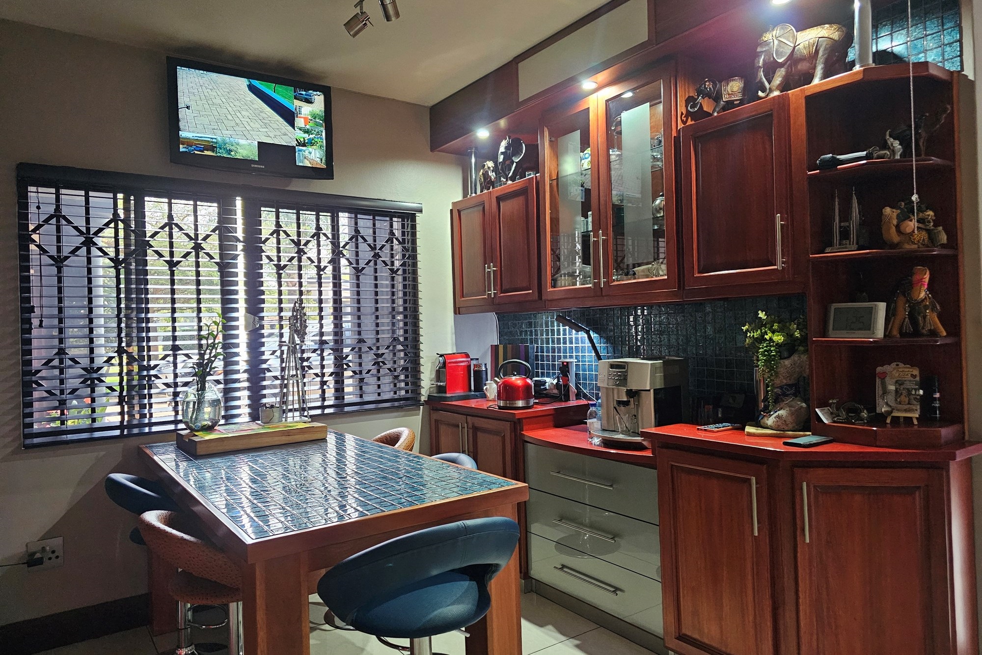 Designed for a family who values space, comfort and refined living, the expansive open-plan living areas flow effortlessly into a breathtaking kitchen. Featuring a gas and glass electric hob, eye-level oven and solid Rosewood cupboards, the kitchen is both functional and elegant, complemented by seamless porcelain tiles throughout. It extends into the TV room and a matching Rosewood bar, leading to an enclosed patio with a built-in braai—perfect for year-round entertaining. Outside, the manicured garden invites unforgettable moments with family and friends.