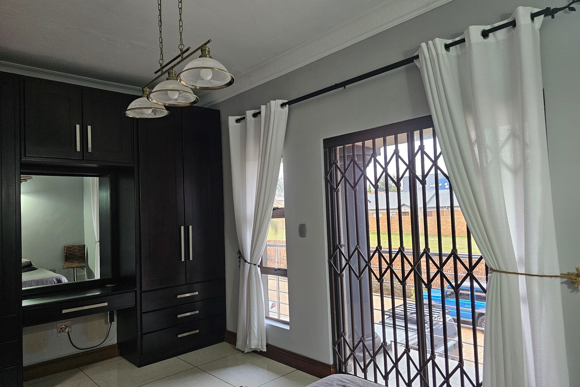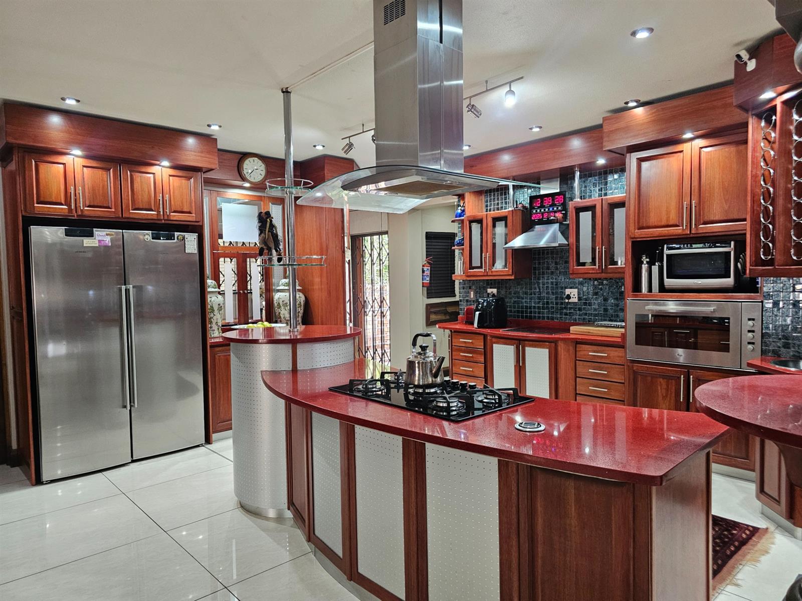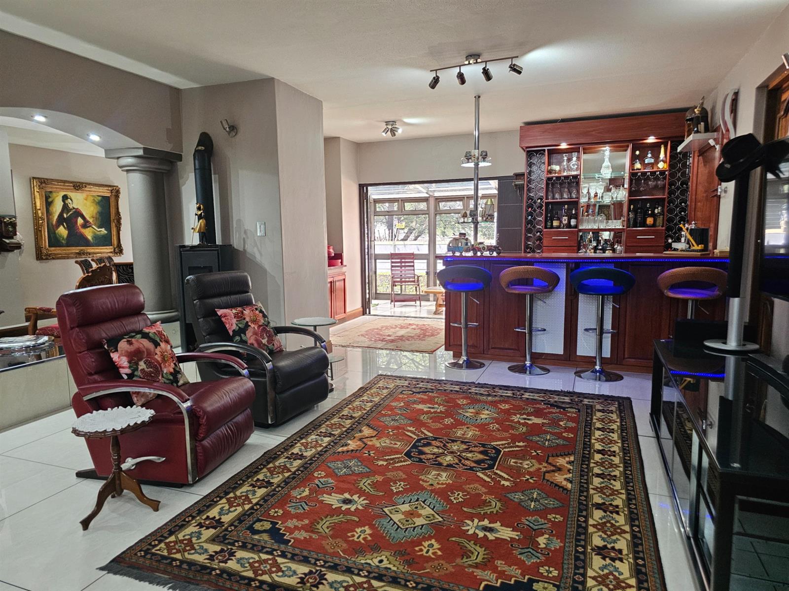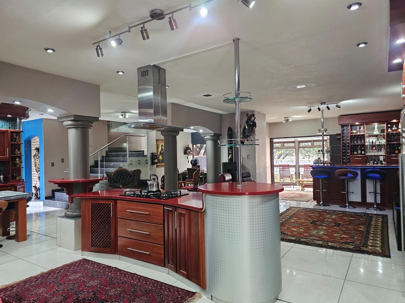 Designed for a family who values space, comfort and refined living, the expansive open-plan living areas flow effortlessly into a breathtaking kitchen. Featuring a gas and glass electric hob, eye-level oven and solid Rosewood cupboards, the kitchen is both functional and elegant, complemented by seamless porcelain tiles throughout. It extends into the TV room and a matching Rosewood bar, leading to an enclosed patio with a built-in braai—perfect for year-round entertaining. Outside, the manicured garden invites unforgettable moments with family and friends.