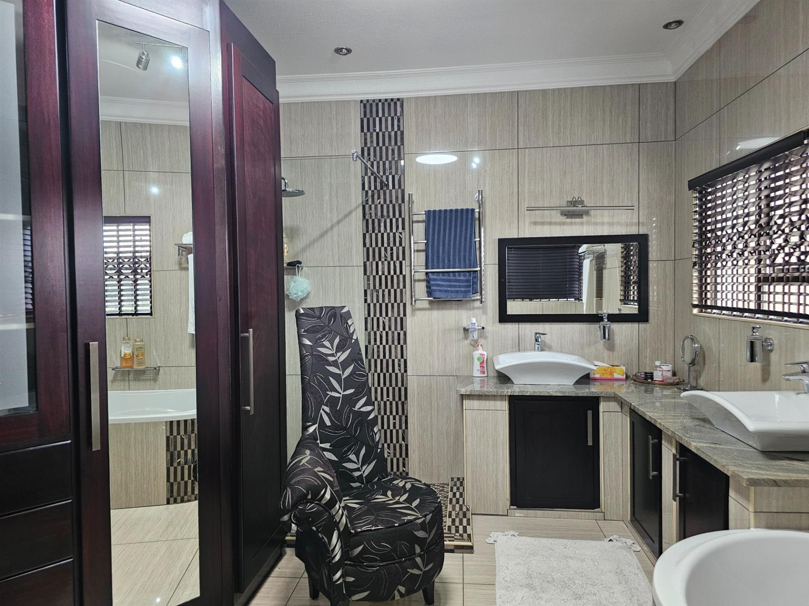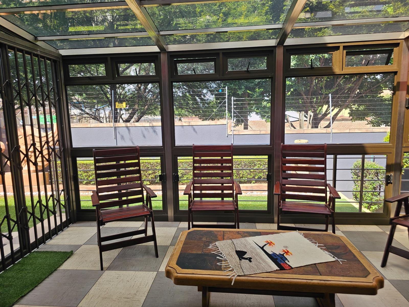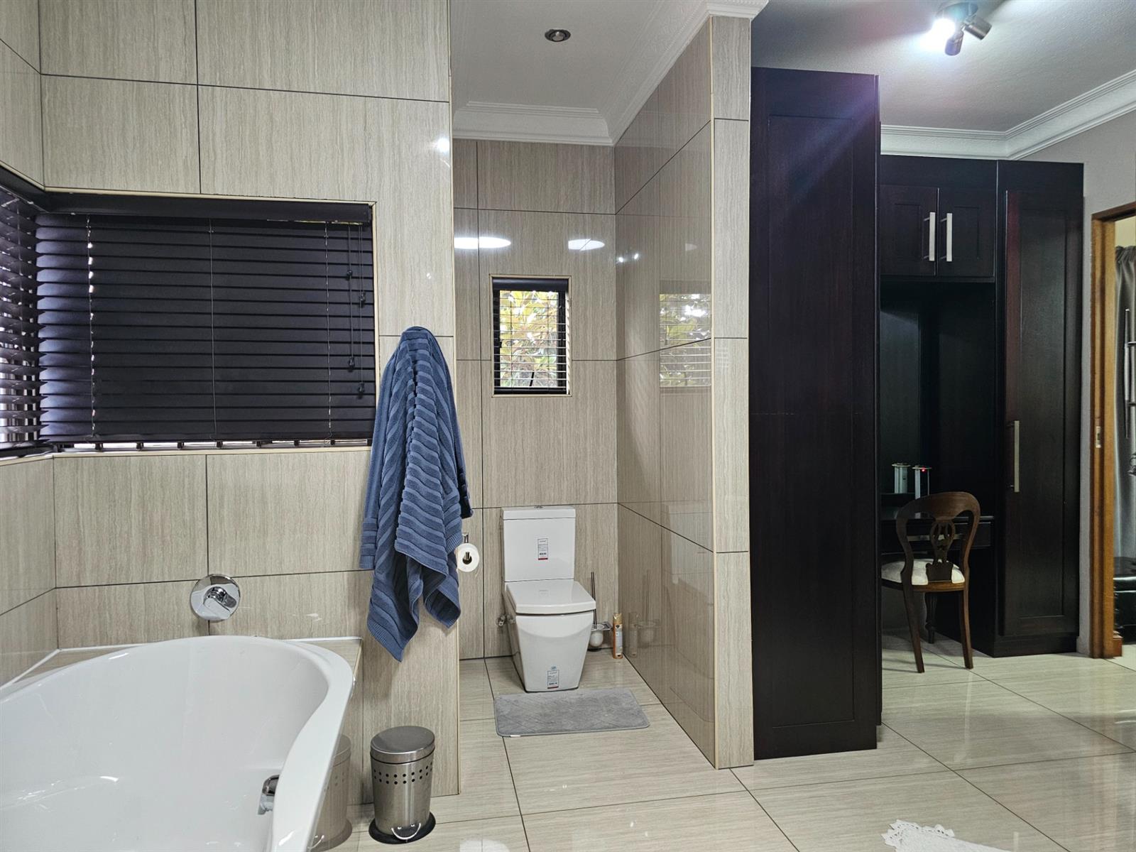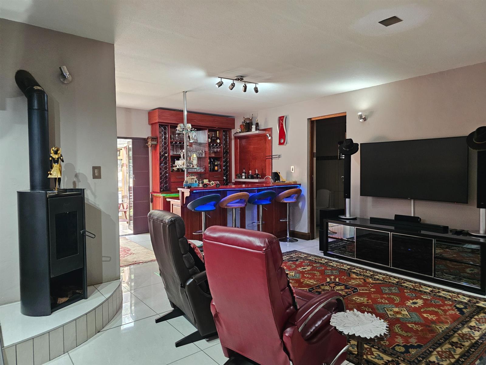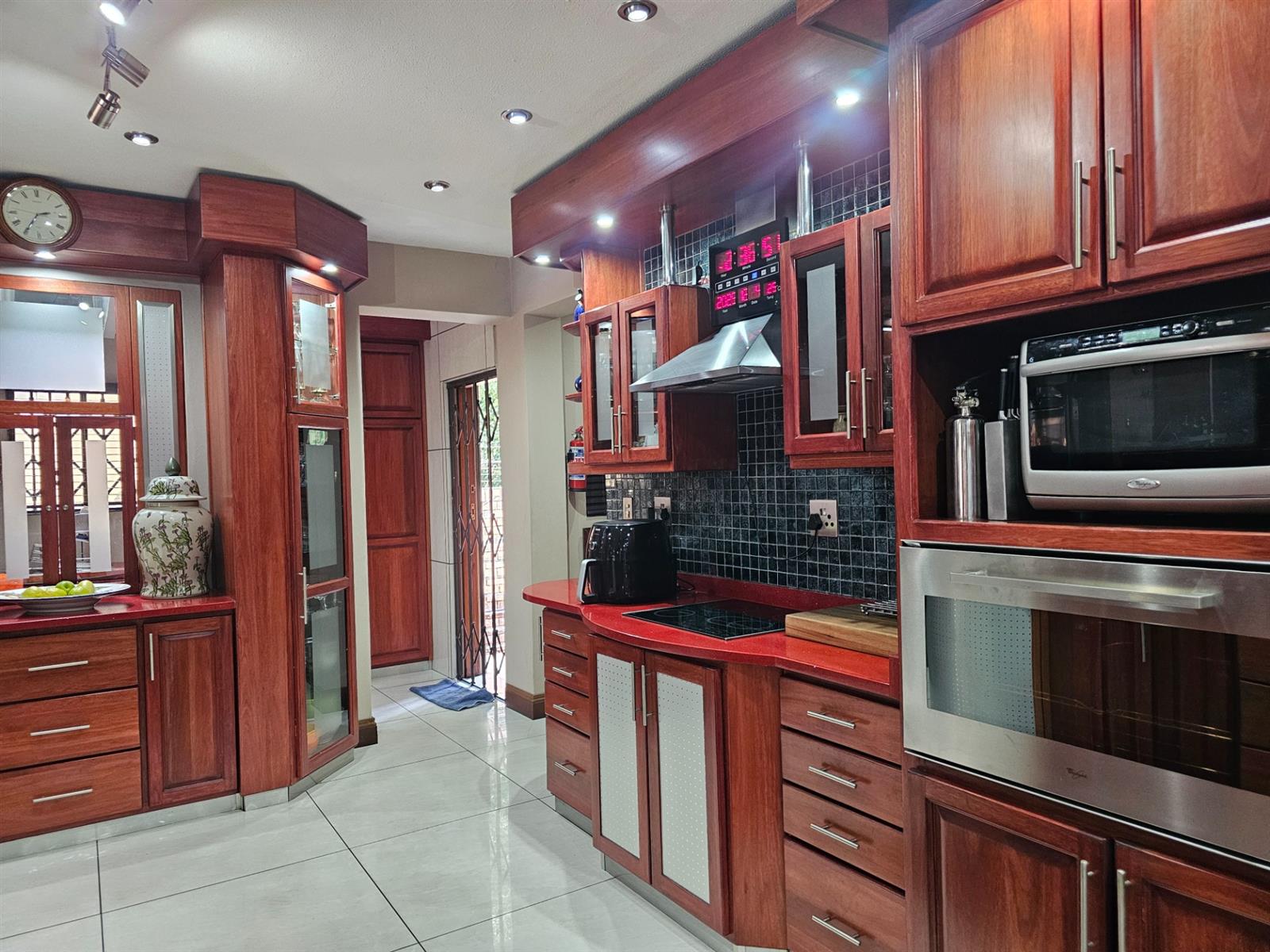 Designed for a family who values space, comfort and refined living, the expansive open-plan living areas flow effortlessly into a breathtaking kitchen. Featuring a gas and glass electric hob, eye-level oven and solid Rosewood cupboards, the kitchen is both functional and elegant, complemented by seamless porcelain tiles throughout. It extends into the TV room and a matching Rosewood bar, leading to an enclosed patio with a built-in braai—perfect for year-round entertaining. Outside, the manicured garden invites unforgettable moments with family and friends.
