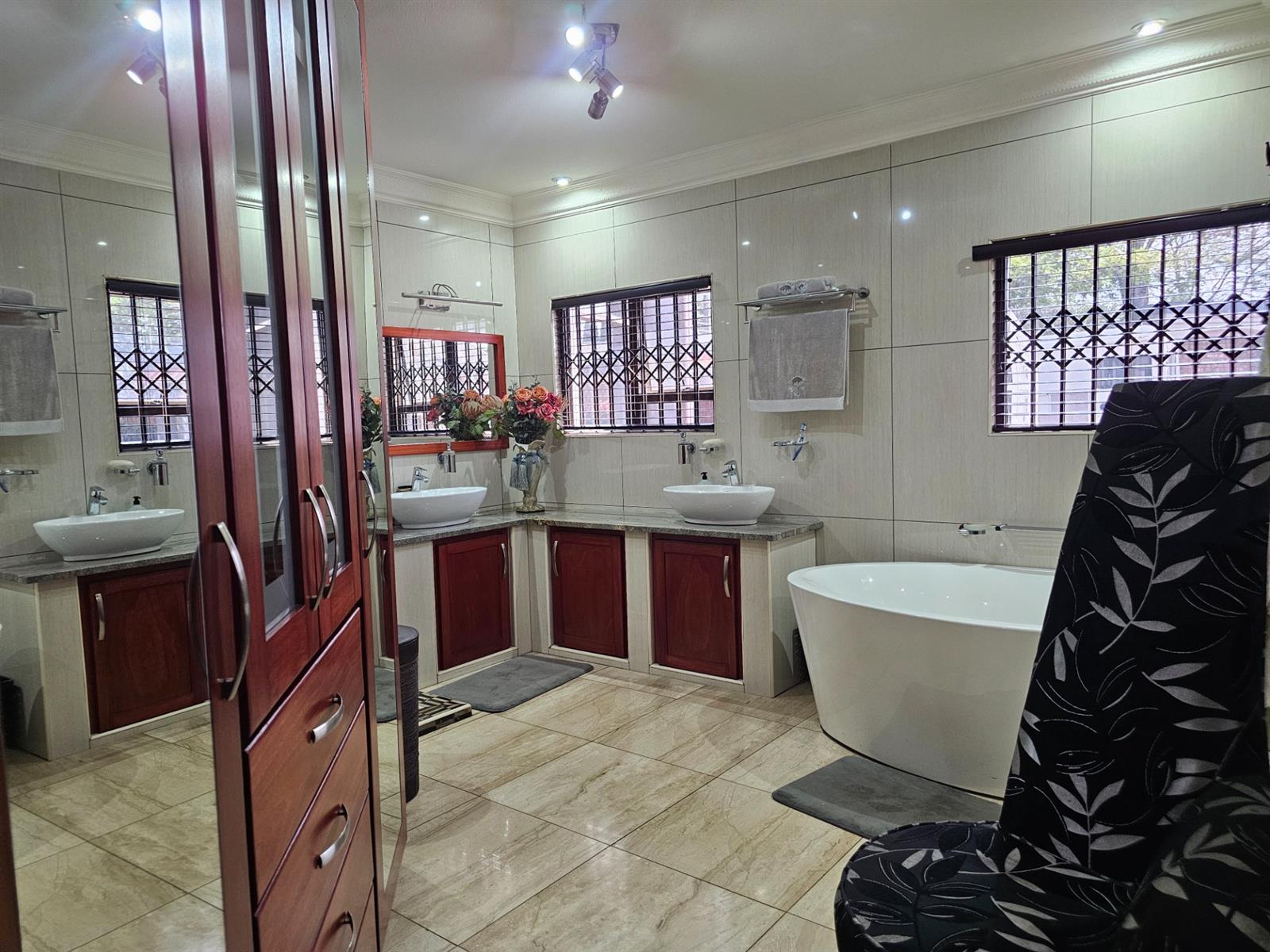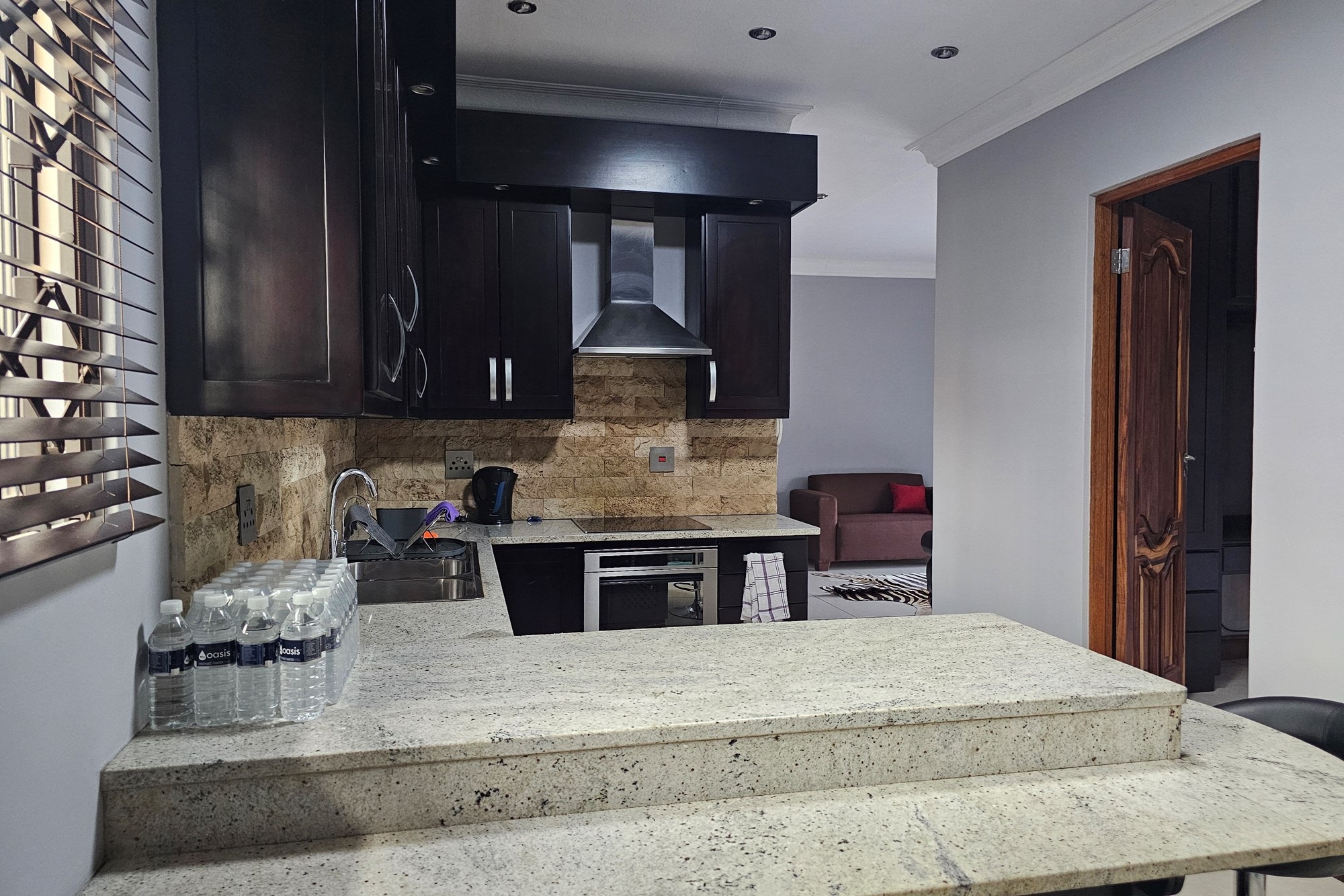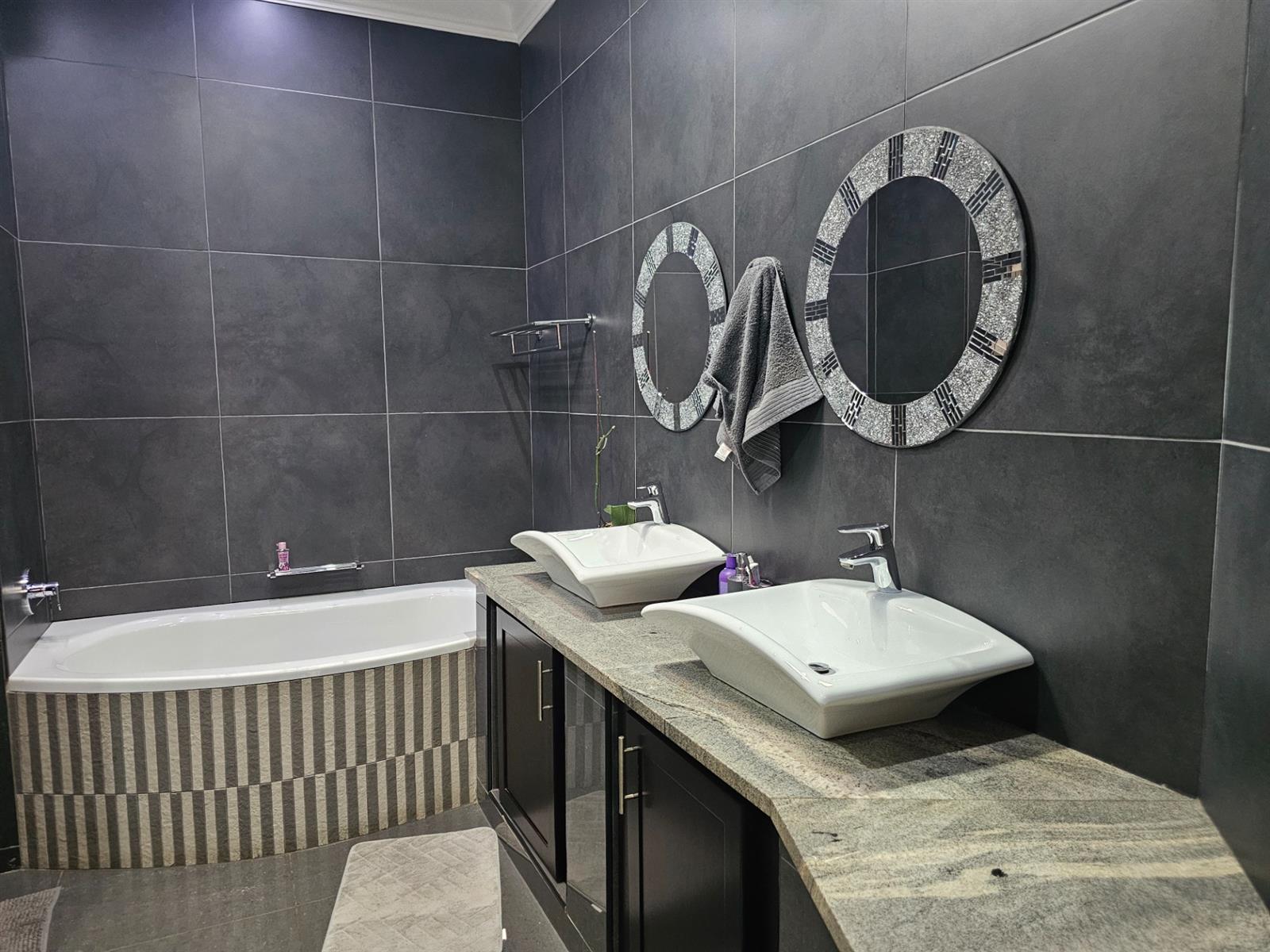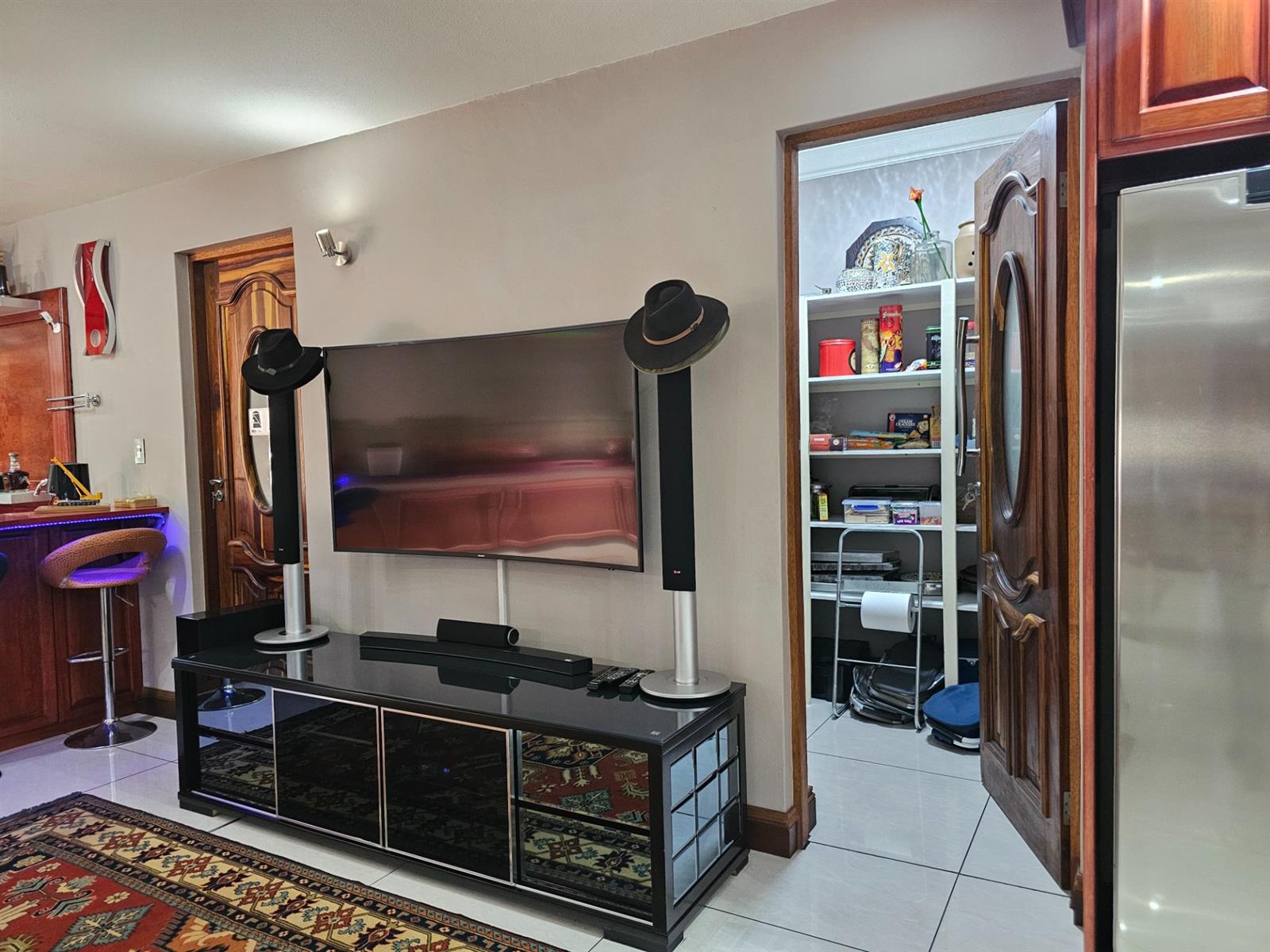 Designed for a family who values space, comfort and refined living, the expansive open-plan living areas flow effortlessly into a breathtaking kitchen. Featuring a gas and glass electric hob, eye-level oven and solid Rosewood cupboards, the kitchen is both functional and elegant, complemented by seamless porcelain tiles throughout. It extends into the TV room and a matching Rosewood bar, leading to an enclosed patio with a built-in braai—perfect for year-round entertaining. Outside, the manicured garden invites unforgettable moments with family and friends.
