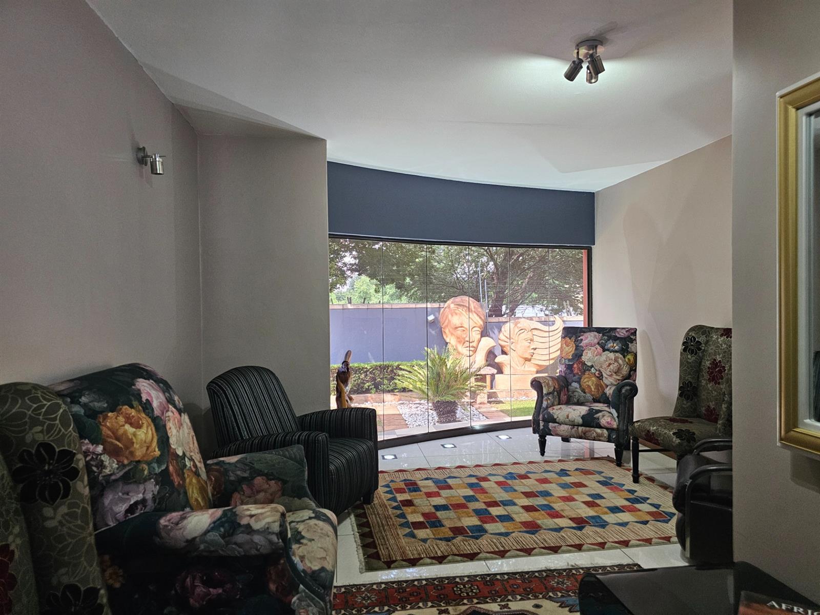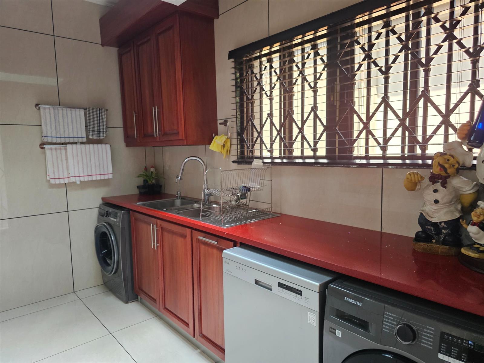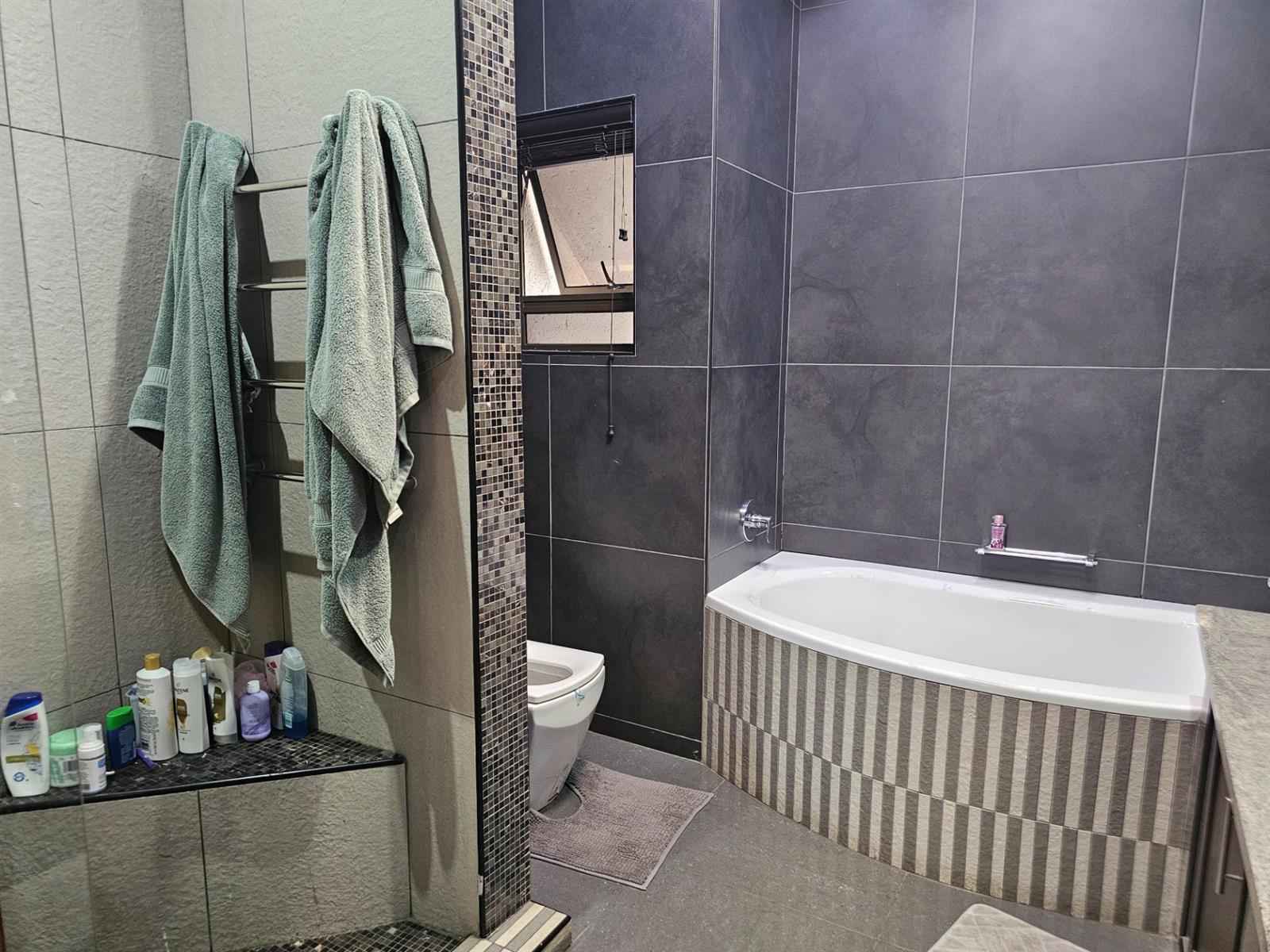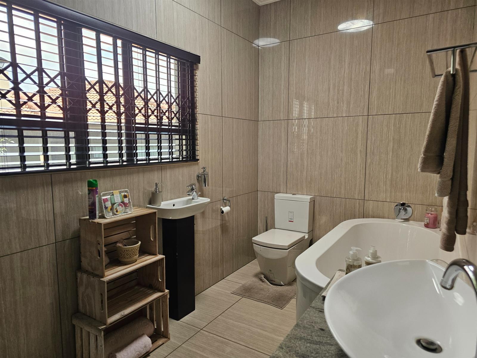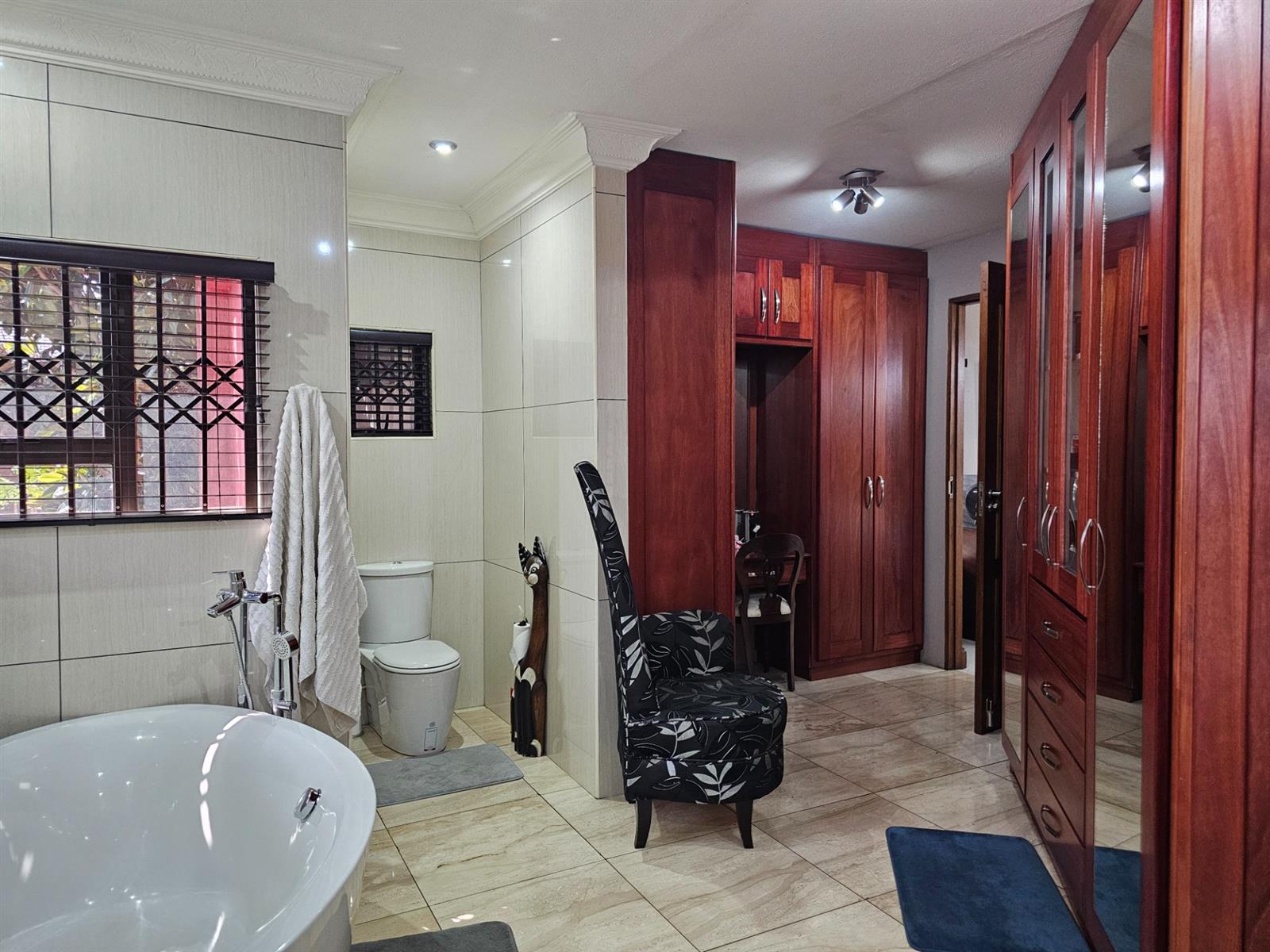Designed for a family who values space, comfort and refined living, the expansive open-plan living areas flow effortlessly into a breathtaking kitchen. Featuring a gas and glass electric hob, eye-level oven and solid Rosewood cupboards, the kitchen is both functional and elegant, complemented by seamless porcelain tiles throughout. It extends into the TV room and a matching Rosewood bar, leading to an enclosed patio with a built-in braai—perfect for year-round entertaining. Outside, the manicured garden invites unforgettable moments with family and friends.