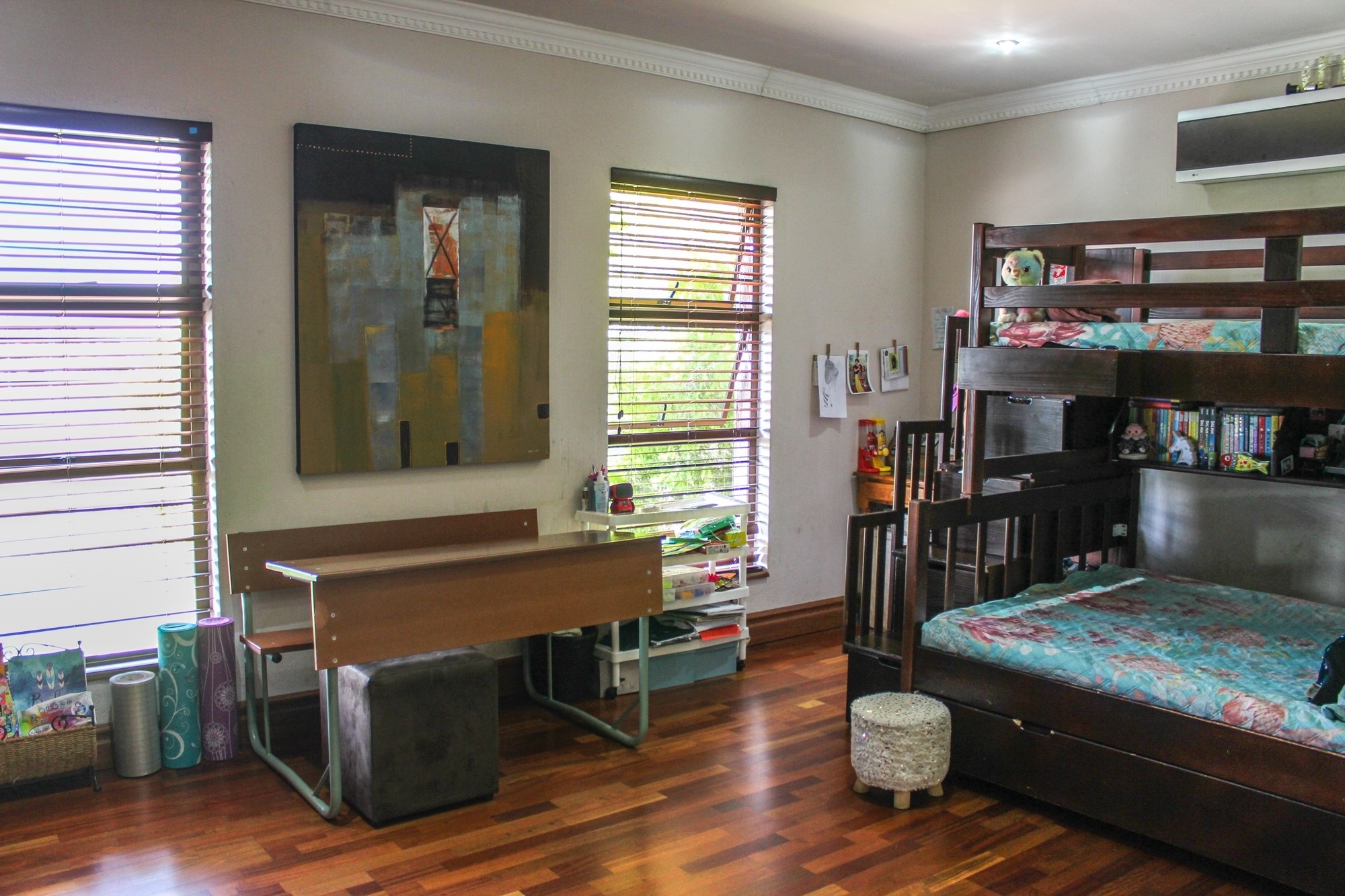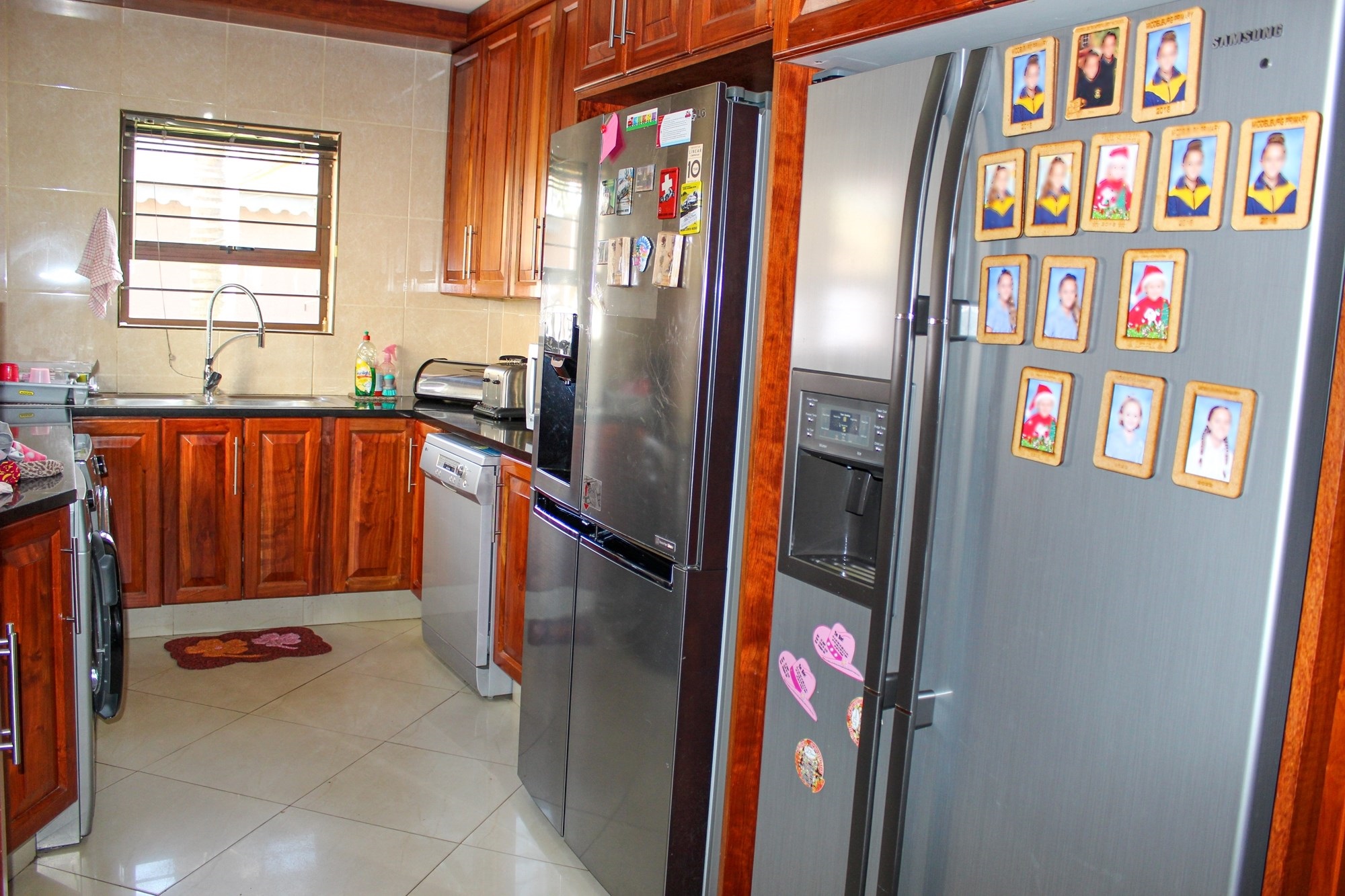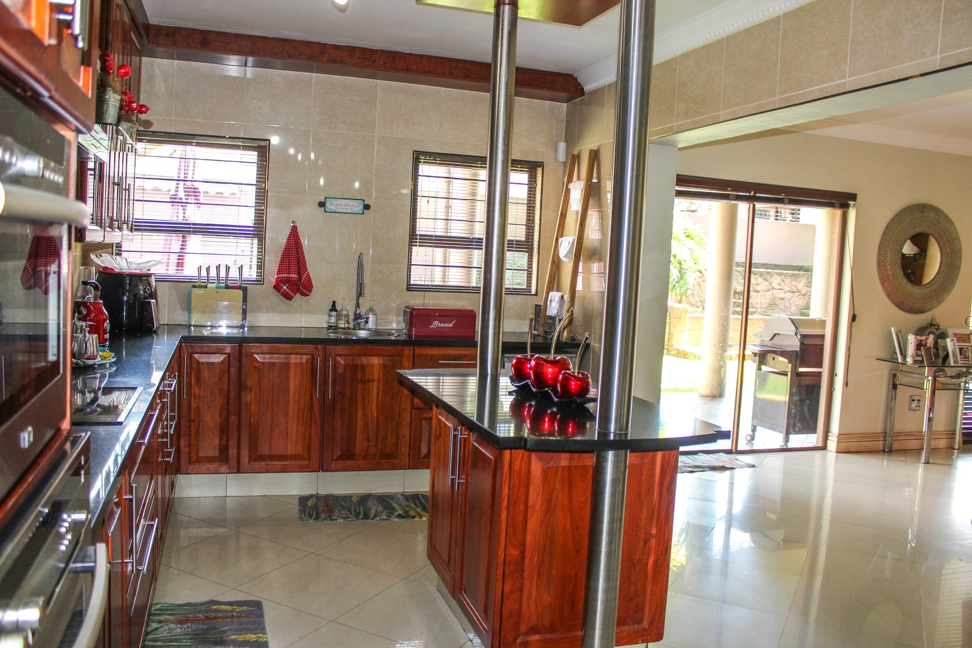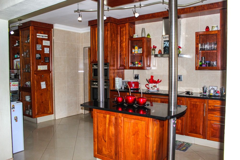 The ground floor is all about easy living and seamless flow. A spacious lounge with a cosy fireplace invites relaxed family moments, while the dining area opens effortlessly onto the lush, manicured garden through sliding doors. The gourmet kitchen is a true heart of the home, boasting solid wood cupboards, granite countertops, a central island, and a separate scullery and laundry — perfect for both busy family life and entertaining on a grand scale.