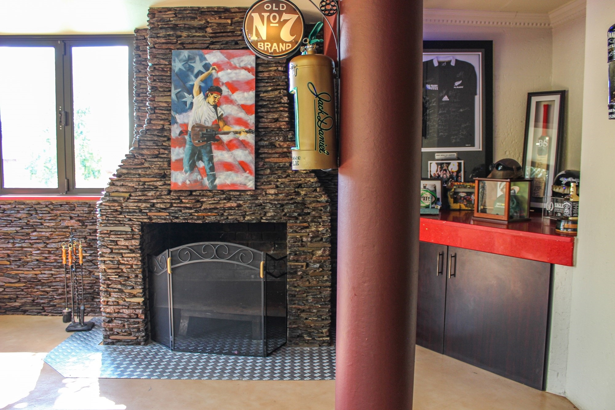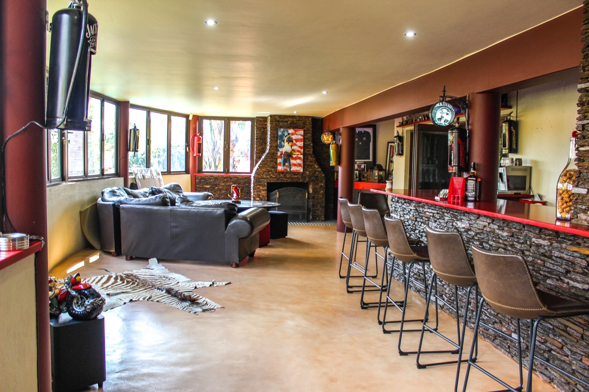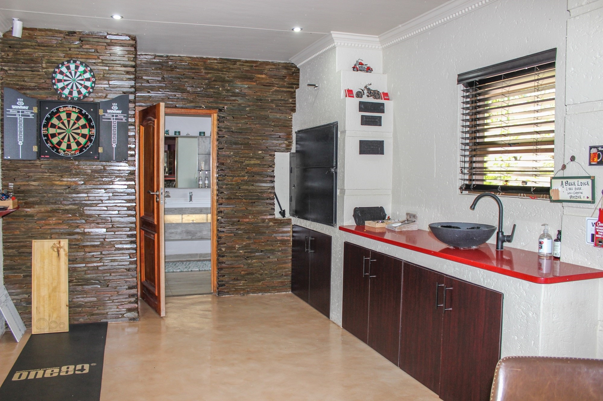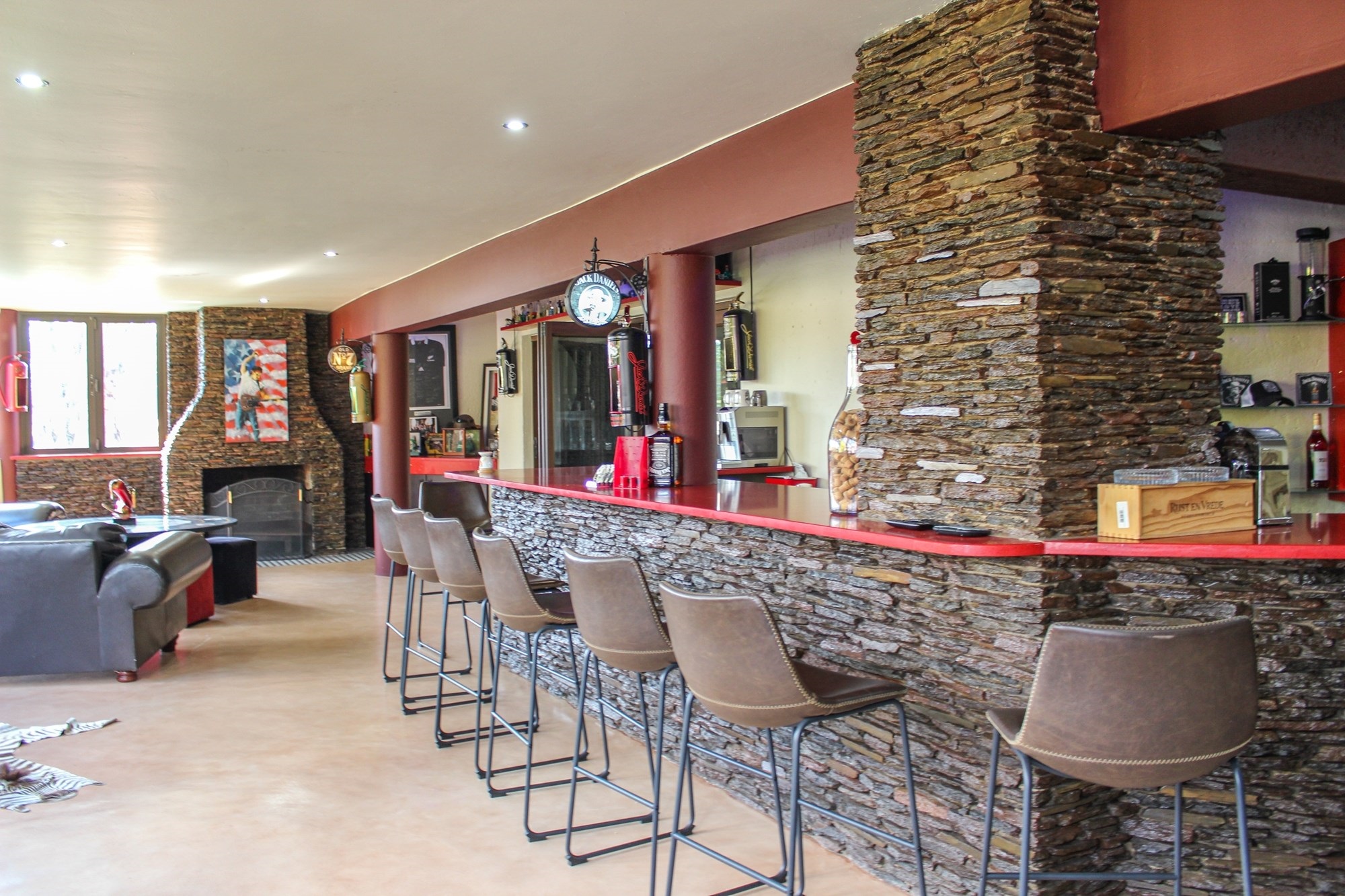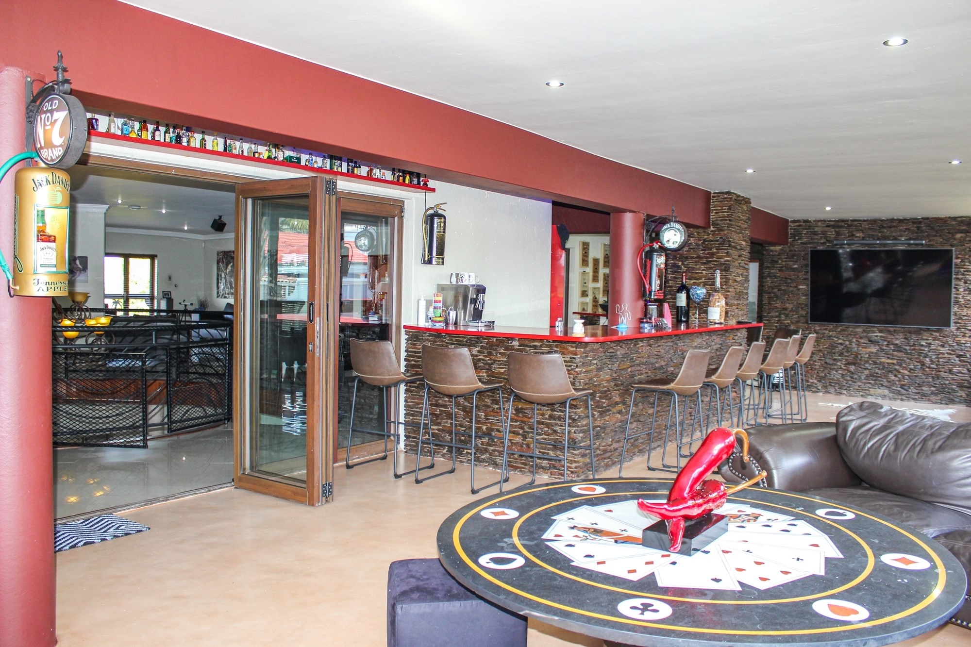 Upstairs, the entertainment continues in style. A fully equipped bar seating 13 guests, framed by expansive stacker windows, opens the space to fresh air and sunshine. A fireplace adds warmth and ambiance to the upstairs lounge, which flows out onto a private balcony — perfect for sunset drinks or lively gatherings. A guest bathroom ensures convenience for visitors.