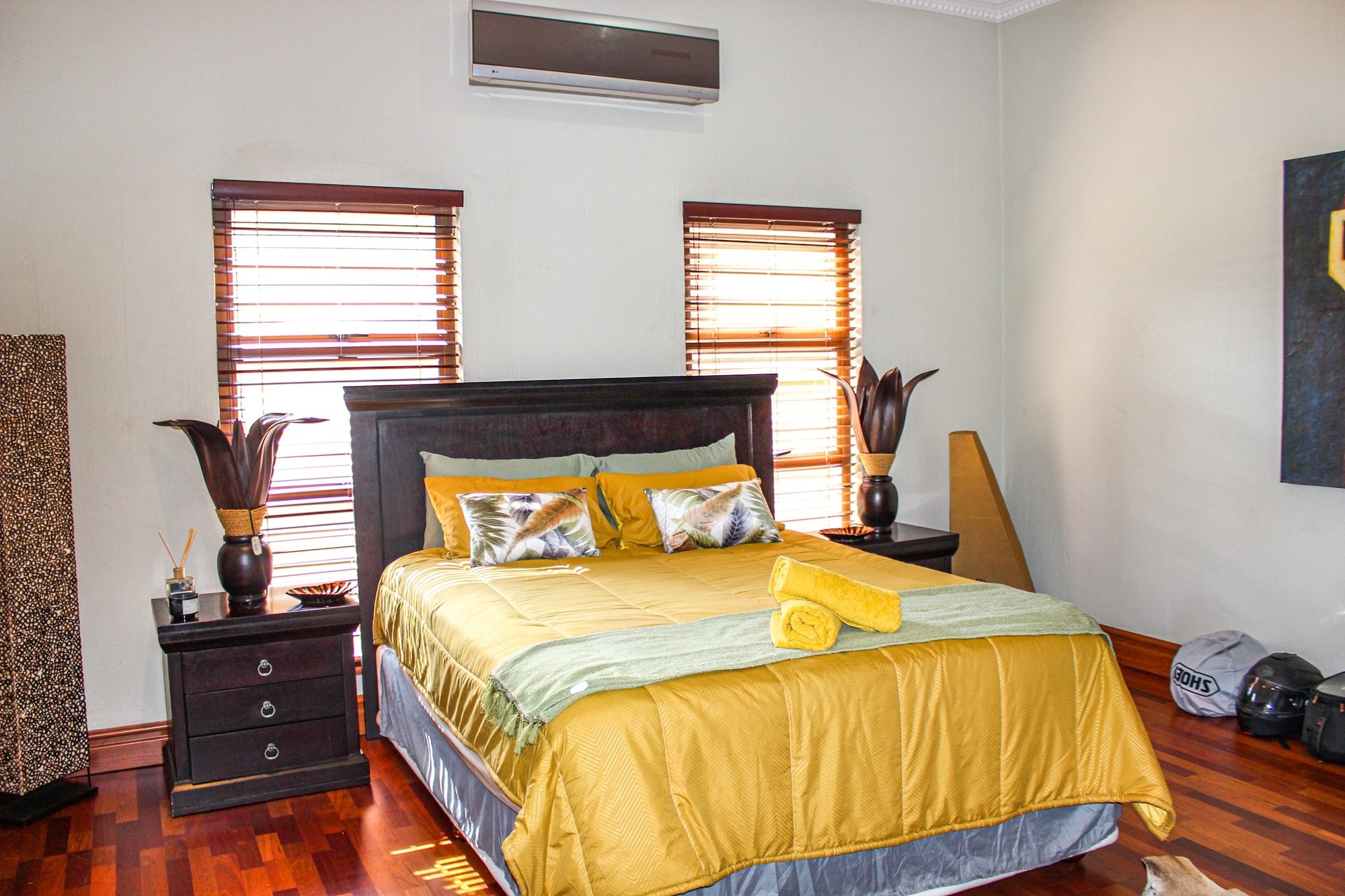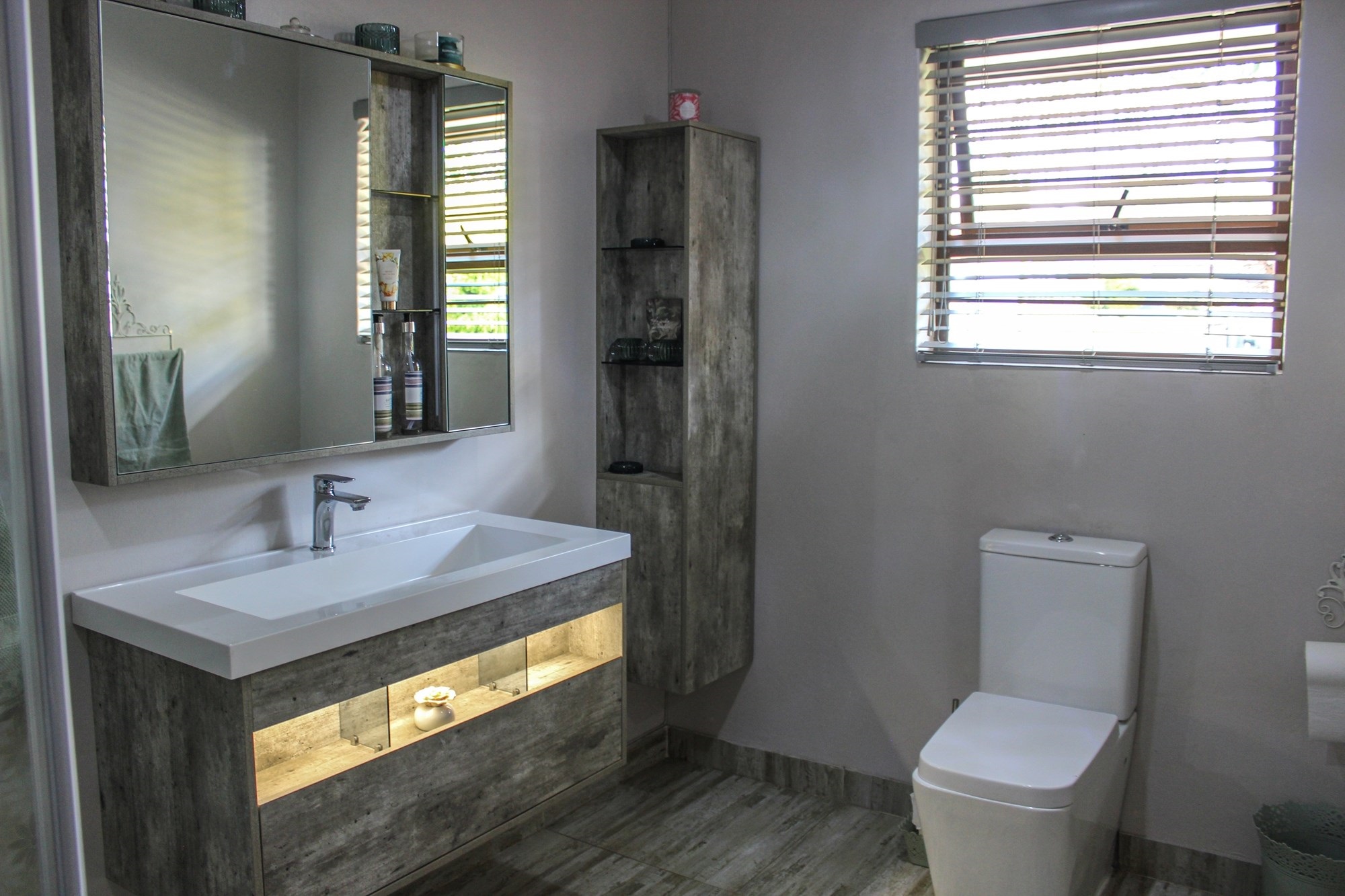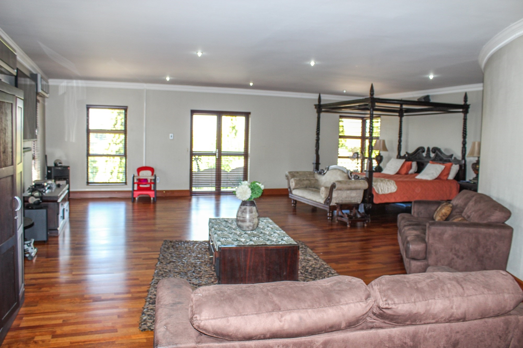 Accommodation includes four air-conditioned bedrooms. Downstairs features a private en-suite guest suite, while upstairs offers two additional en-suite bedrooms and a shared bathroom for the entertainment area. The master suite is a sanctuary of its own, complete with a private lounge, balcony, walk-in closet, and a lavish en-suite featuring a spa bath, double jet shower, and twin basins.