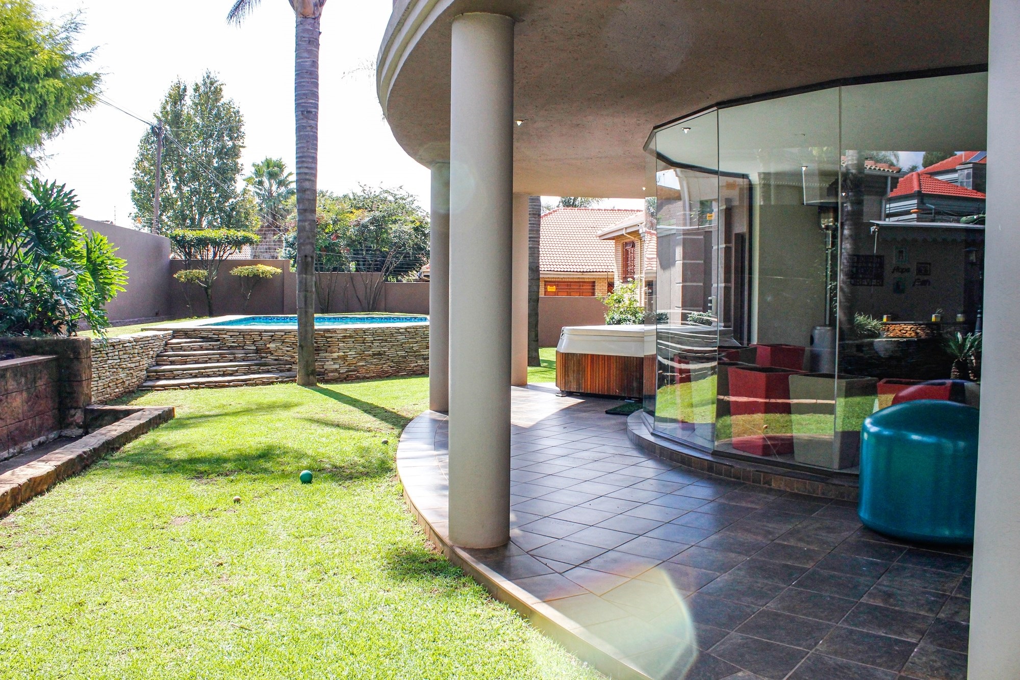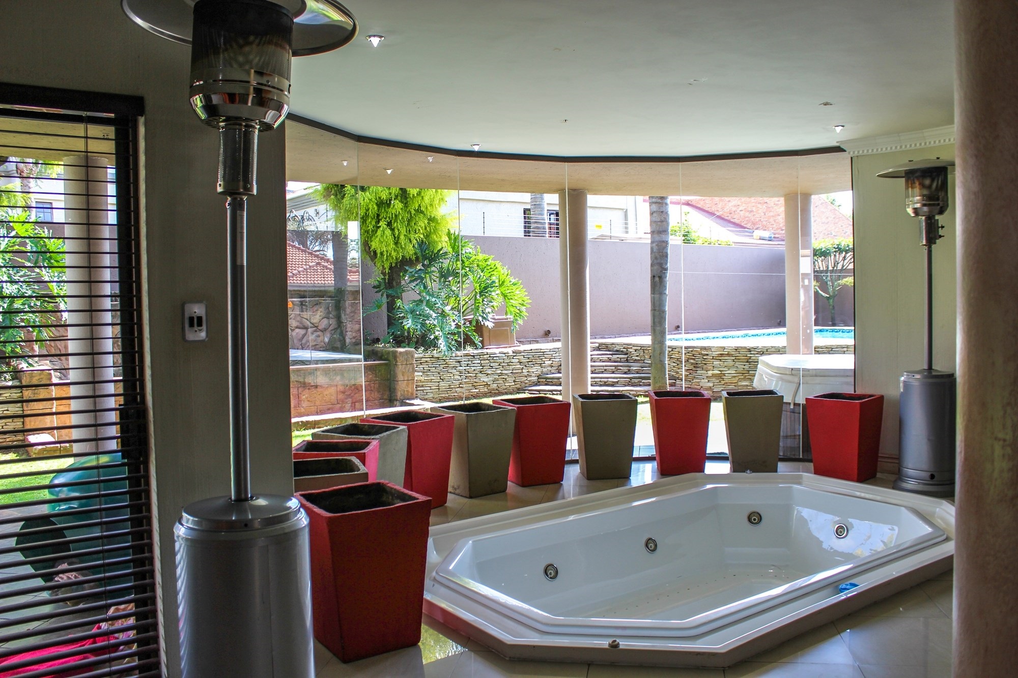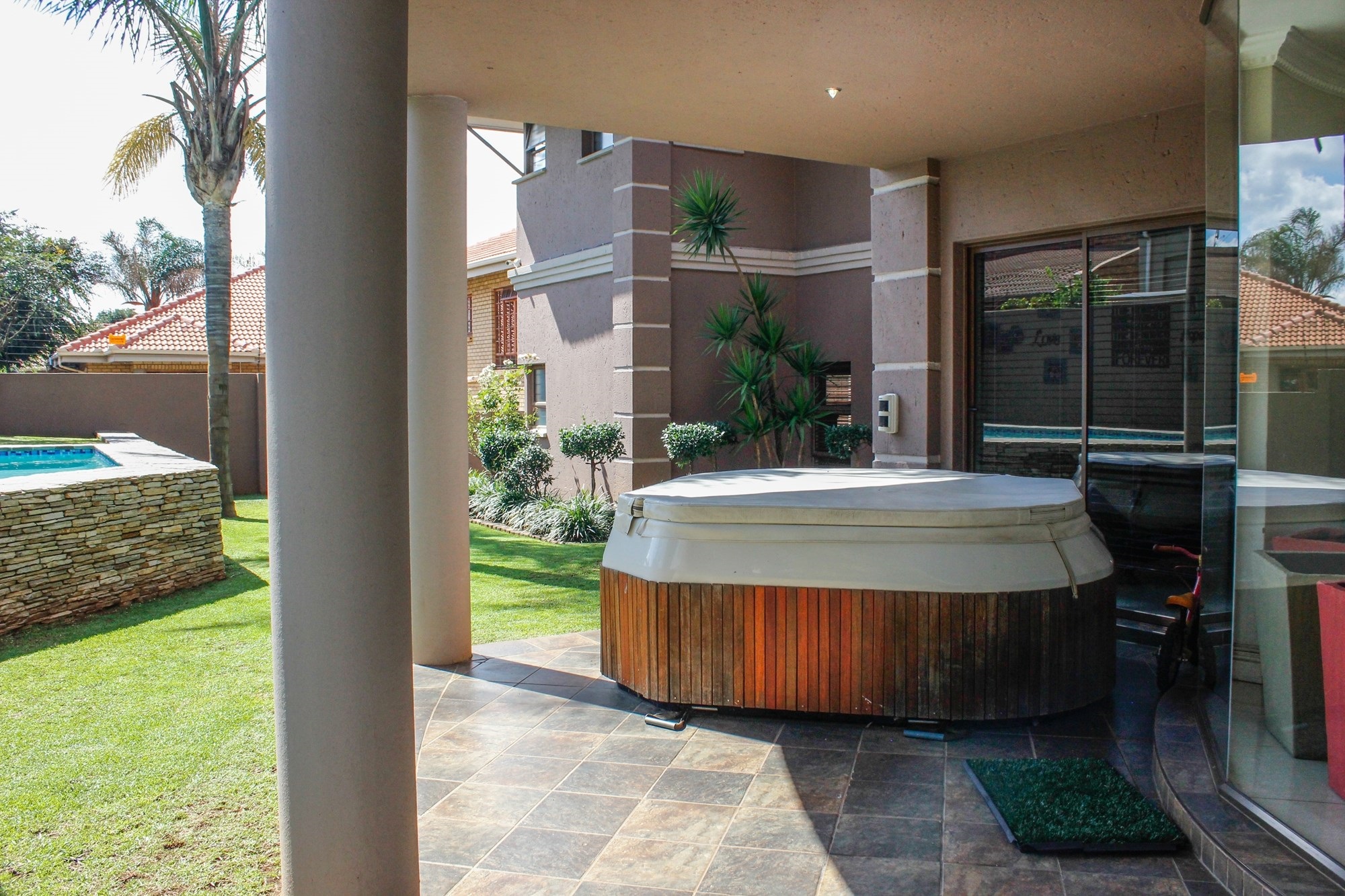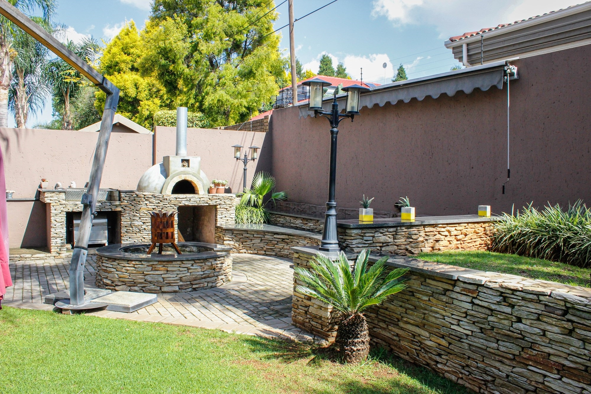 Outside, the entertainment offering is simply unbeatable: a raised swimming pool, 6-seater jacuzzi, pizza oven, firepit, built-in braai, soothing water feature, and a covered patio combine to create an entertainer’s dream setting.