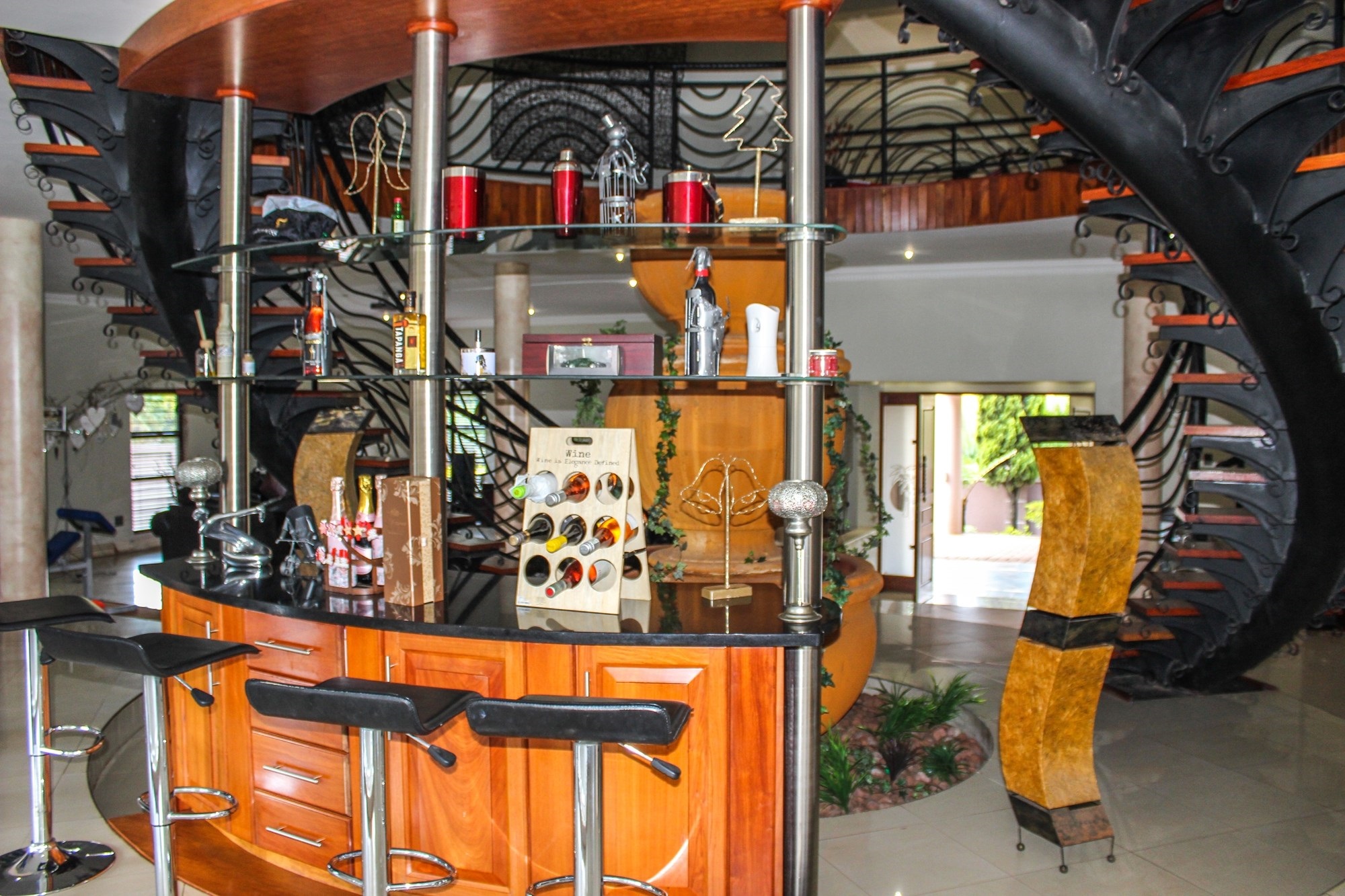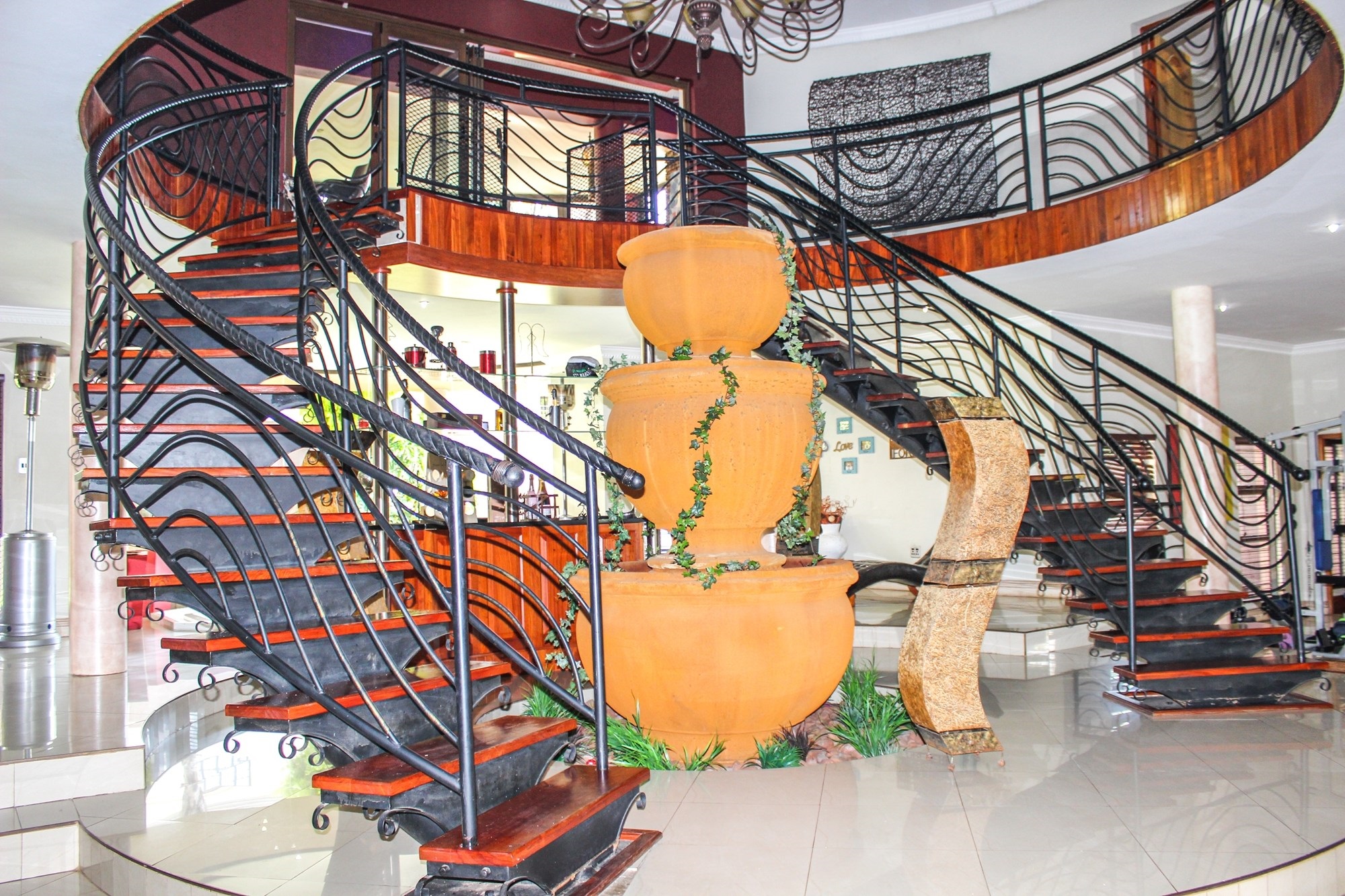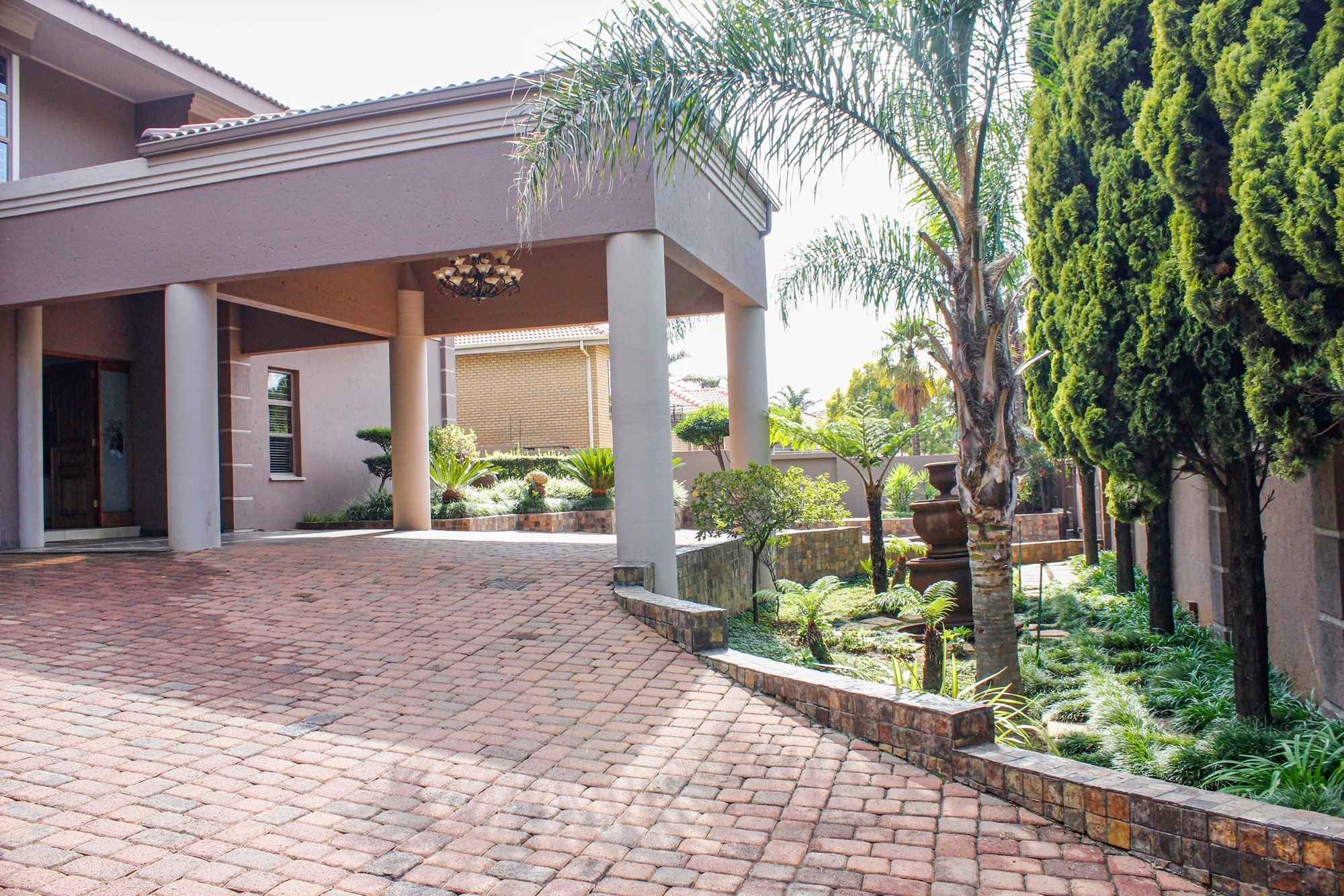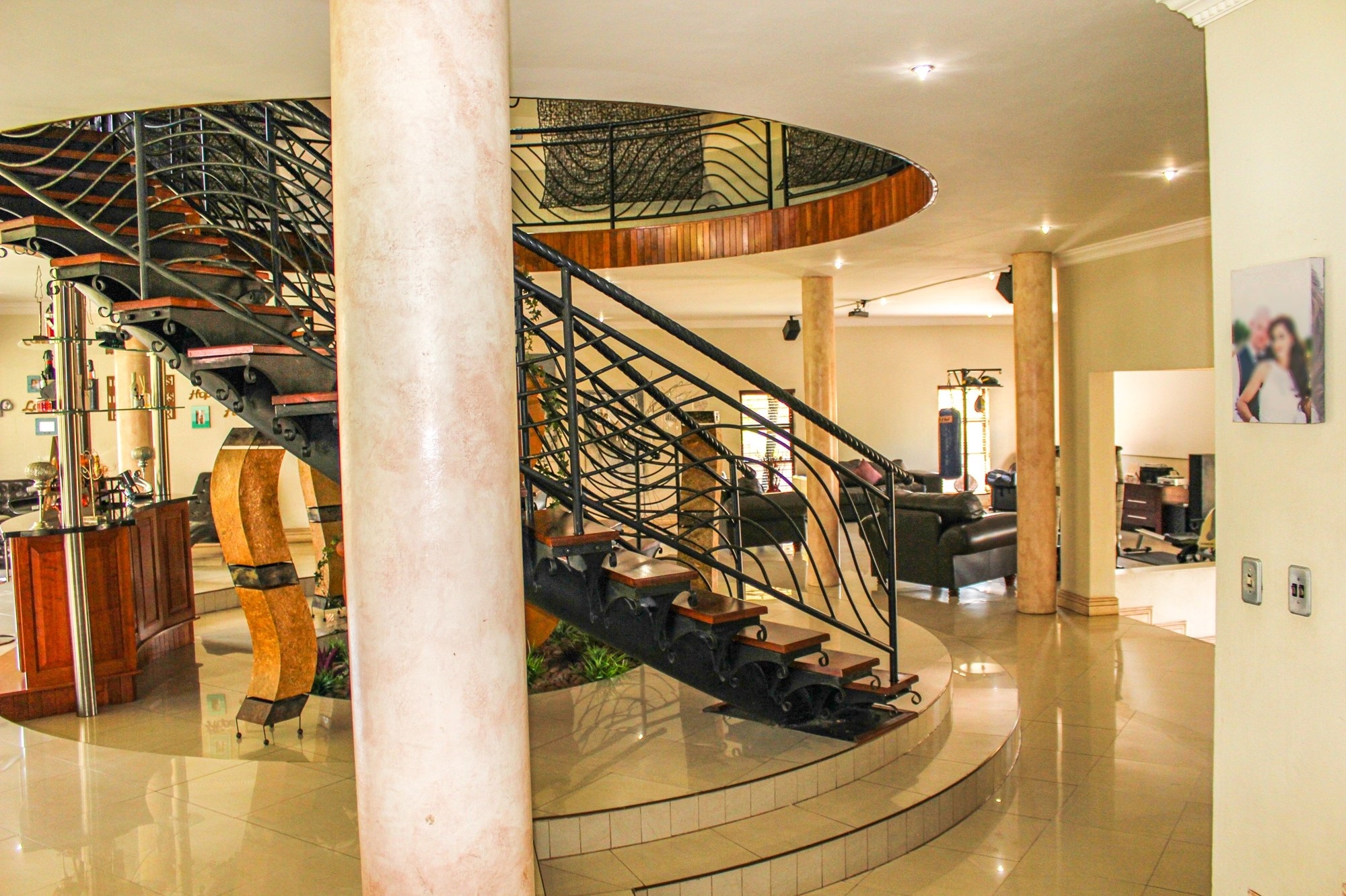 From the moment you arrive, the impressive porte cochere sets the tone, offering elegant, sheltered access to the entrance. Step through solid double wooden doors into a breathtaking foyer, where a sweeping circular staircase embraces a tranquil indoor garden — a striking architectural feature that instantly captures attention. Thoughtfully designed with toddler gates at the top of the staircase, this home blends sophistication with everyday practicality.