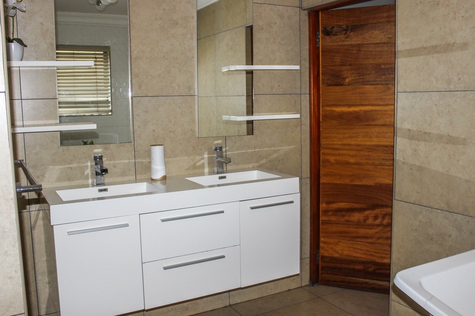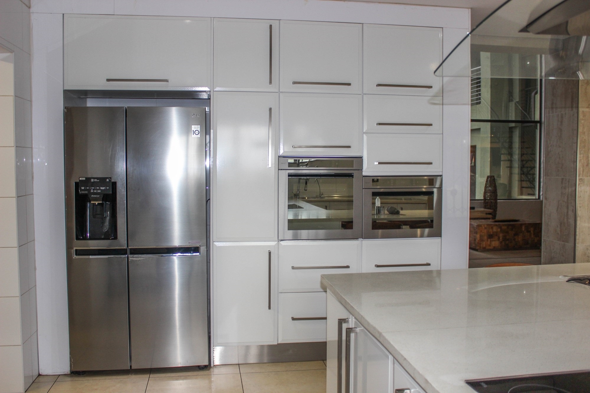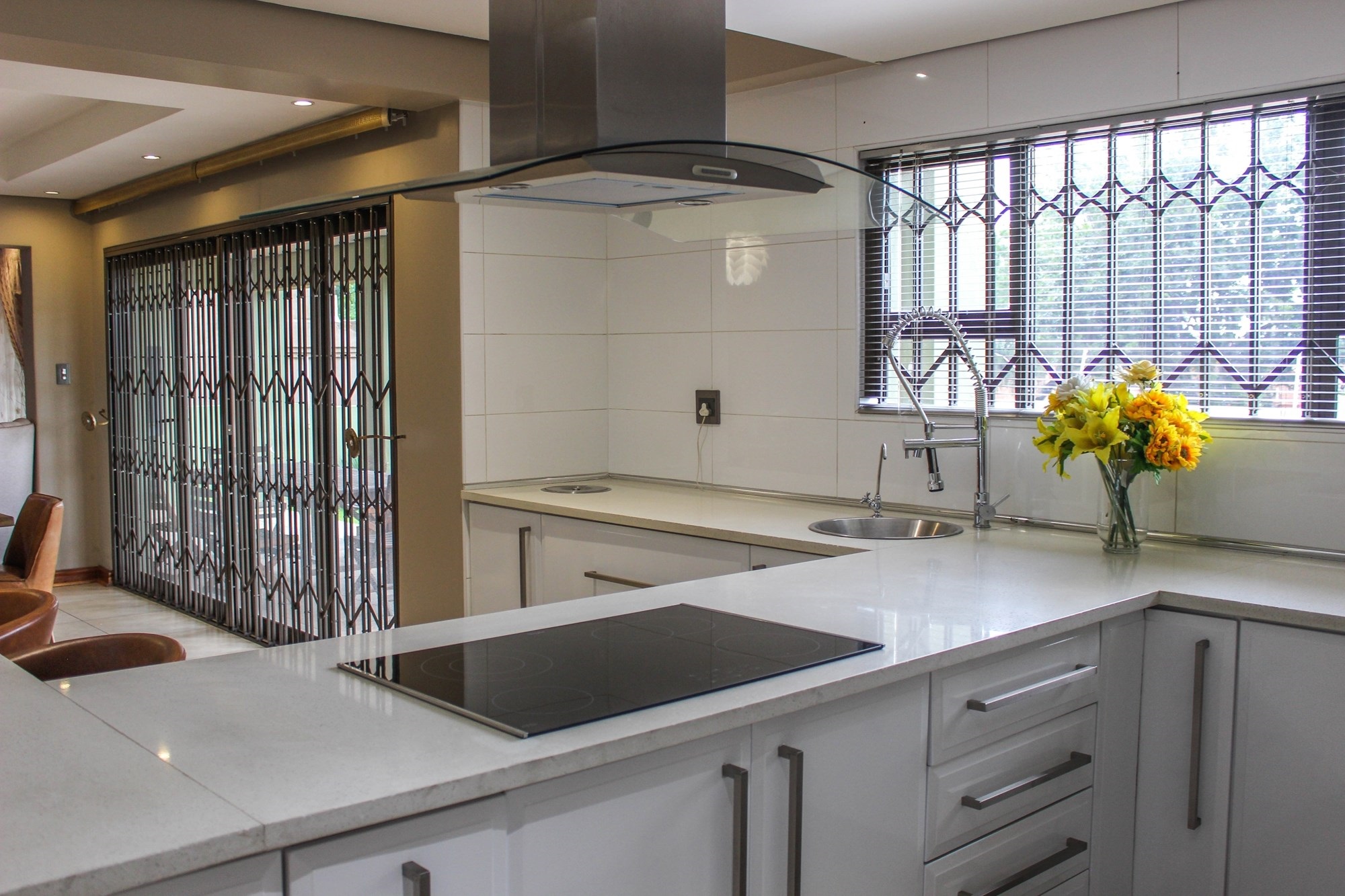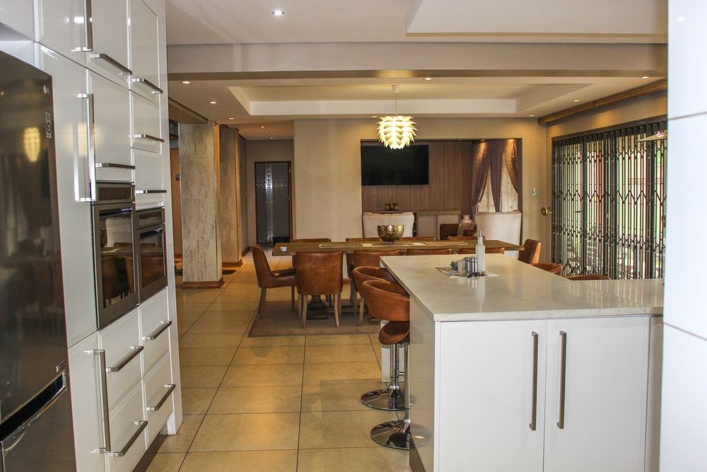 The heart of the home is undoubtedly the stunning chef-style kitchen, equipped with an L-shaped centre island and breakfast nook, Caesarstone countertops, white high-gloss cabinetry, and top-tier appliances including a glass hob, built-in oven, and microwave. A large scullery offers ample storage and functional space for all your appliances, with direct access to the double garage and backyard. Downstairs, two well-sized bedrooms share a full en-suite bathroom that also serves as a guest bath.