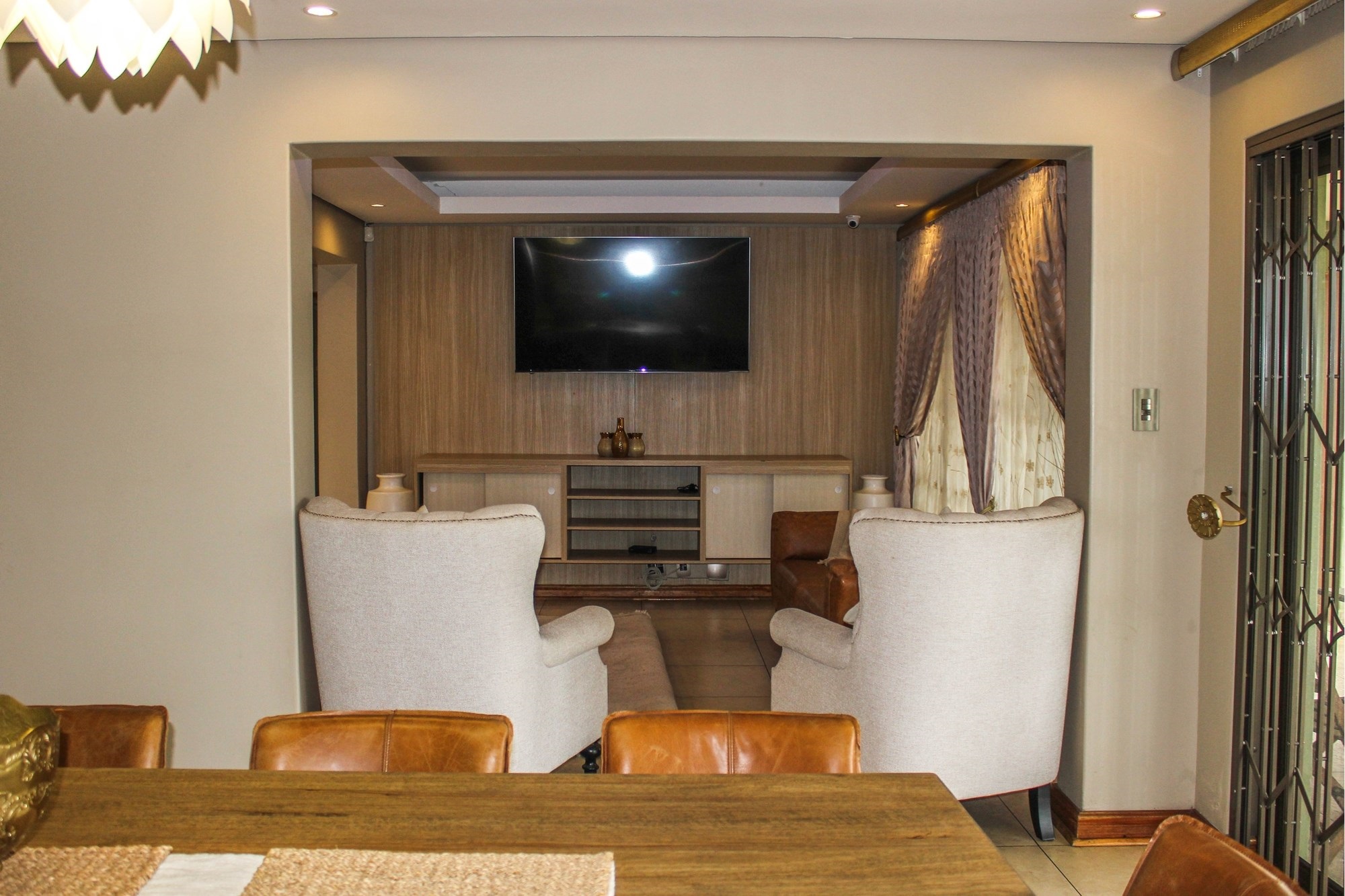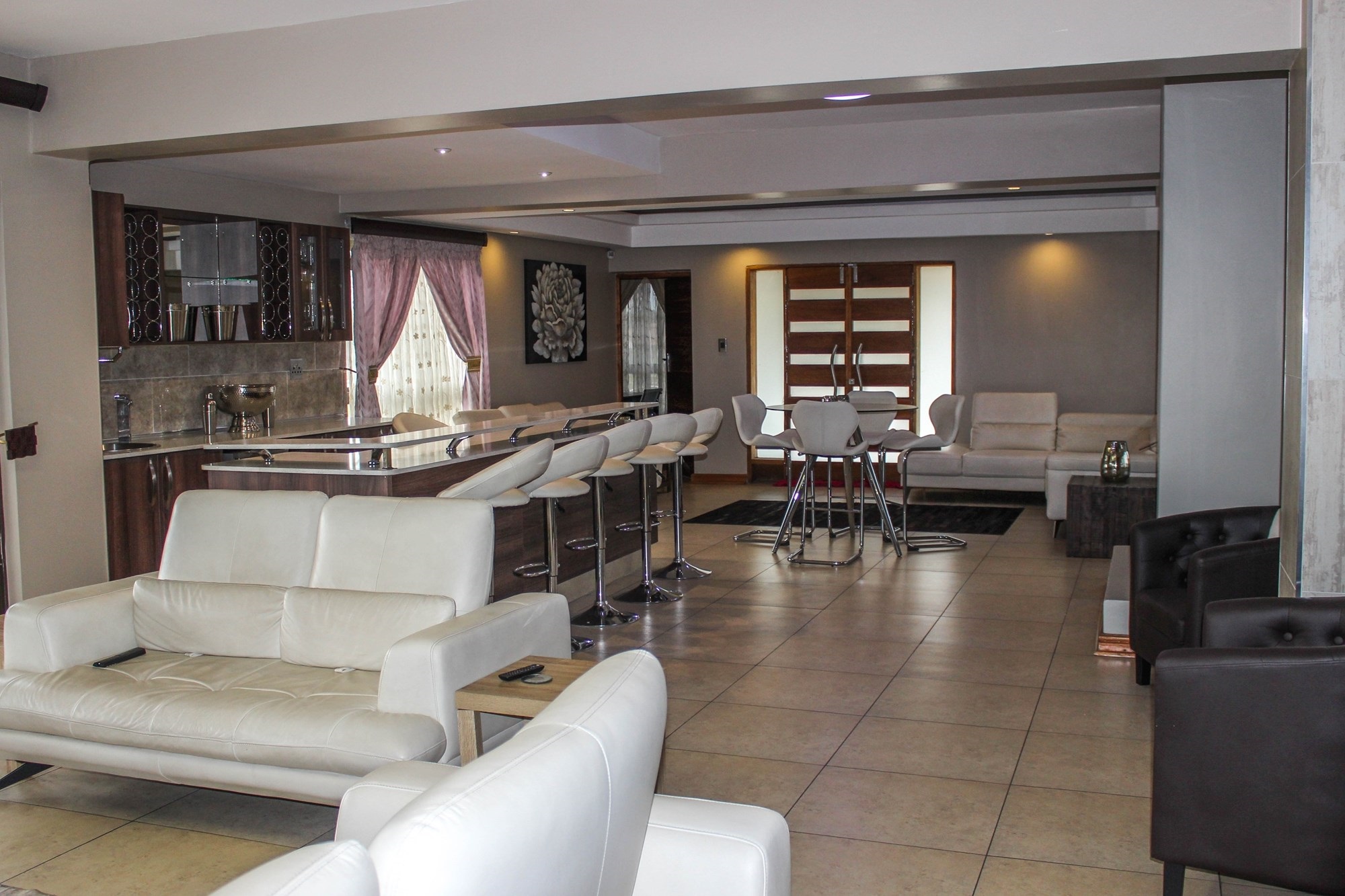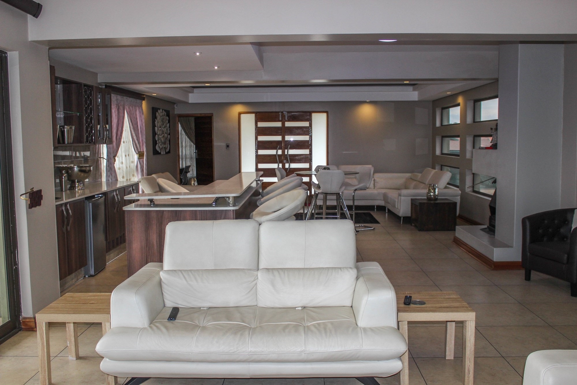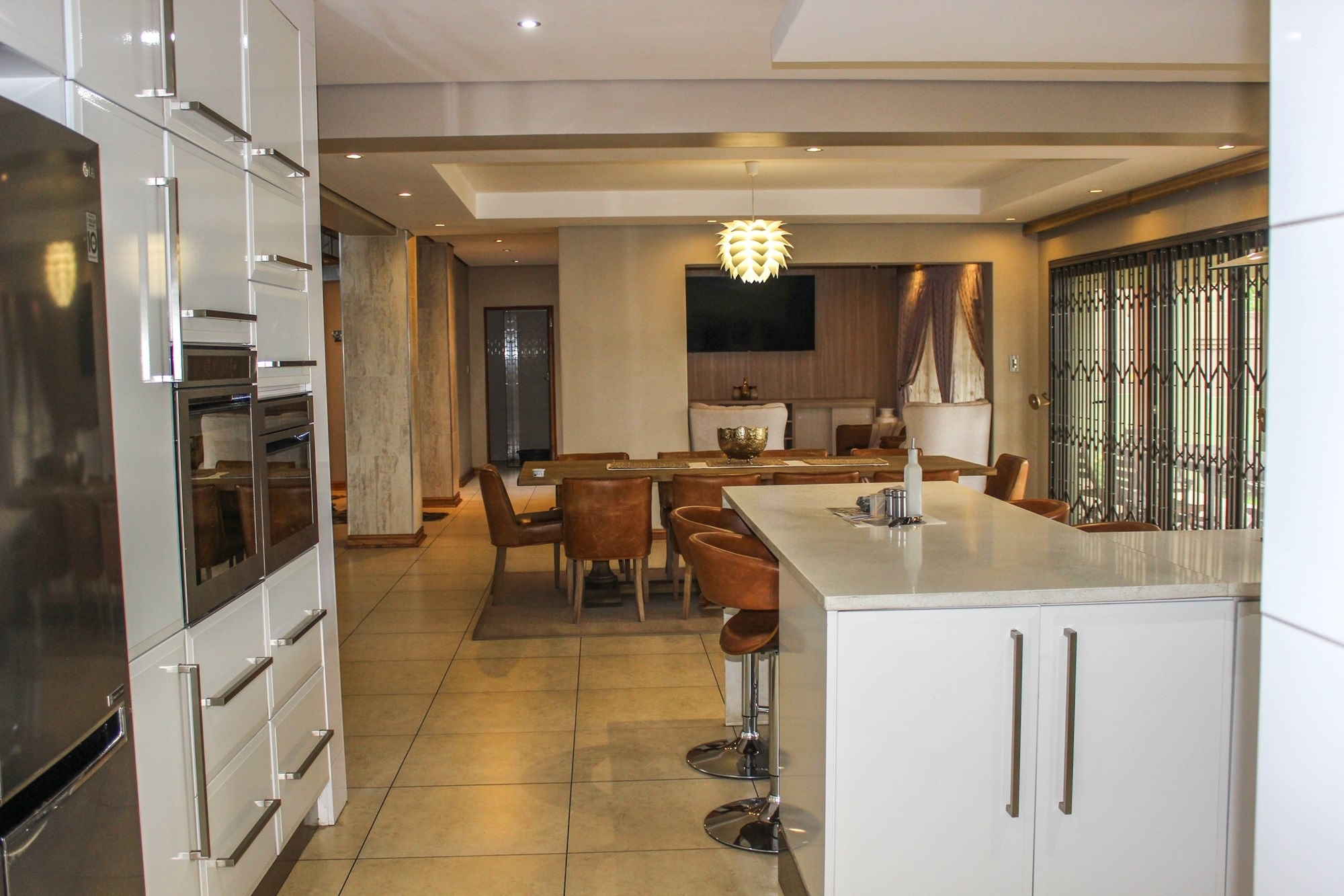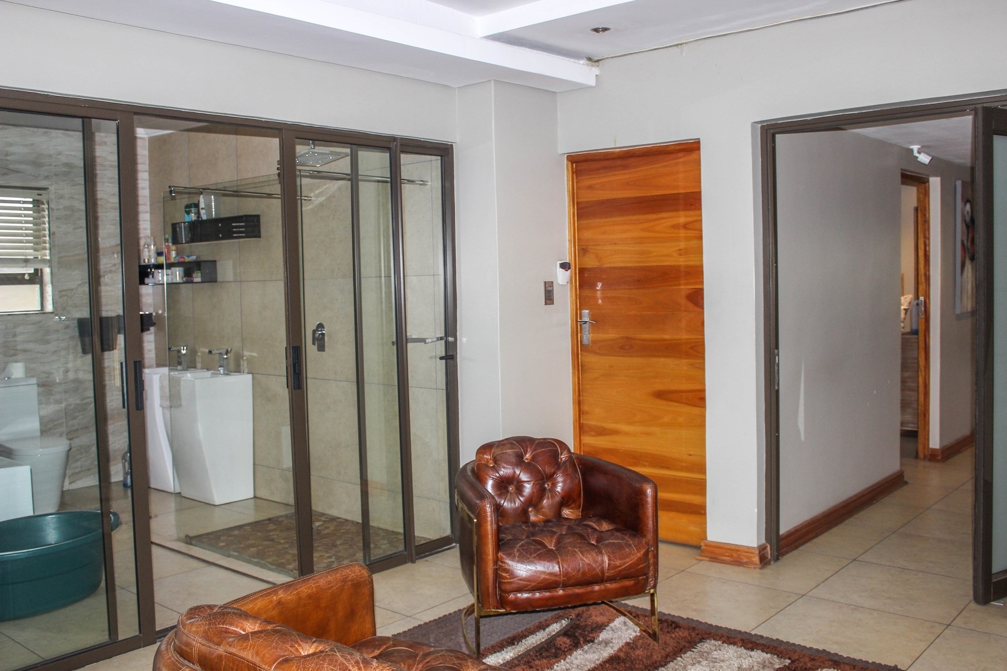 Step into a world where contemporary elegance and comfort converge in this immaculate double-storey masterpiece, nestled in the heart of sought-after Aerorand. From the moment you enter through the grand double wooden doors, you’re greeted by light-filled, flowing spaces designed for both family life and effortless entertaining. The seamless layout begins with a generous lounge and dining area that opens via stacking doors onto a covered patio and glistening swimming pool – an entertainer’s paradise! The cozy TV room features a stylish built-in unit, perfect for relaxed movie nights.