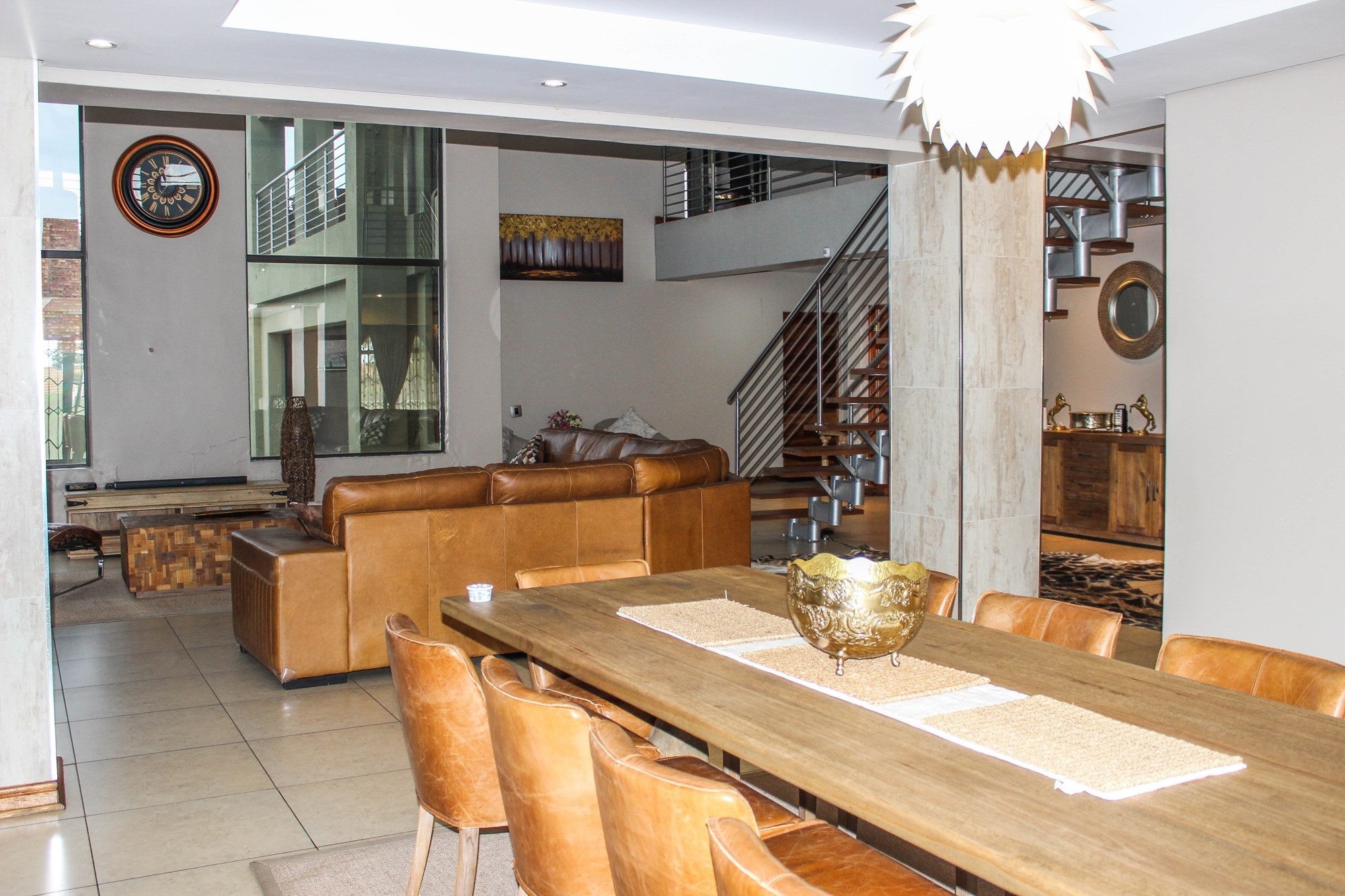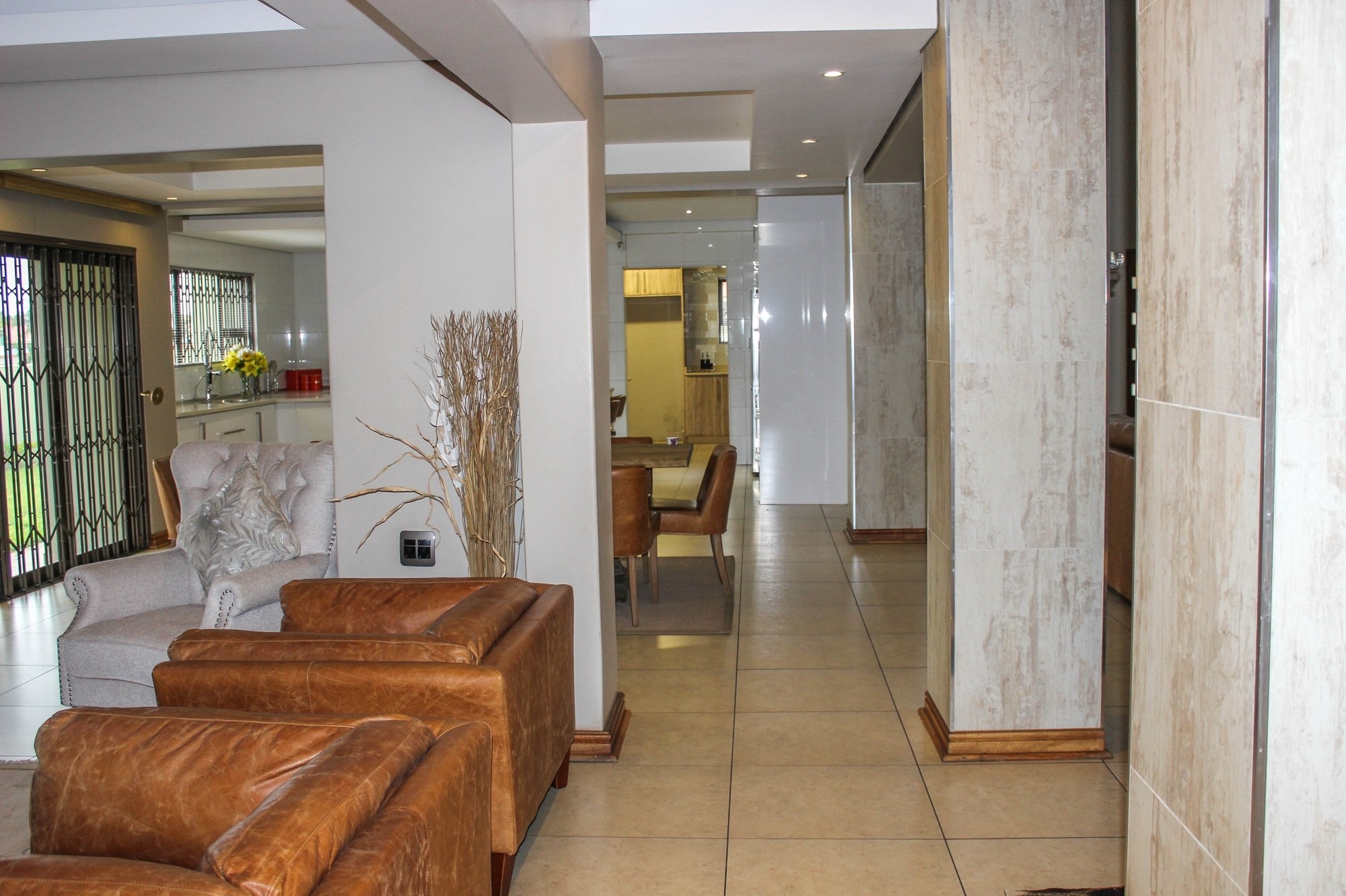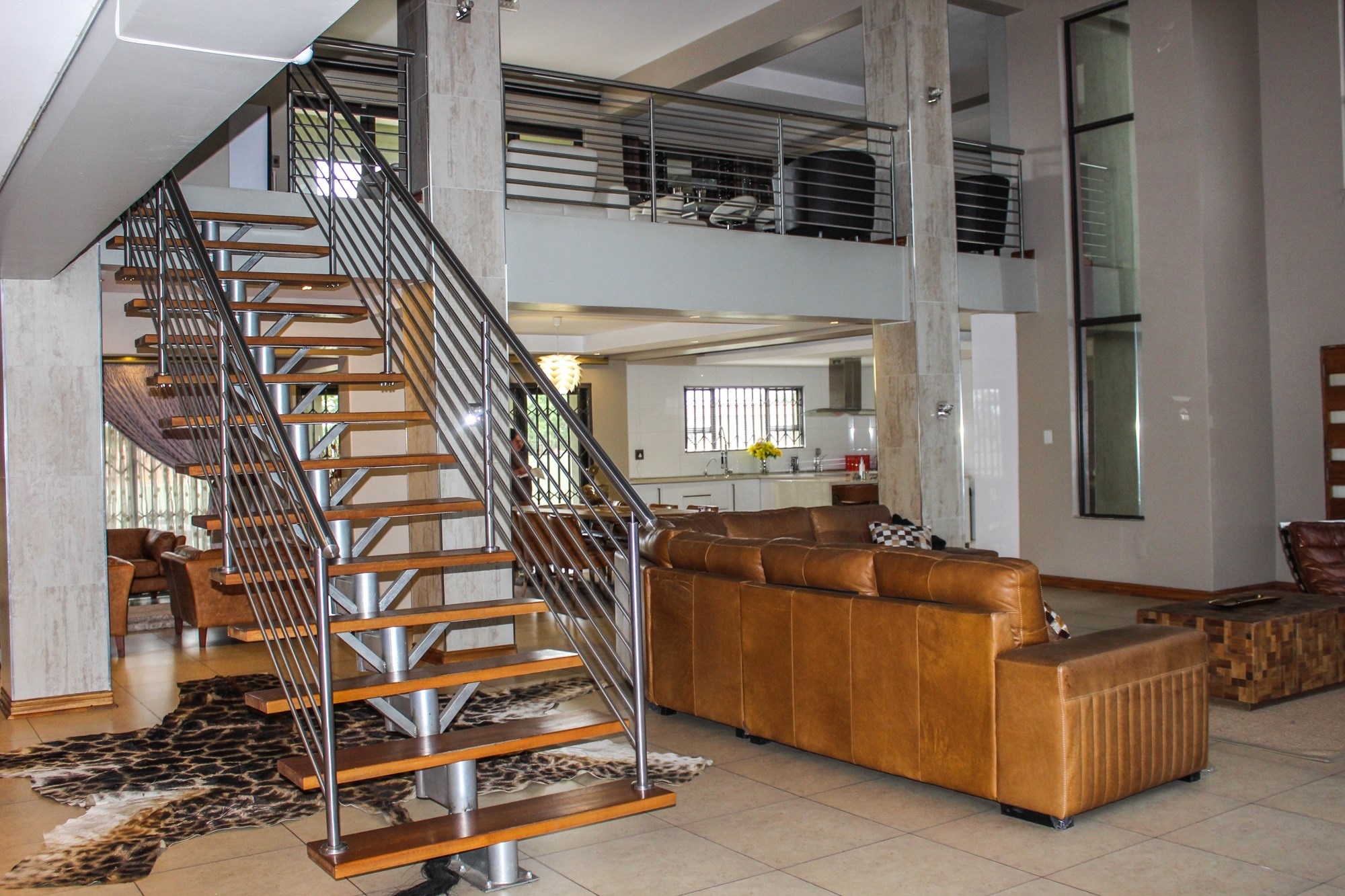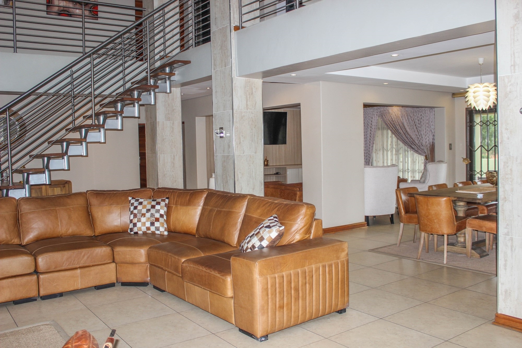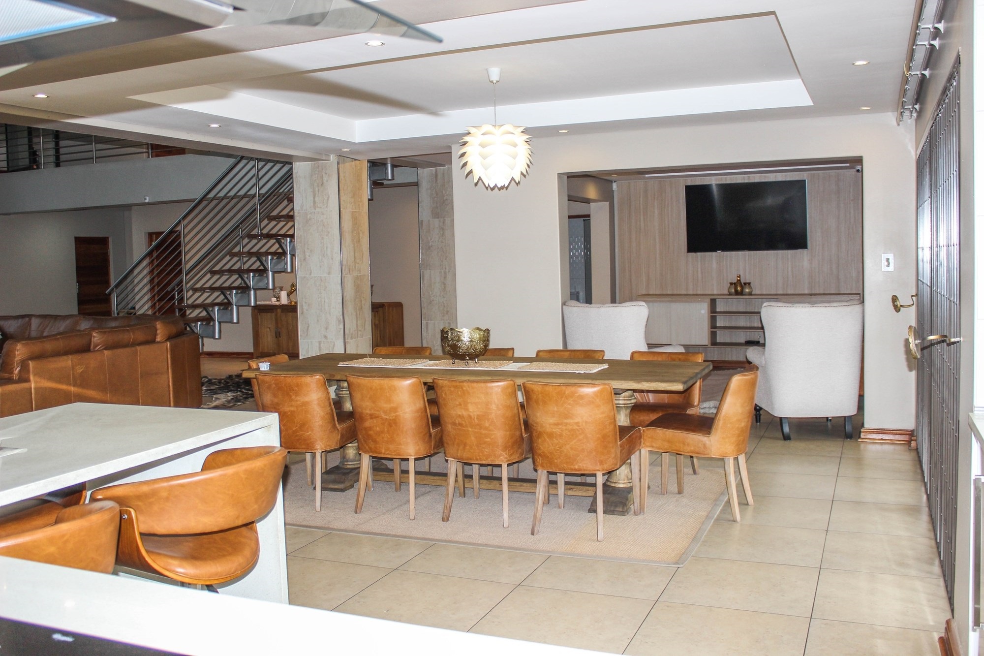 Step into a world where contemporary elegance and comfort converge in this immaculate double-storey masterpiece, nestled in the heart of sought-after Aerorand. From the moment you enter through the grand double wooden doors, you’re greeted by light-filled, flowing spaces designed for both family life and effortless entertaining. The seamless layout begins with a generous lounge and dining area that opens via stacking doors onto a covered patio and glistening swimming pool – an entertainer’s paradise! The cozy TV room features a stylish built-in unit, perfect for relaxed movie nights.