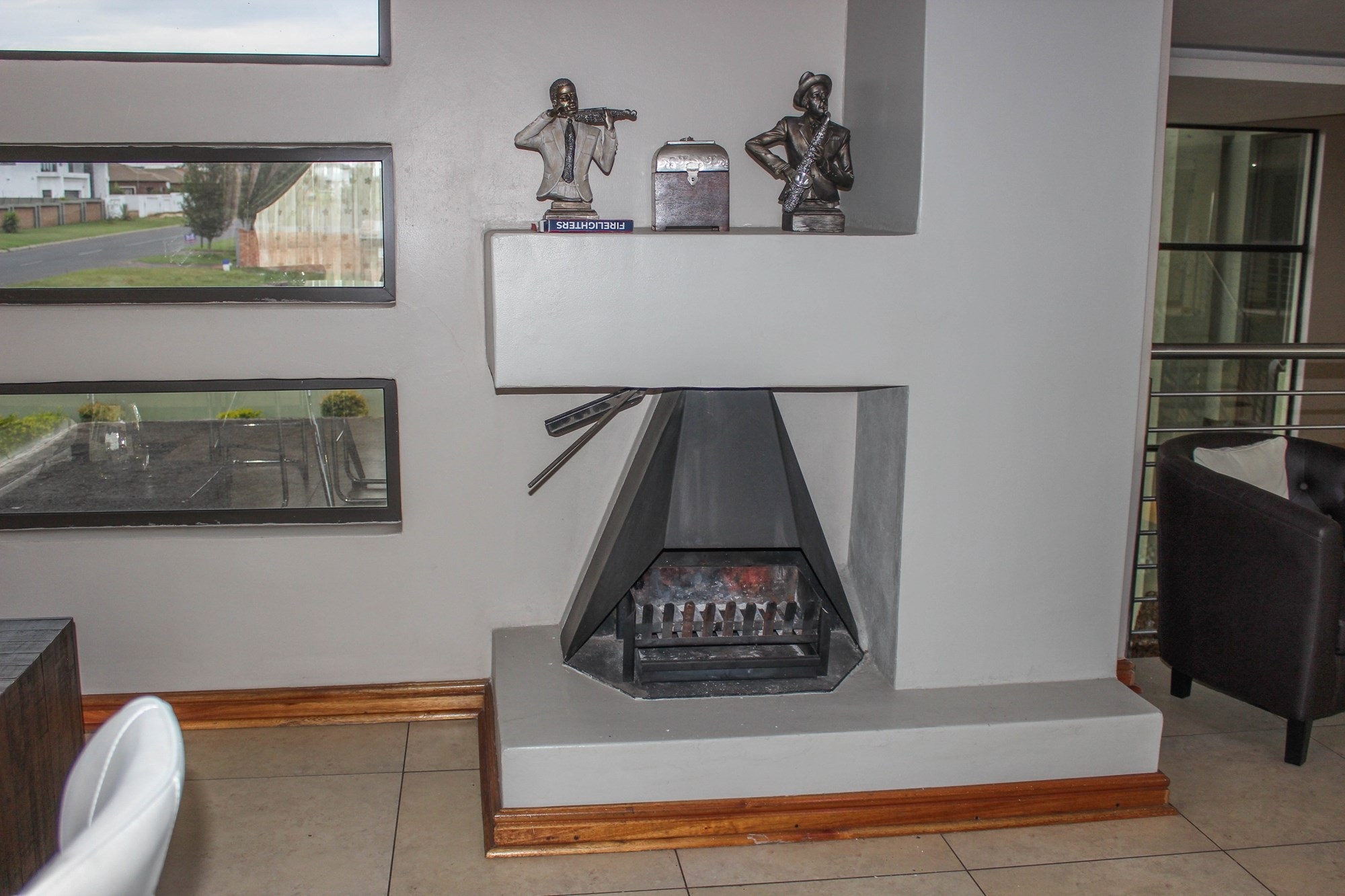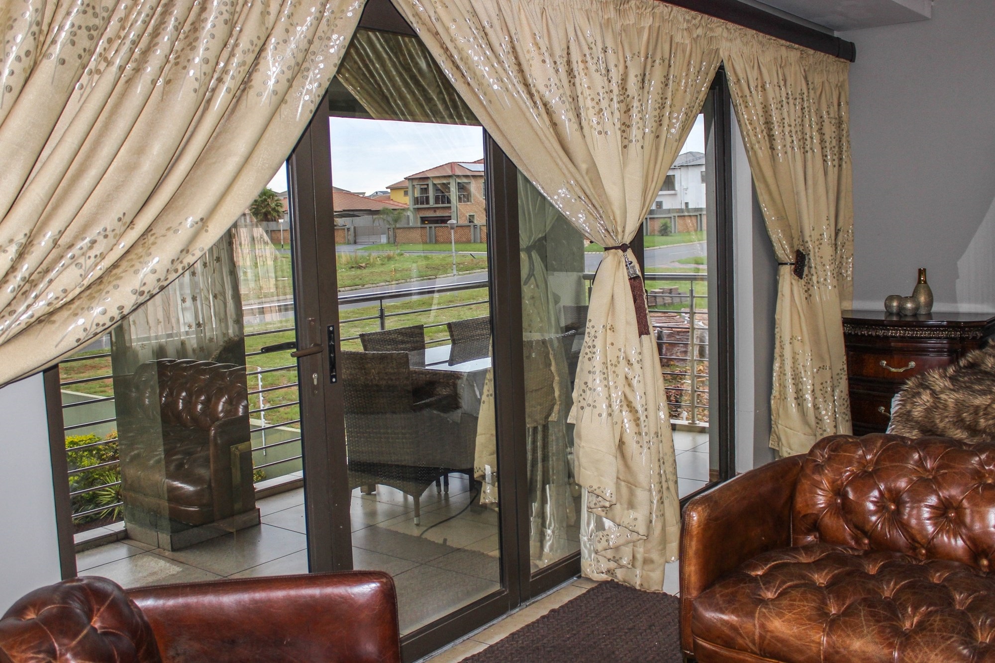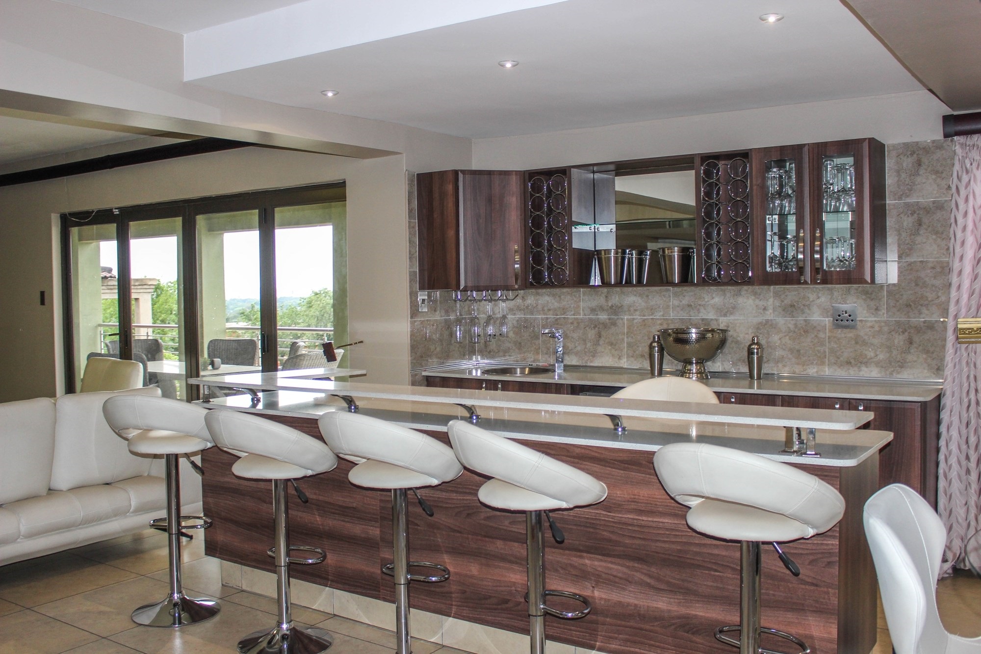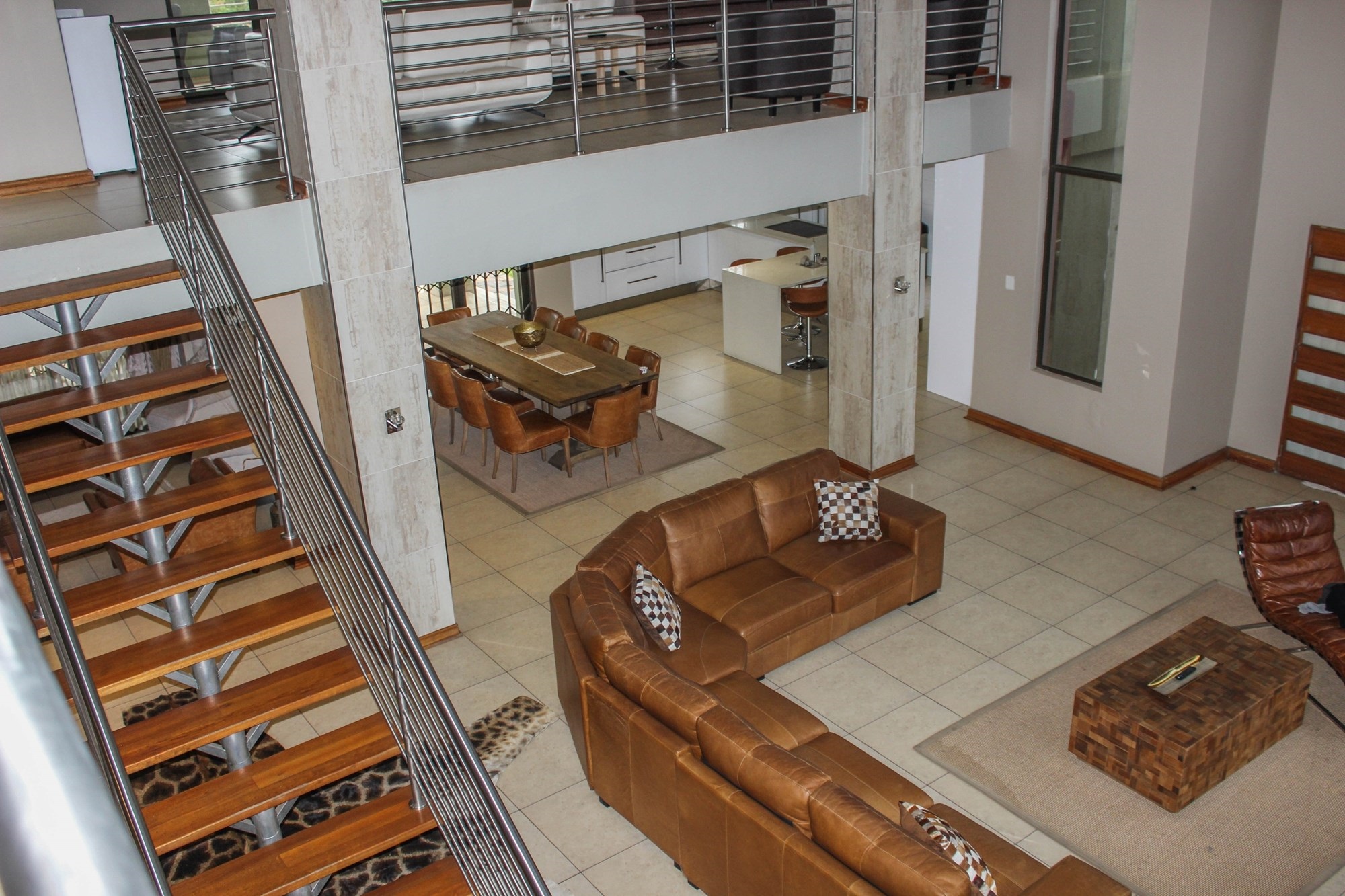 Upstairs continues to impress with a lavish open-plan entertainment lounge featuring a built-in bar, wine racks, Caesarstone counters, and balcony with built-in braai. A second lounge or kids’ playroom opens onto a private balcony. The luxurious main suite offers a walk-in closet, spa-style en-suite, and private balcony. Two additional bedrooms, a private study, and premium finishes complete the upstairs layout.