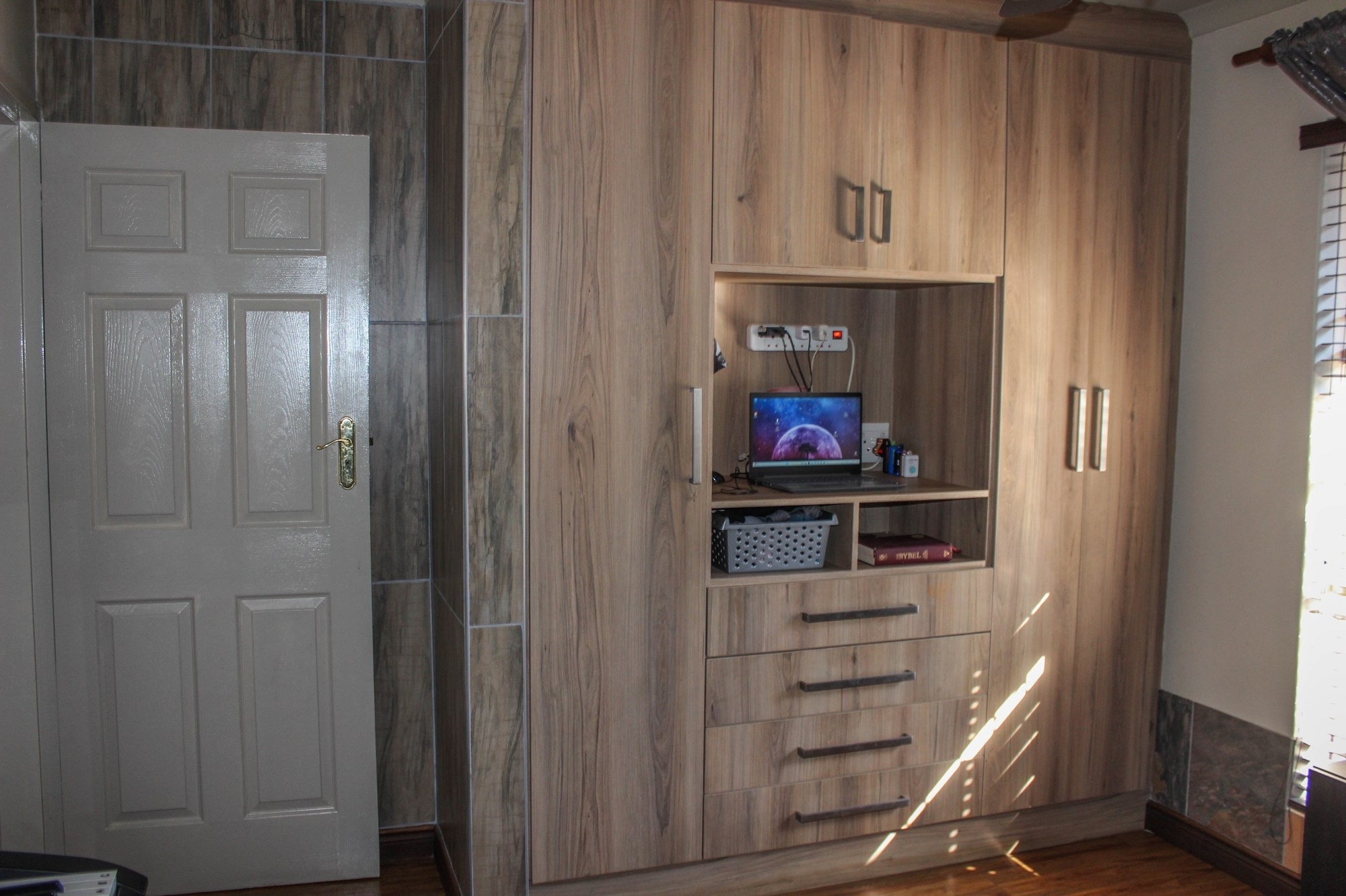 The home features three generously sized bedrooms, all equipped with laminated flooring, built-in cupboards, and their own air-conditioners to ensure year-round comfort. The main bedroom is a peaceful retreat with ample cupboard space and a private en-suite bathroom. The first and second bedrooms share a neat and functional family bathroom, designed with ease of use in mind.