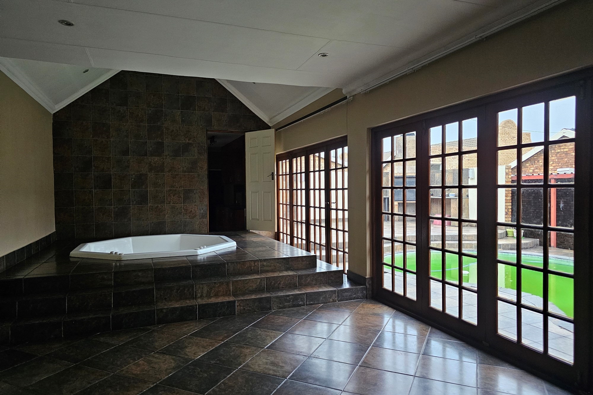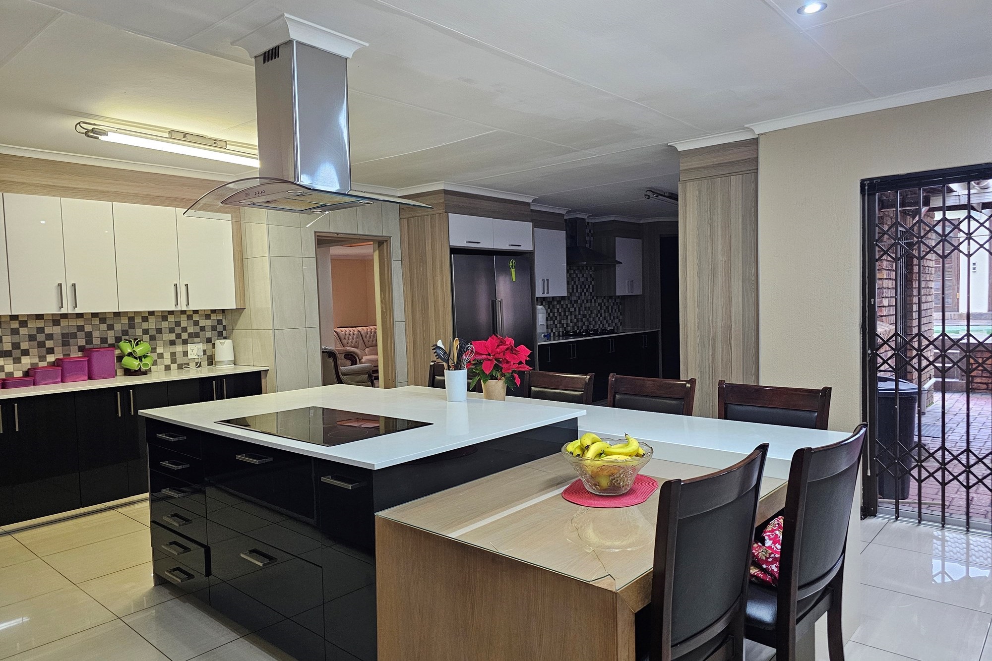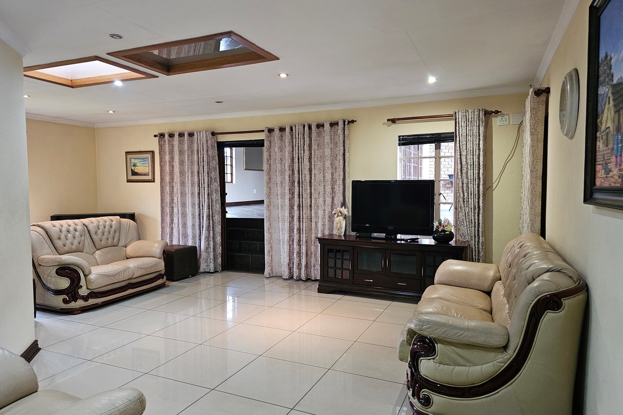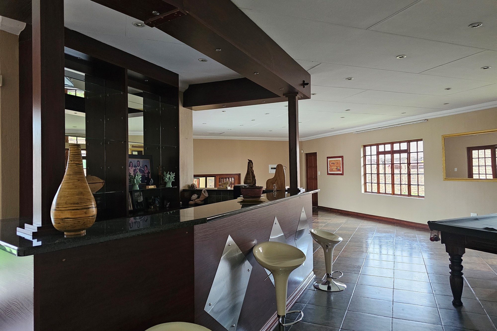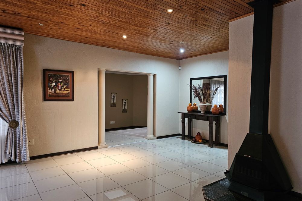 The five bedrooms, three featuring en-suite bathrooms, offer both comfort and privacy. The versatile fifth bedroom doubles as a study, catering to various lifestyle needs. The passage hosts a convenient linen cupboard, and the entertainment area is a focal point with a spacious built-in bar and a jacuzzi. Opening to a private heated pool, outdoor braai area, and shower, this space is an oasis for leisure. Additional amenities include a flatlet for visiting guests, a double garage, a carport for six vehicles, and a well-maintained garden with a Wendy house for garden equipment. Move-in ready, this residence invites you to embark on a new chapter of life in unparalleled style and comfort.