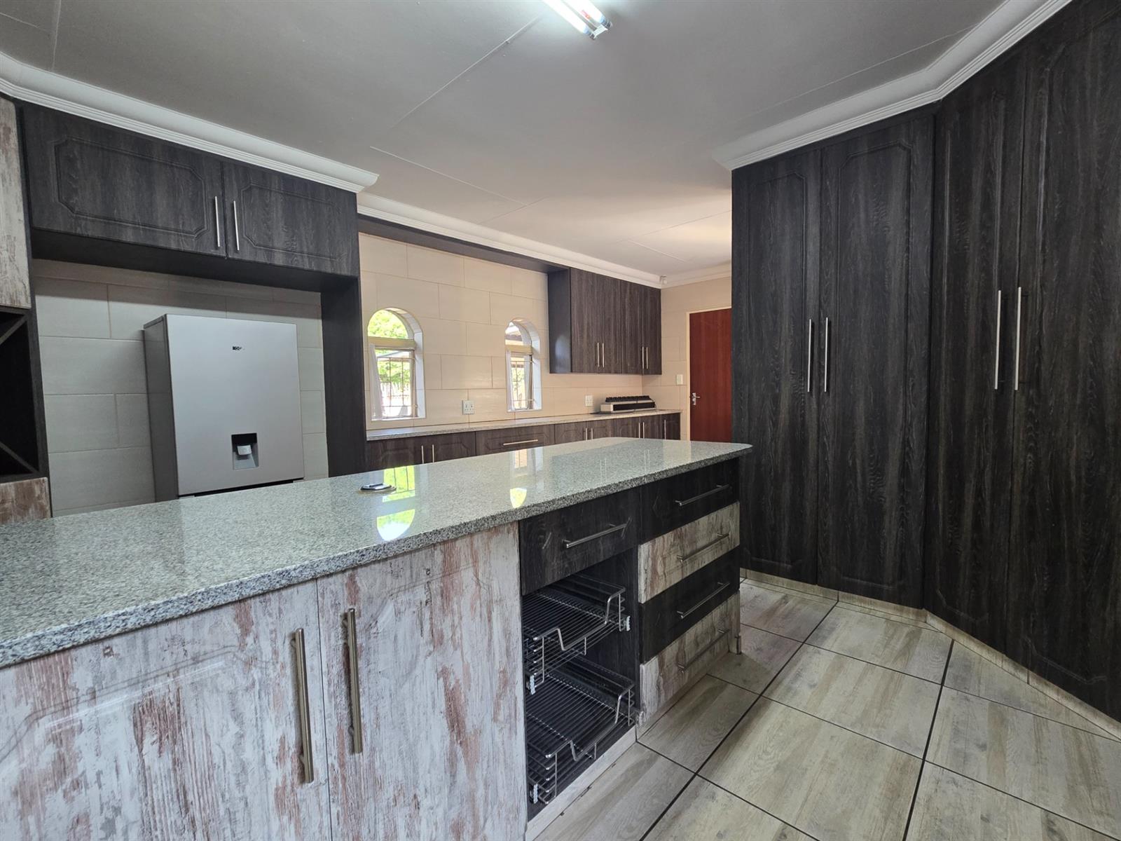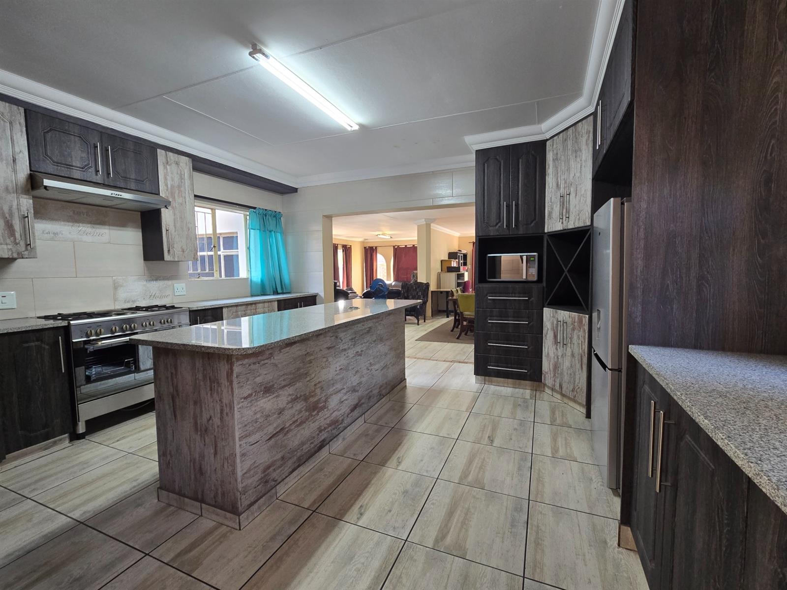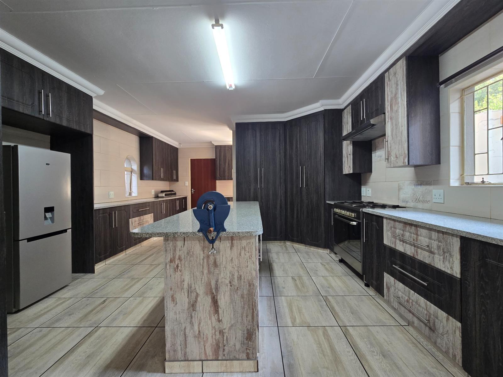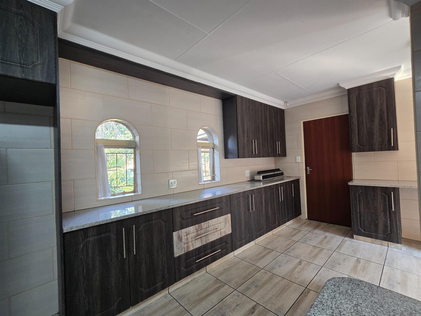 The modern kitchen blends seamlessly with the living space and is fitted with granite countertops, a gas stove, ample cupboard space, and a scullery for added convenience. To further ease daily living, a separate laundry room is located outside. Domestic quarters with their own bathroom are also available, providing comfort and privacy for live-in help or guests.