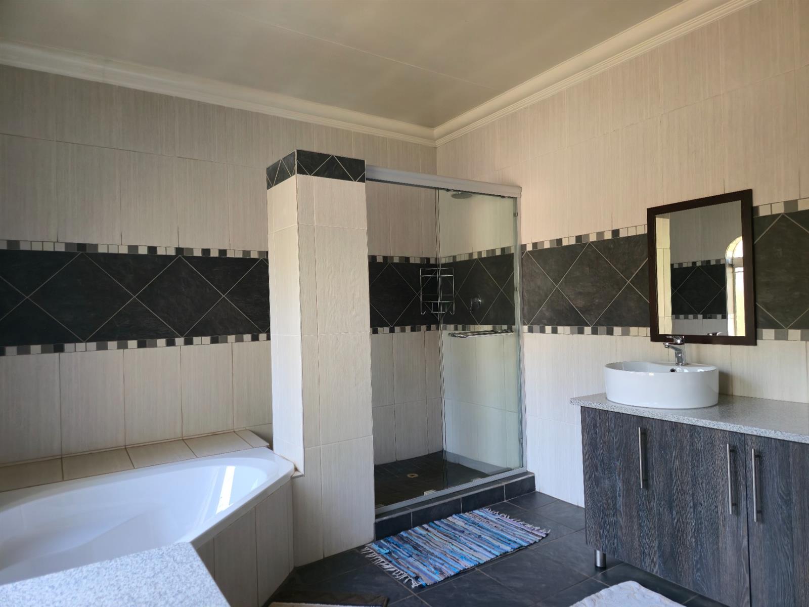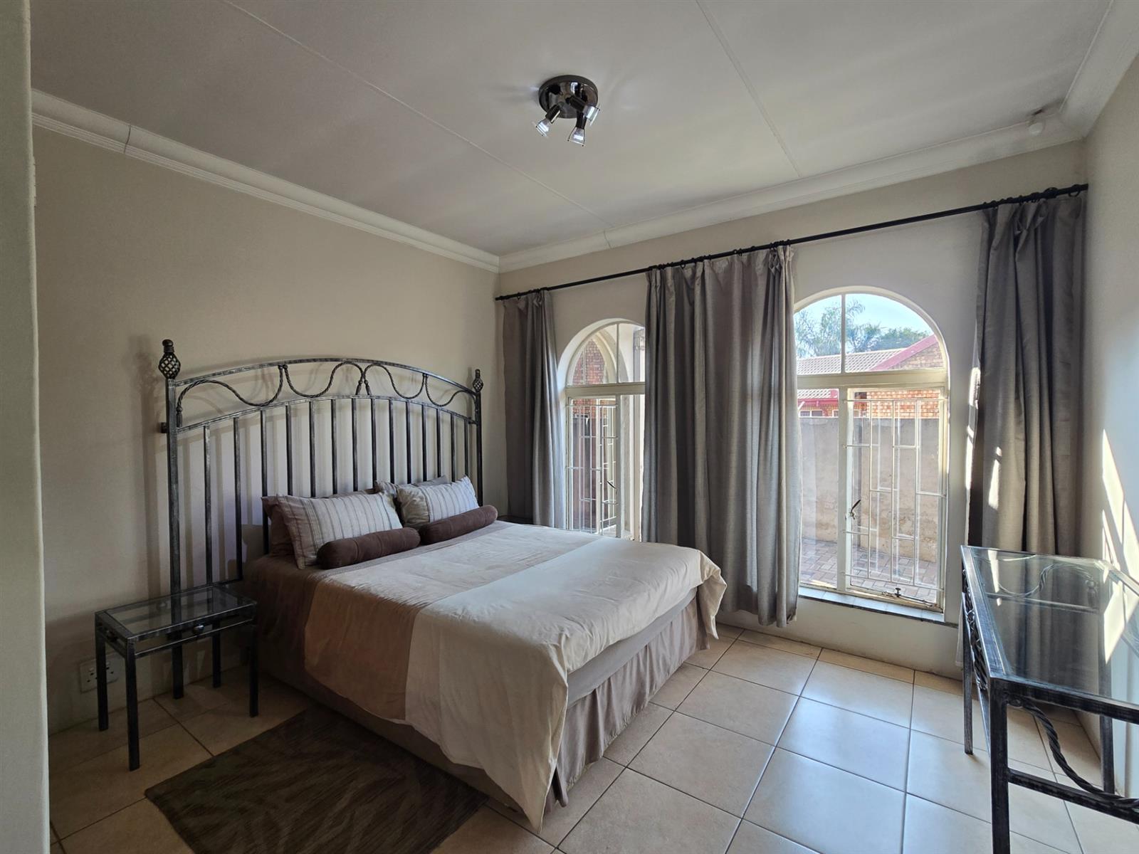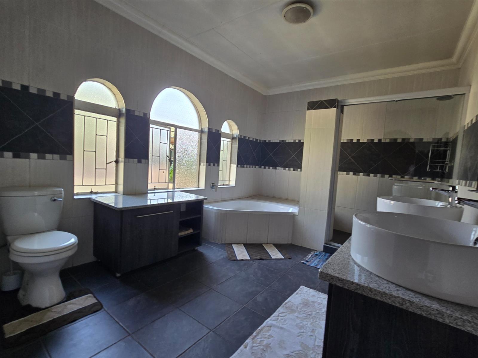 The home offers four bright and sunny bedrooms, each with built-in cupboards. A smaller fifth room can easily be used as a study, perfect for working from home. The main bedroom is a true retreat, boasting a walk-in closet and a full en-suite bathroom complete with a double vanity. Another full bathroom services the remaining bedrooms. The entire property is tiled throughout, ensuring easy maintenance and a clean, modern look.