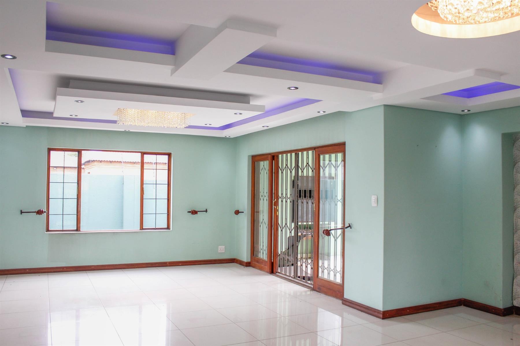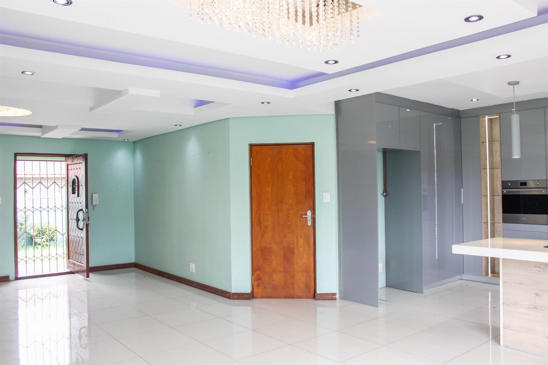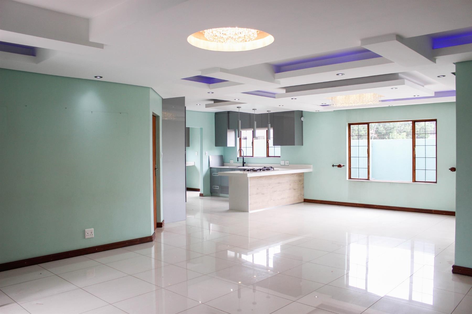Step through the inviting entrance patio and into an expansive open-plan living space, where sophistication meets modern design. The lounge, dining room, and kitchen flow seamlessly, highlighted by a stunning combination of tray and pop ceilings adorned with elegant chandeliers, downlights, and striking blue accent lighting.