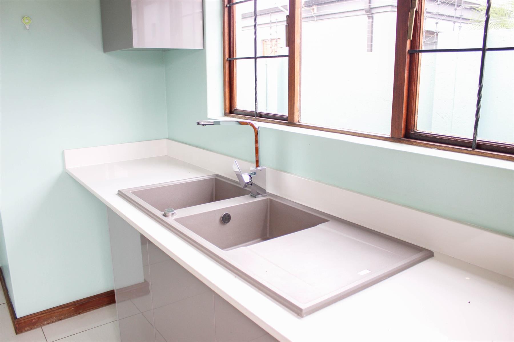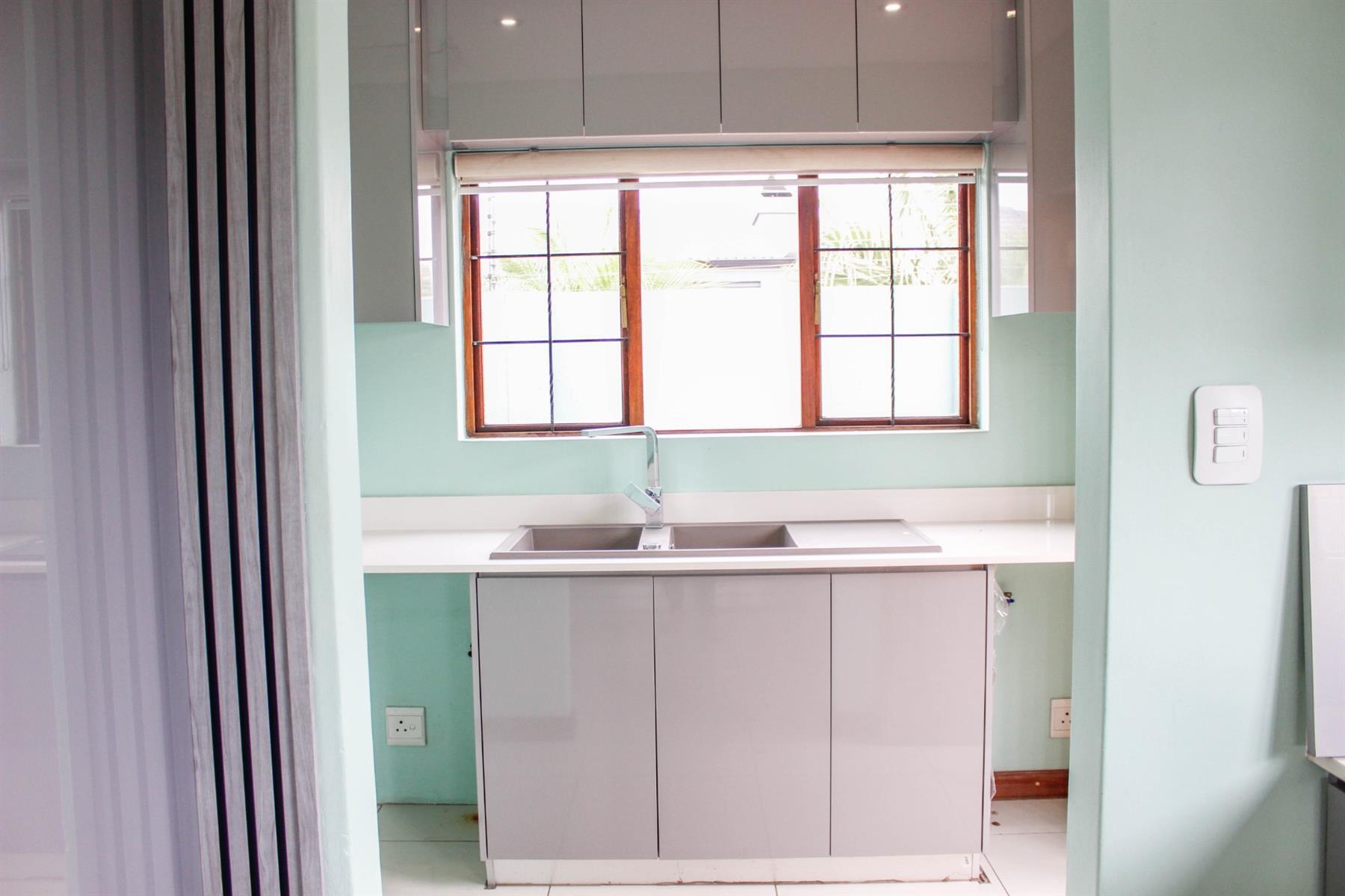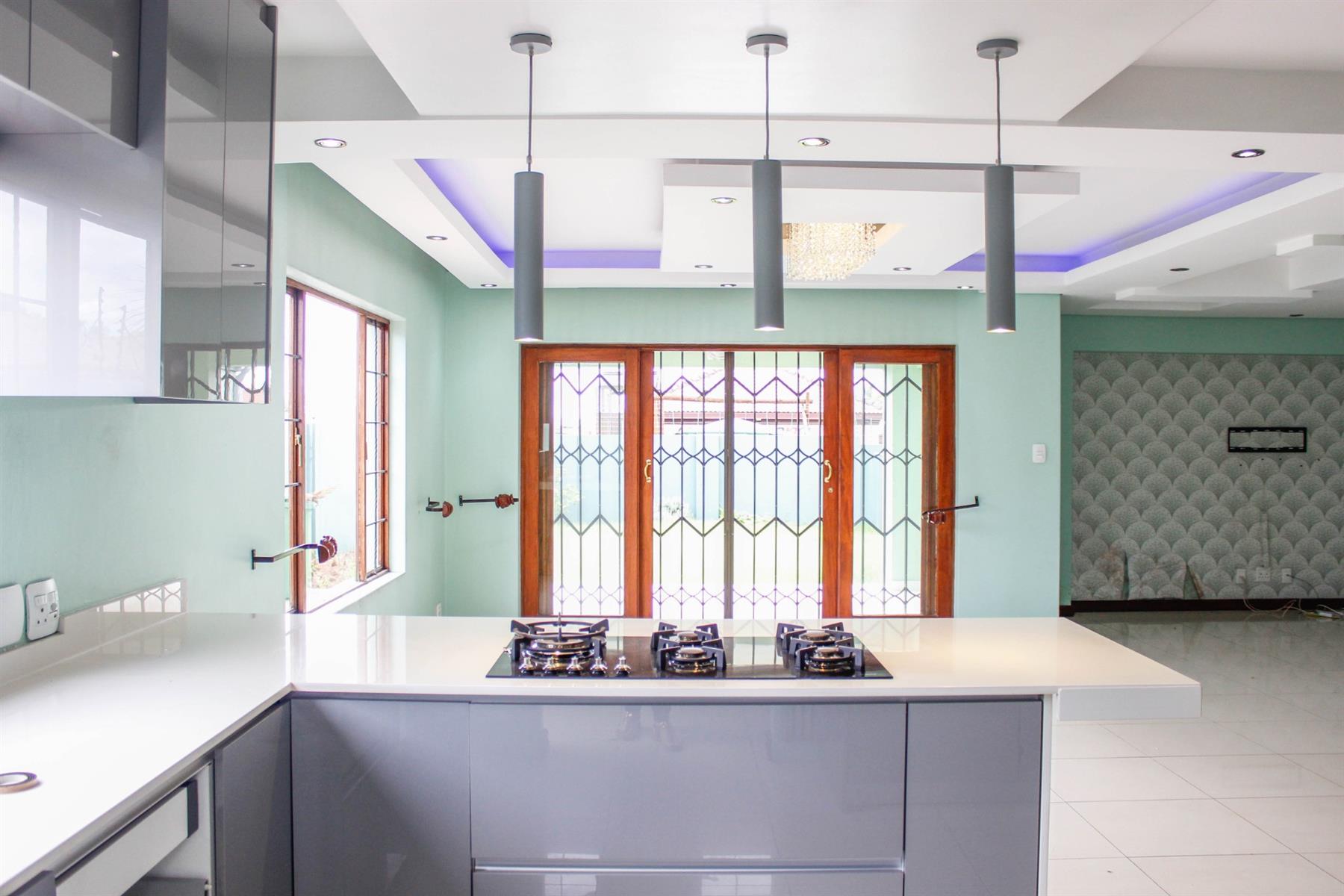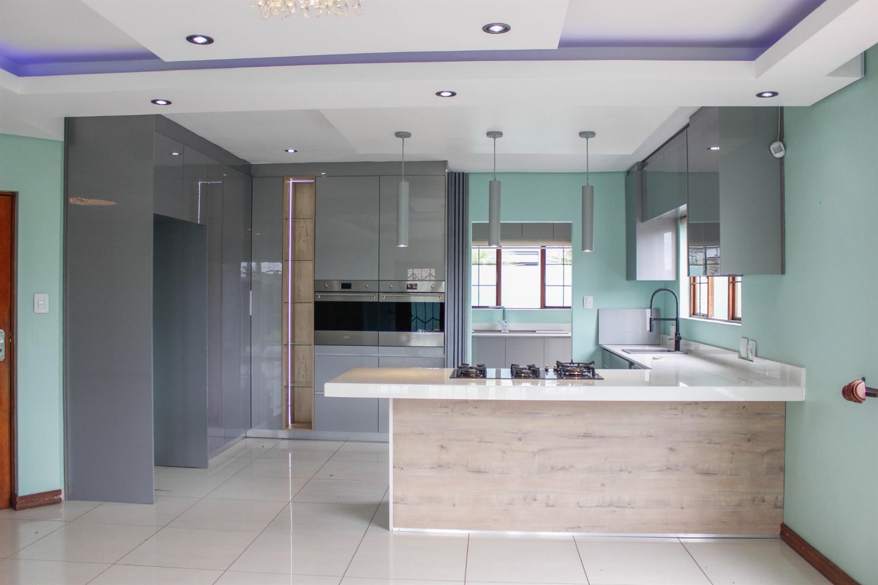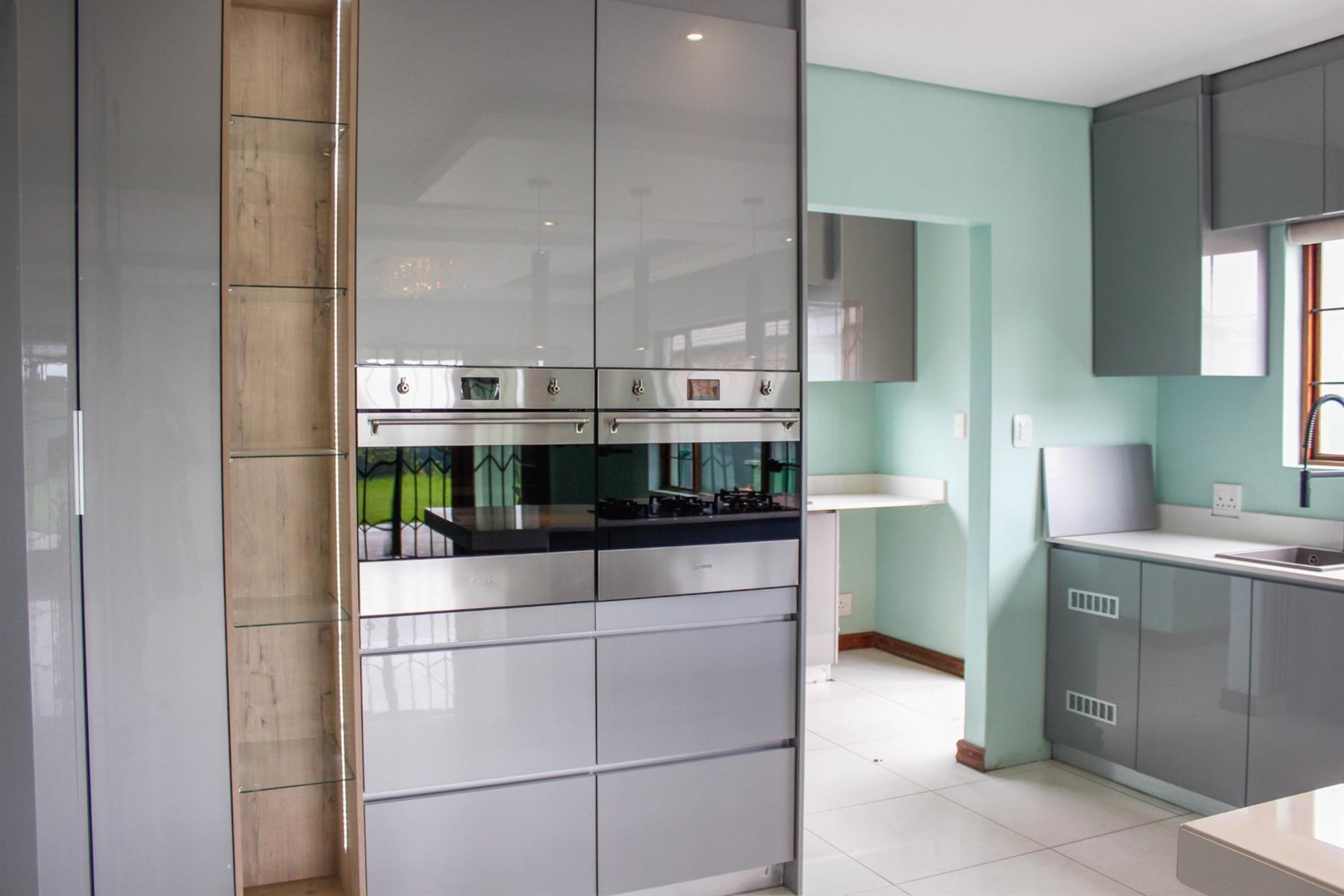 The designer kitchen is a true showstopper, featuring sleek grey high-gloss cabinetry, pristine white Caesarstone countertops, and a stylish breakfast nook. Equipped with a 5-plate gas stove, built-in Smeg microwave, and eye-level oven, this kitchen is a chef’s dream. A separate scullery and laundry room provide direct outdoor access for added convenience.
