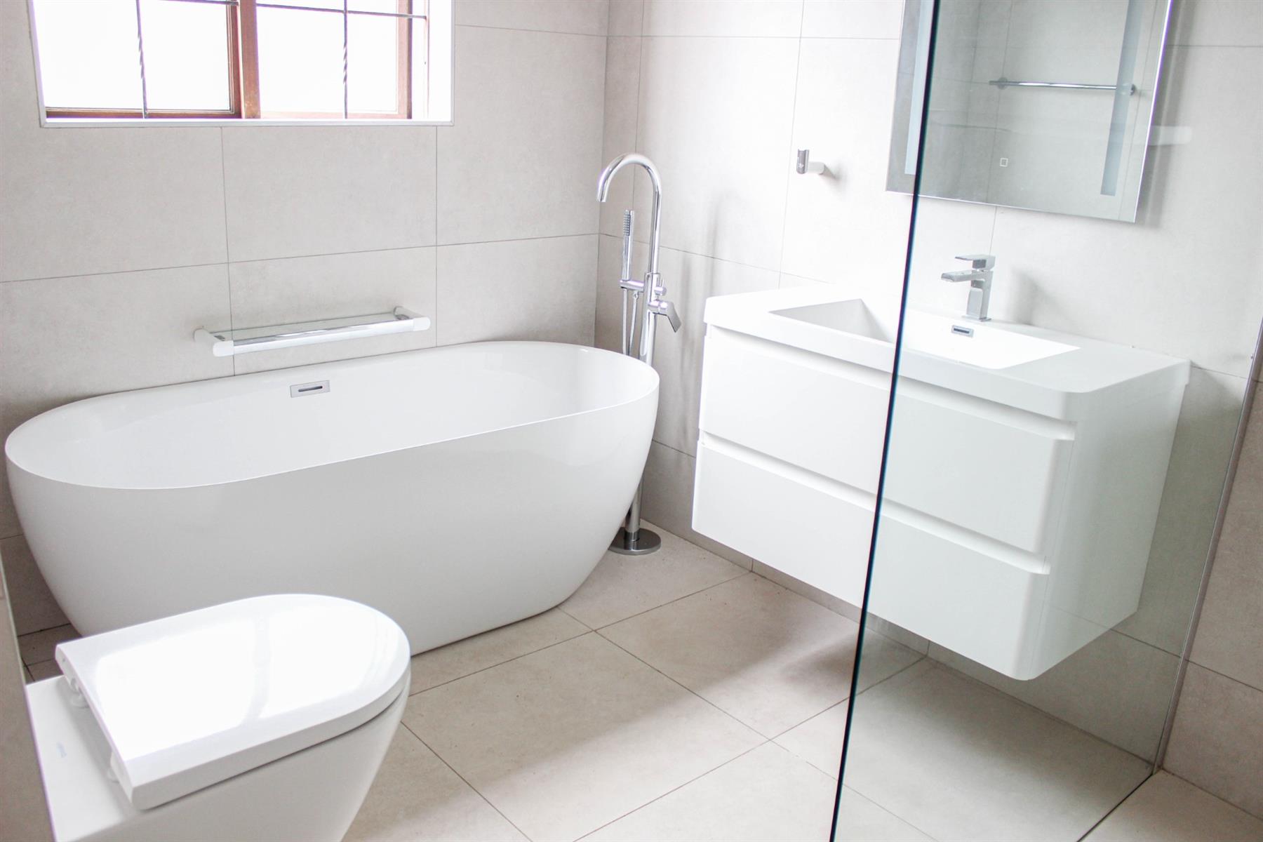 Two generously sized bedrooms share a chic full bathroom finished in timeless black and white, enhanced by leaf-accented tiles. A freestanding rectangular bath, floating cabinet with basin, shower, and toilet complete the space. The luxurious main suite boasts a walk-in closet and an opulent en-suite bathroom, finished in soft grey and white tones, featuring an oval freestanding bath, floating toilet, floating vanity, and a spacious walk-in shower.