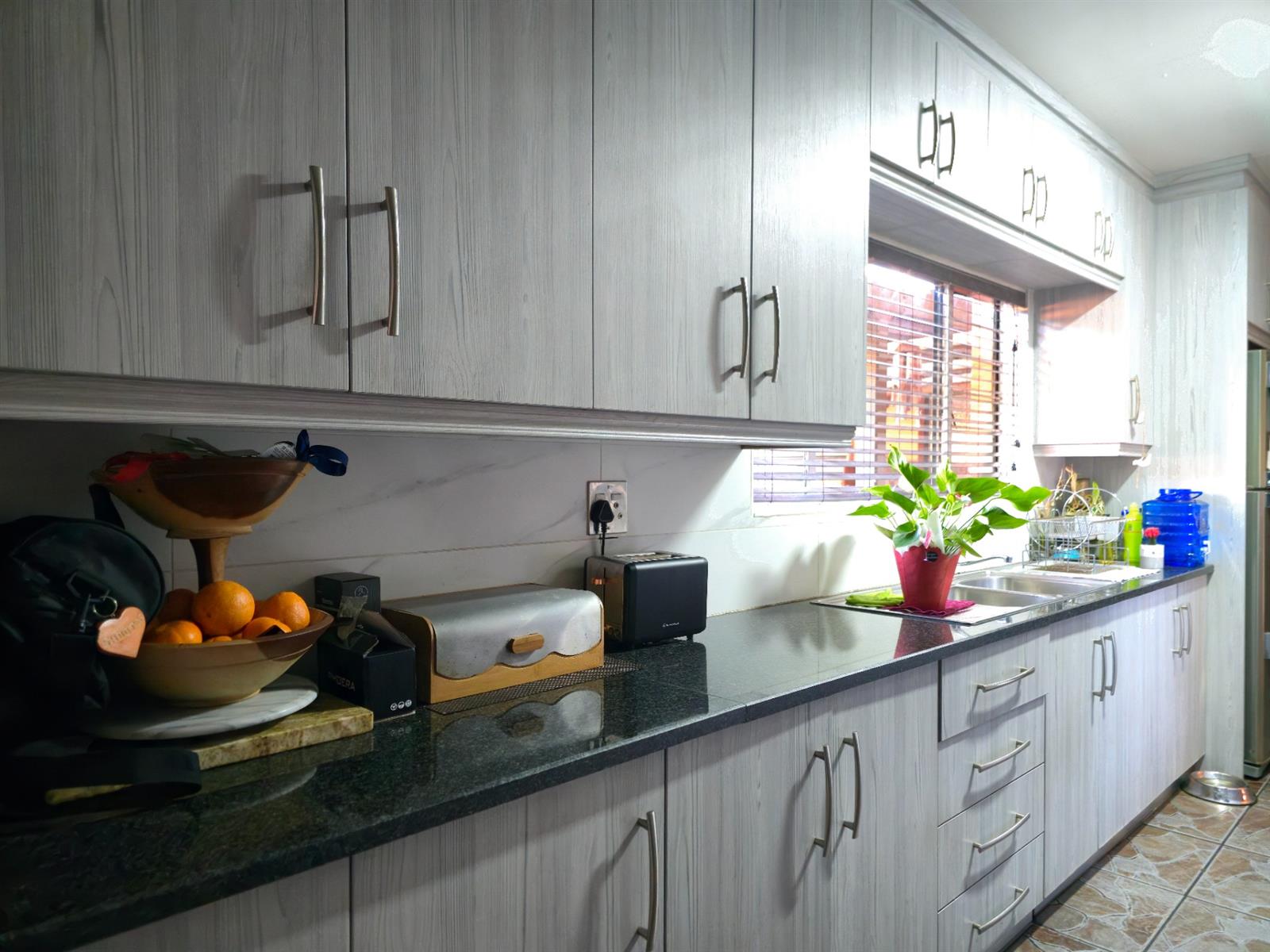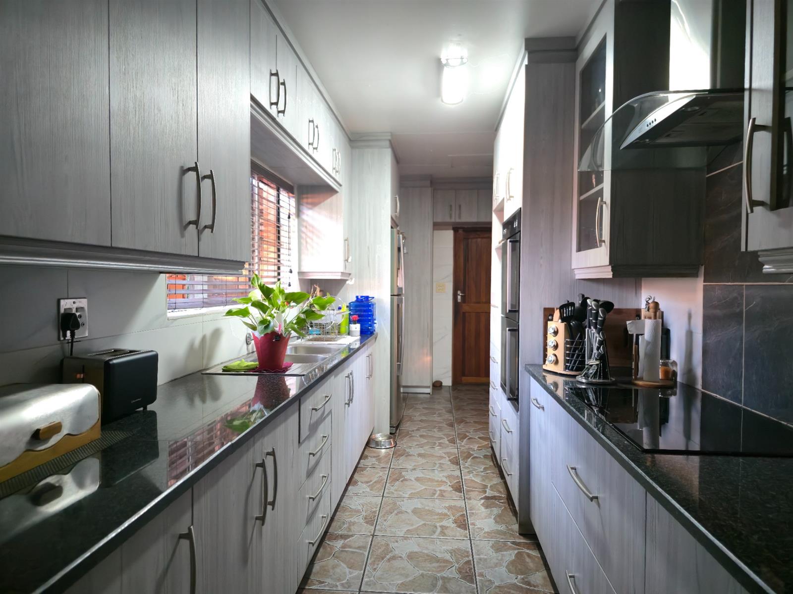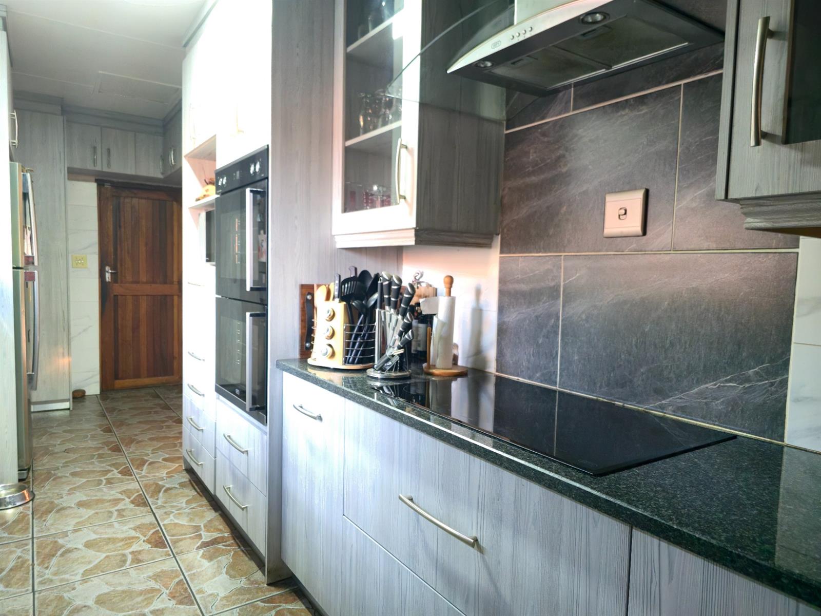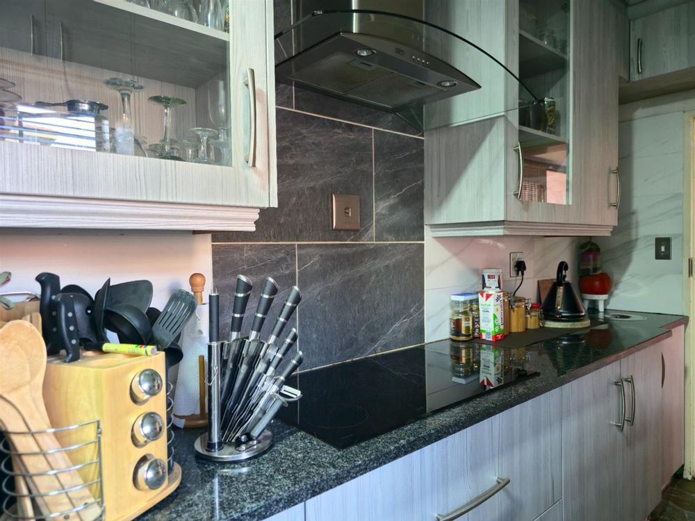Step into this inviting residence through a charming entrance portal that immediately sets the tone for a home filled with warmth, functionality, and space. To the left, the modern kitchen shines with light-toned cupboards, sleek granite countertops, a convenient prep bowl, glass hob, extractor fan, and double eye-level oven. A pantry cupboard ensures ample storage, while the scullery completes this practical yet stylish kitchen layout.