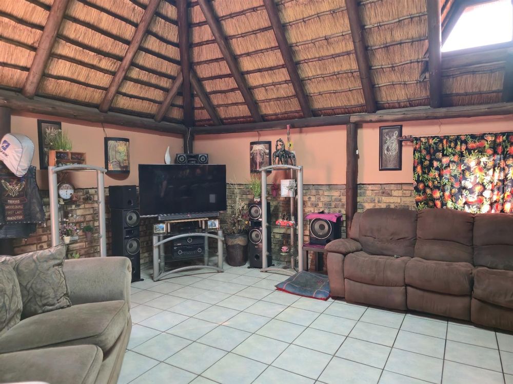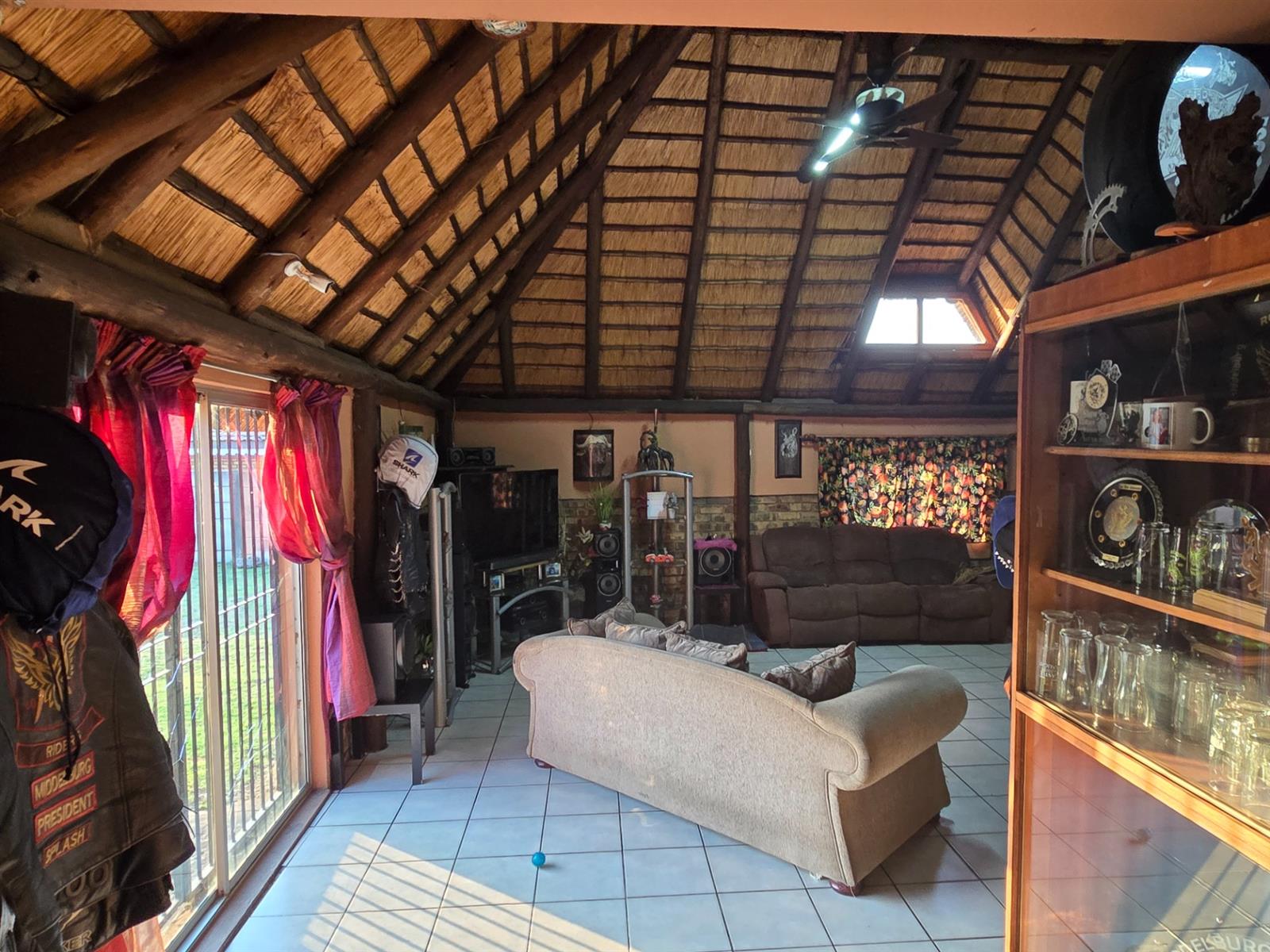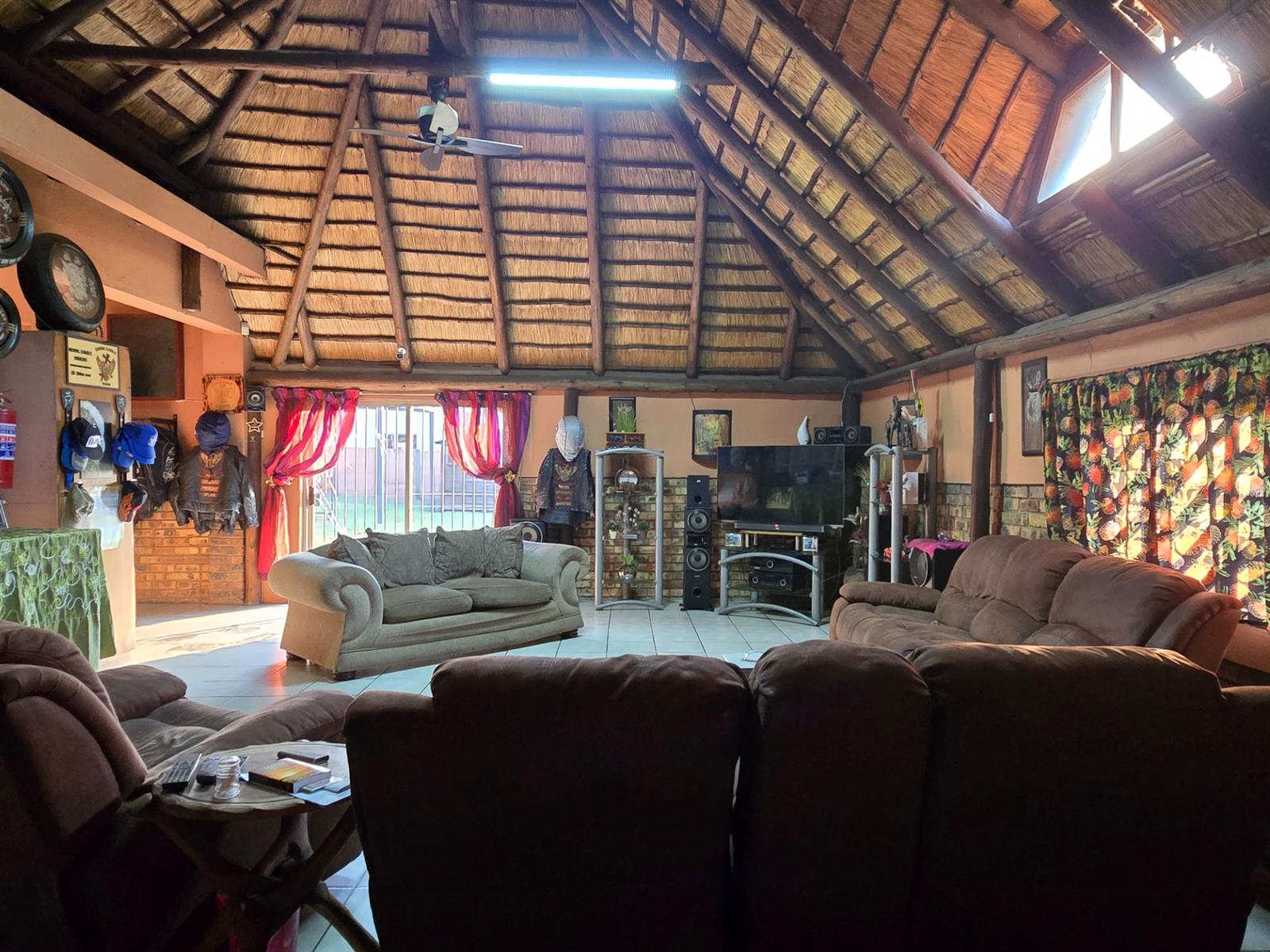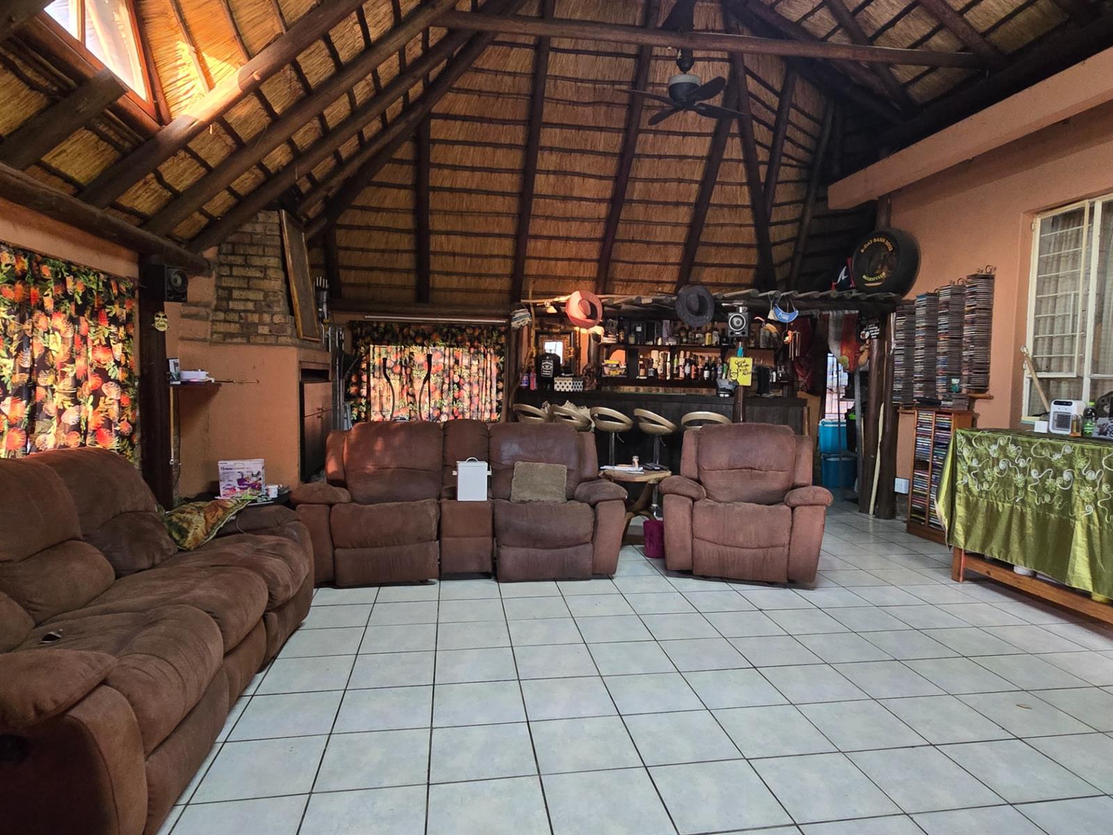 The dining room sits perfectly between the kitchen and the sunken lounge, creating a natural flow for both everyday living and hosting guests. The sunken lounge is open-plan to the entertainment area, where a built-in braai, bar, and thatched roof invite year-round gatherings. An additional storeroom next to the bar and sliding doors leading outdoors make entertaining effortless.