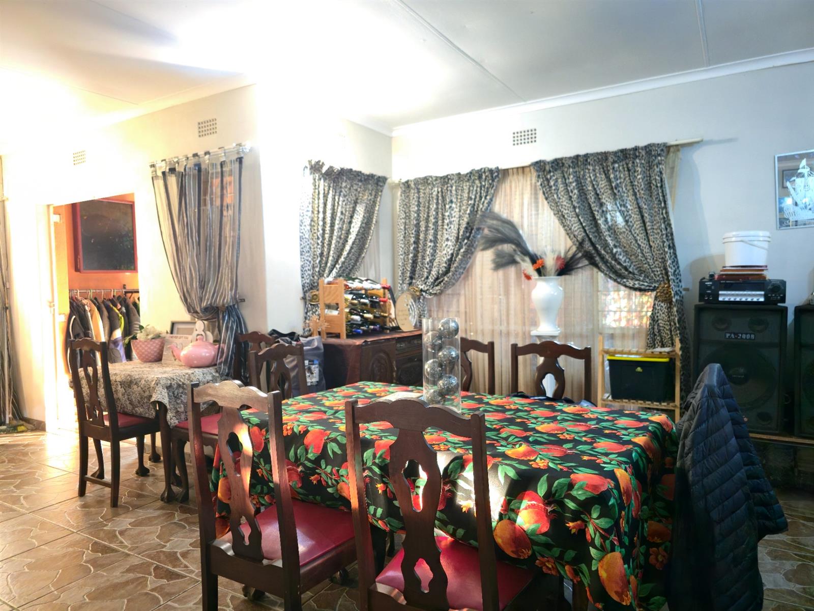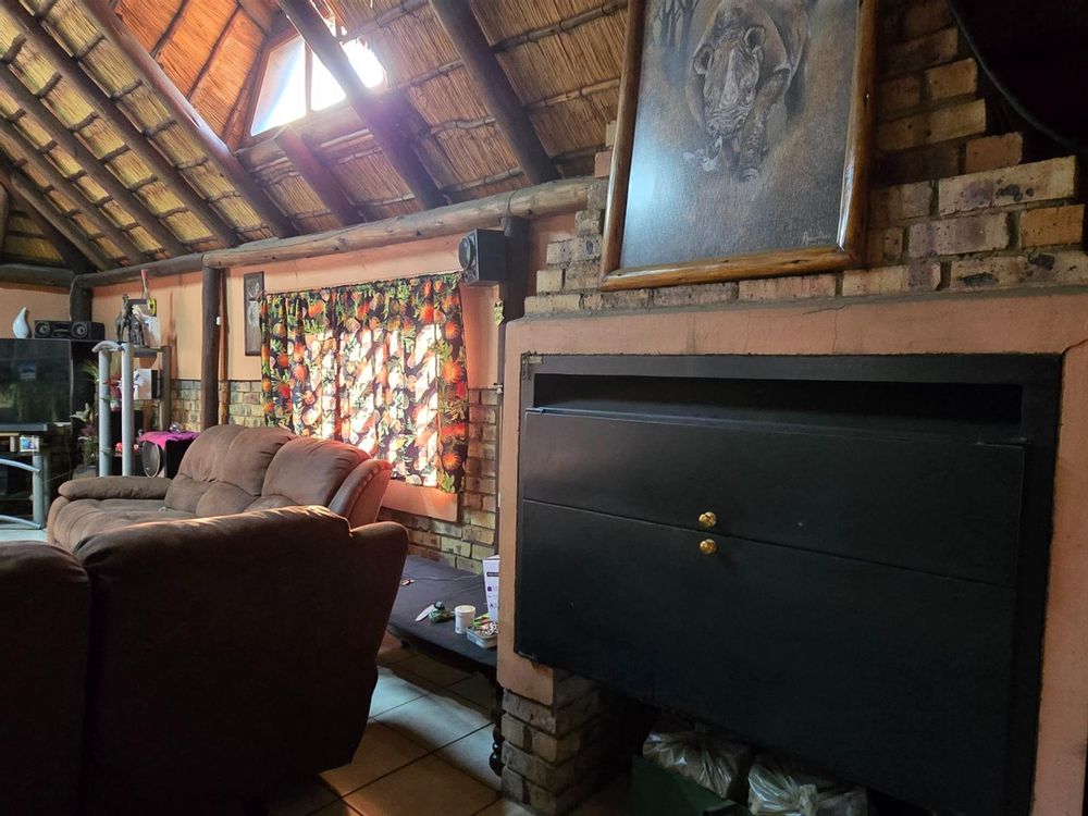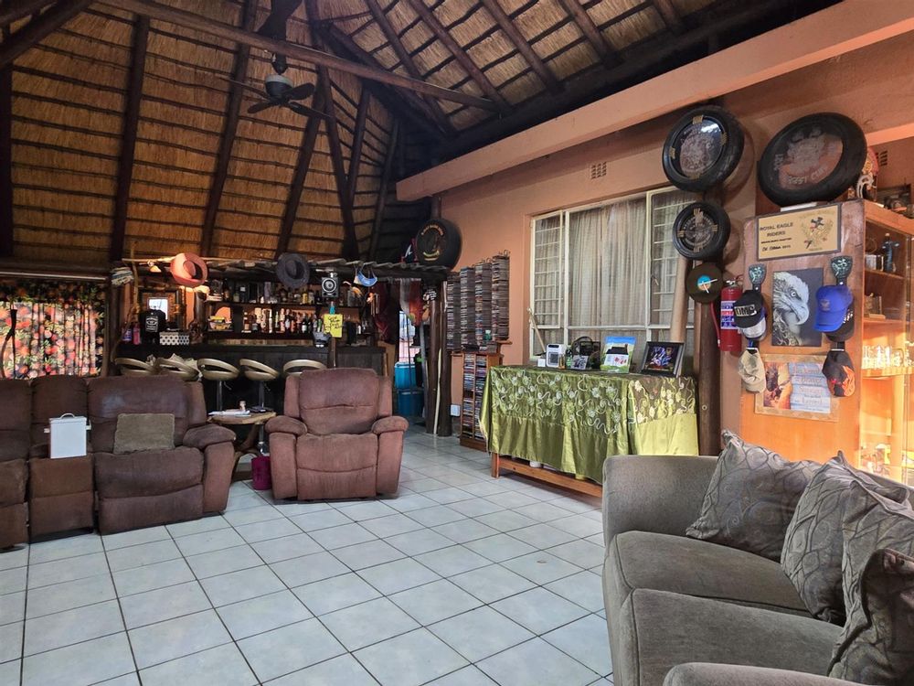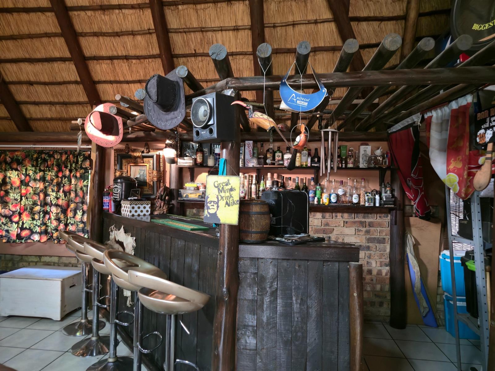 The dining room sits perfectly between the kitchen and the sunken lounge, creating a natural flow for both everyday living and hosting guests. The sunken lounge is open-plan to the entertainment area, where a built-in braai, bar, and thatched roof invite year-round gatherings. An additional storeroom next to the bar and sliding doors leading outdoors make entertaining effortless.
