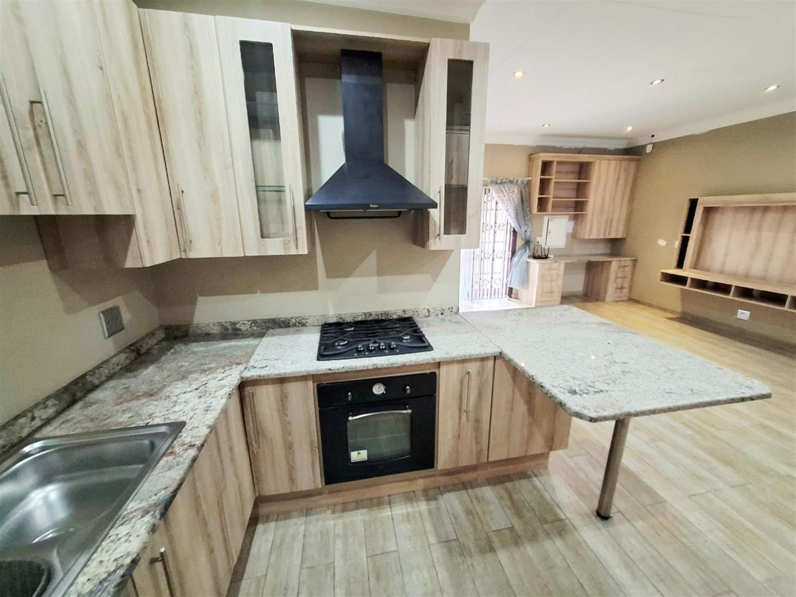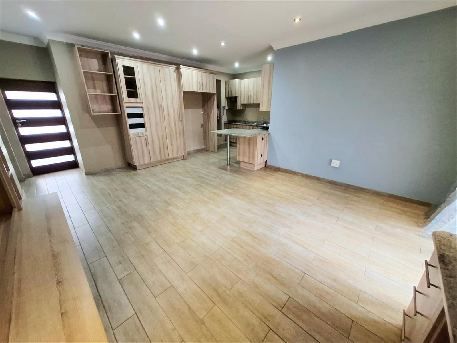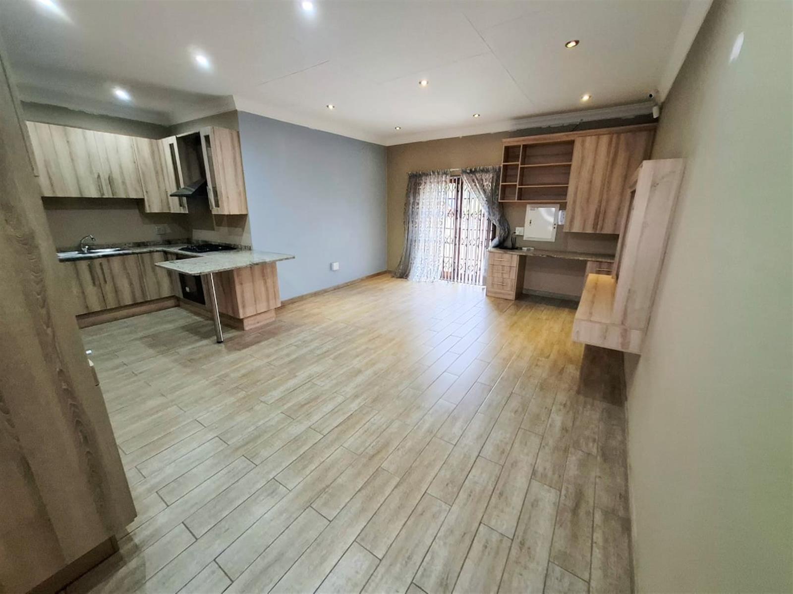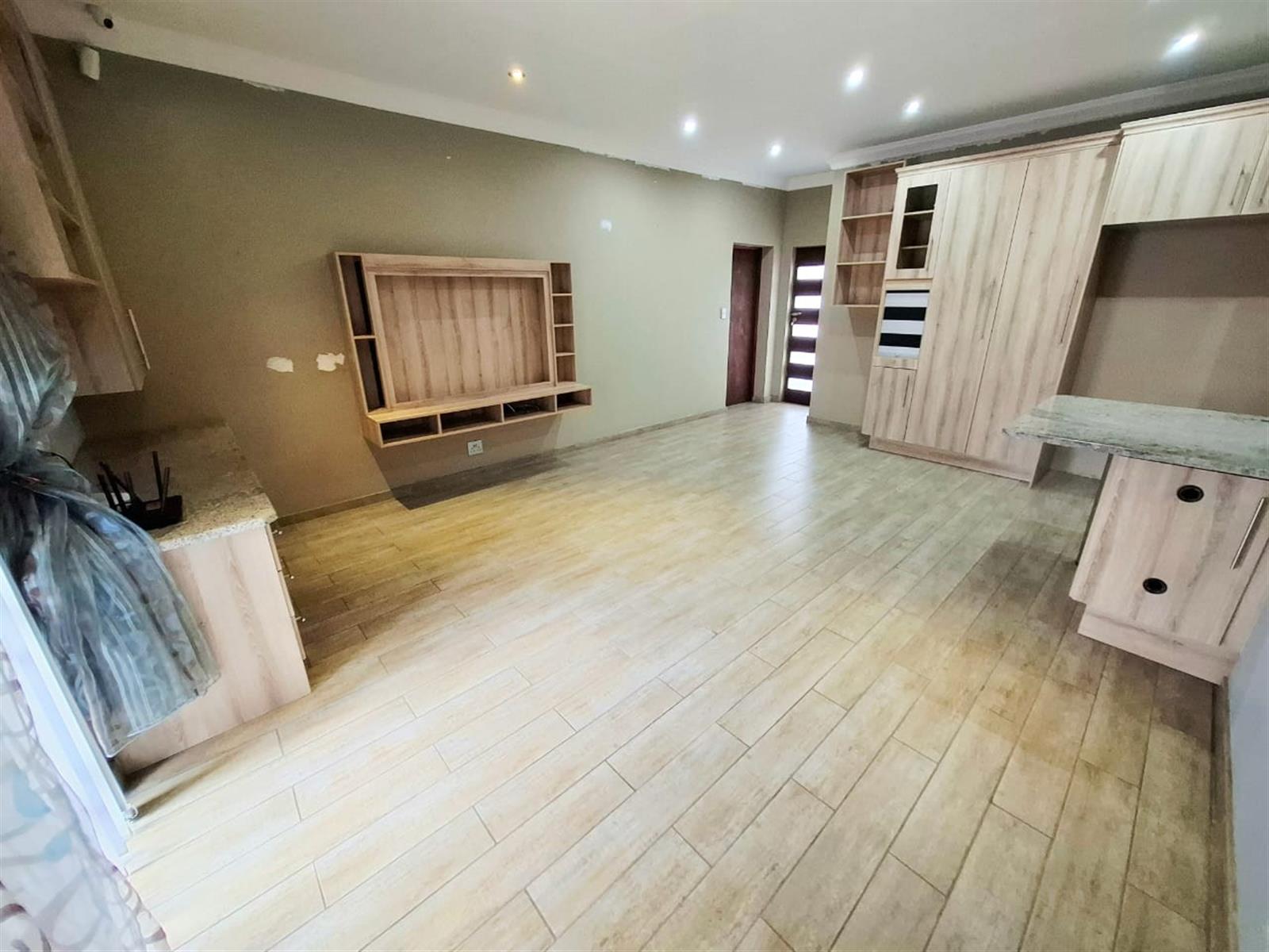 The flatlet, which may be connected to or separate from the main residence, is a self-contained living space designed with the same commitment to comfort and style. It offers an open-plan lounge and kitchen, fitted with light wood-look cupboards and marble countertops, creating a fresh and functional design. The bedroom includes double walk-in closets and sliding doors that open to the patio, welcoming natural light and outdoor flow. The bathroom, situated off the living area, features a shower and double vanities, ensuring both convenience and luxury. Perfect for guests, extended family, or live-in staff, this flat provides independence while maintaining harmony with the main home.